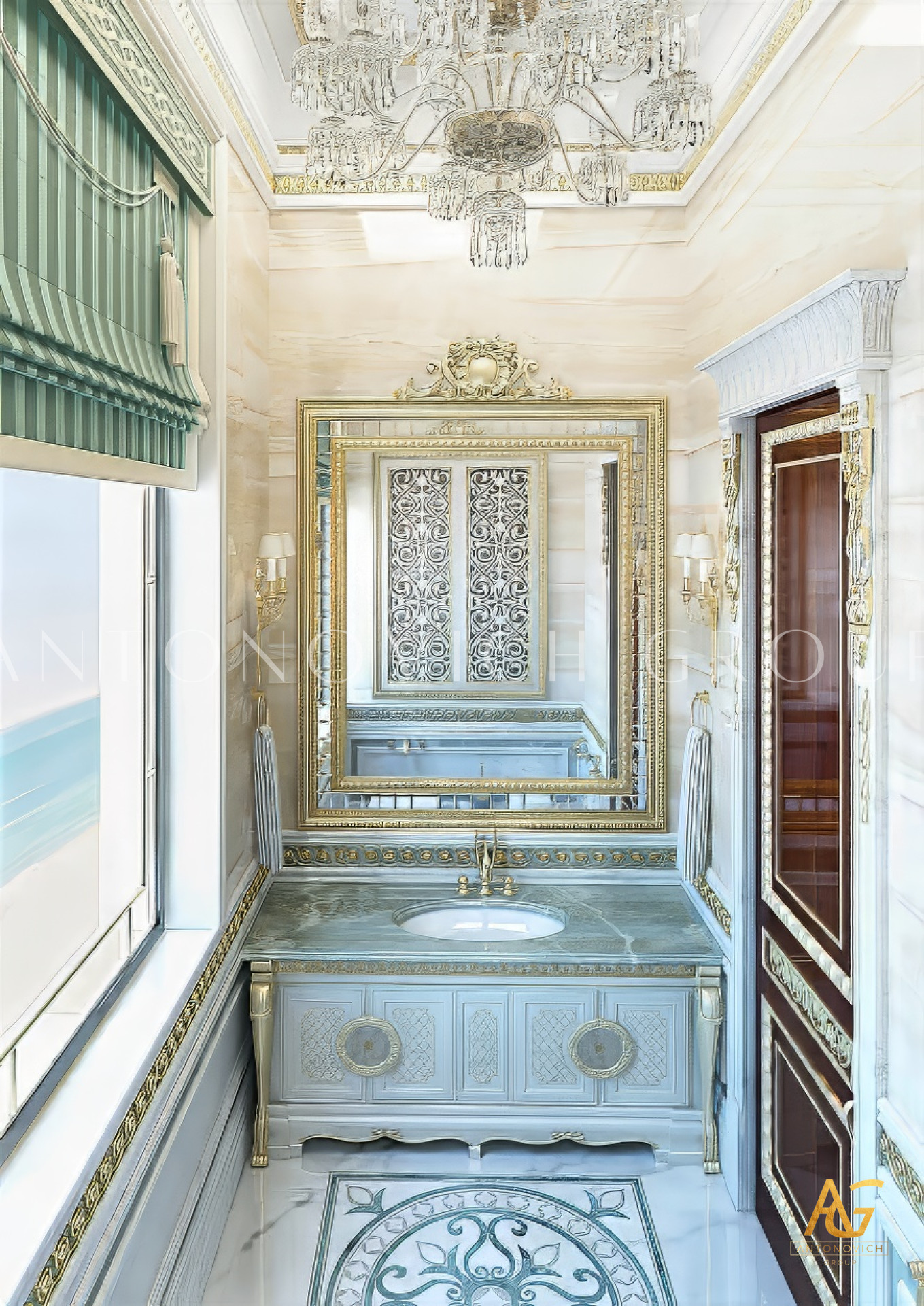 This luxury bathroom interior designs stunning color is one of a kind. Its difficult to find a suitable shade of brown and green these days, but Luxury Antonovich Design and its creative interior designers were able to create a lovely theme that is exactly intended to suit the needs of a wealthy lifestyle. The magnificent furniture is a part of the luxury and gorgeous bathroom interior design. The massive chandelier, lovely racks, and magnificent sink are just a few of the many high-quality elements of this luxurious bathroom interior design.