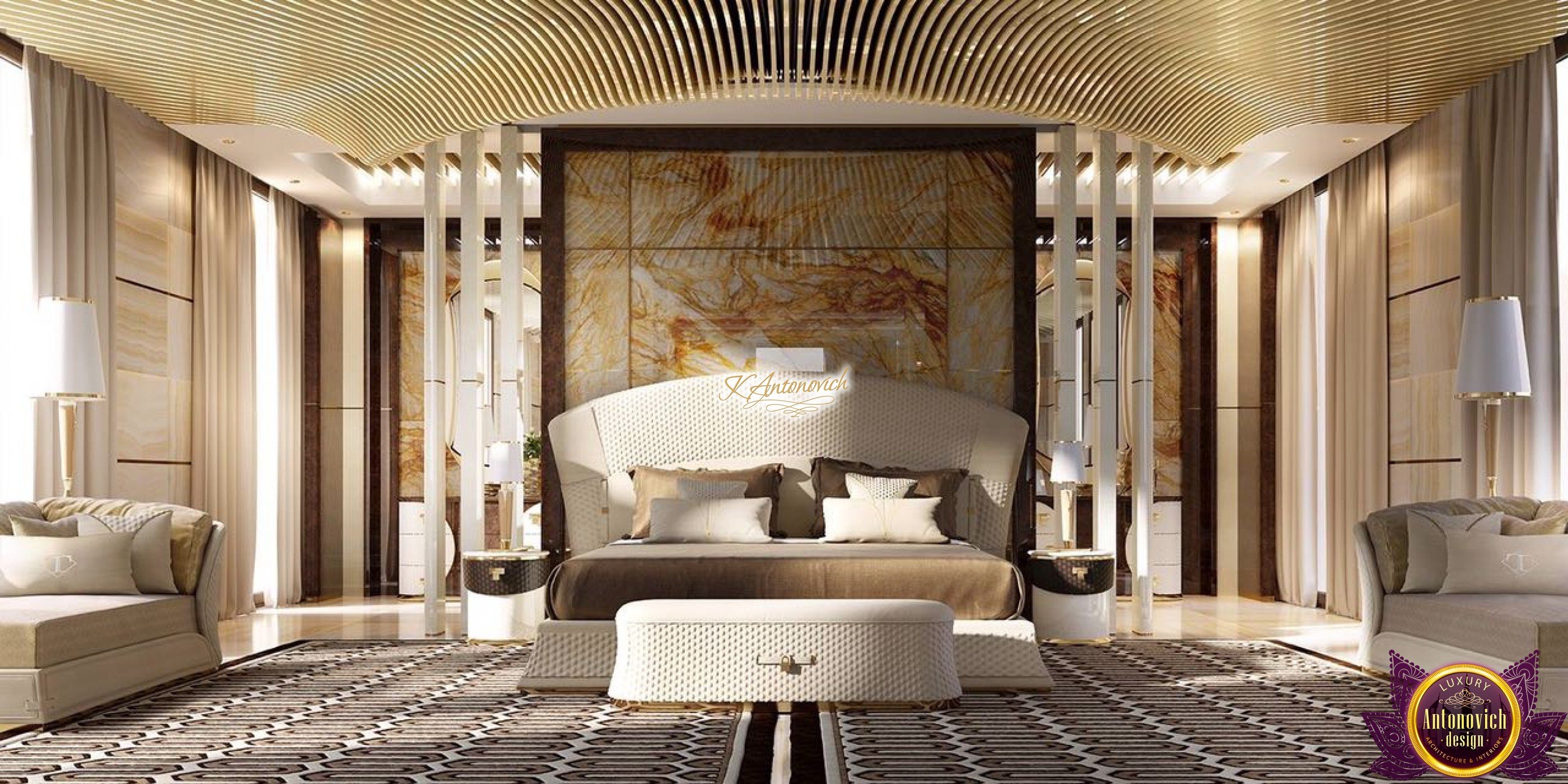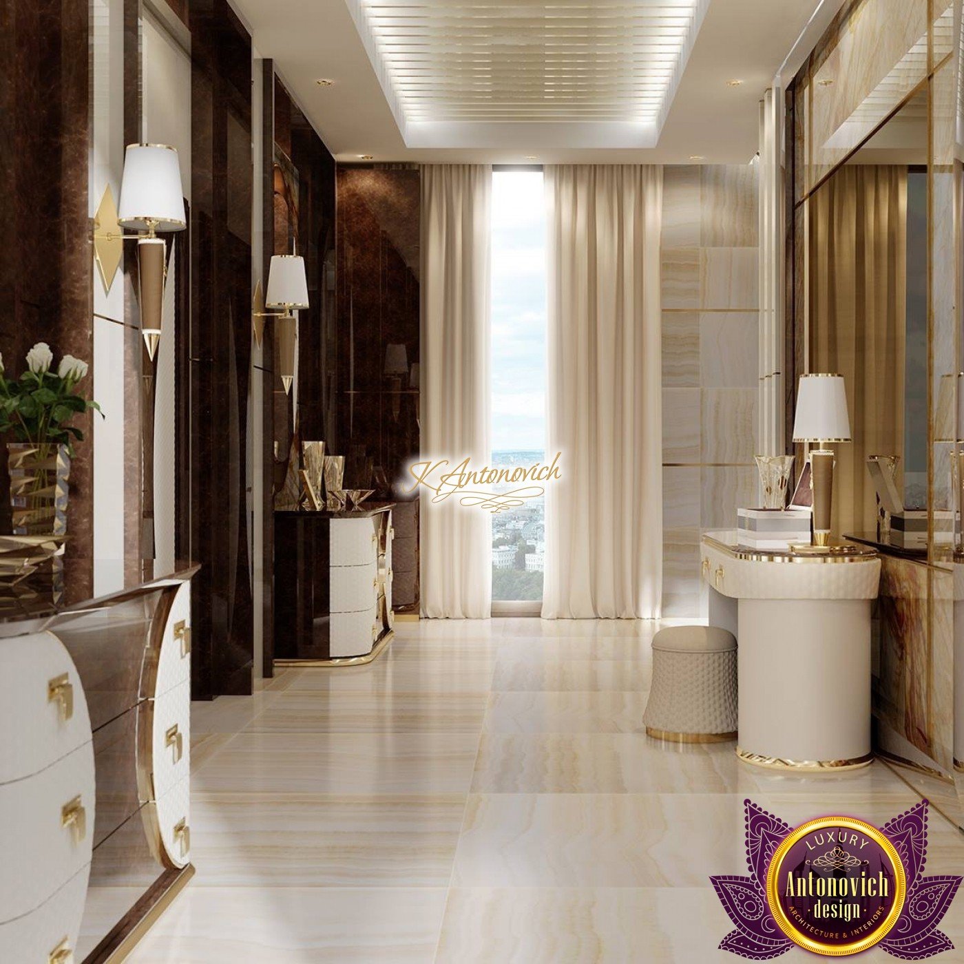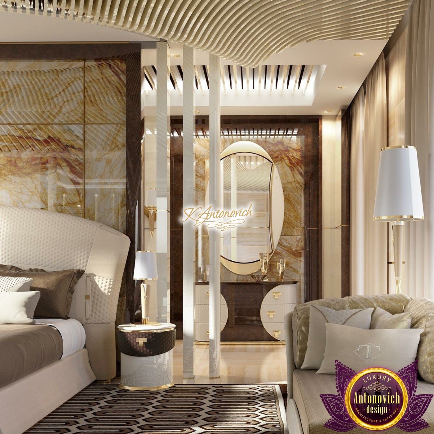 Ease of understanding of life, which is inherent to owners of the house, is reflected in the interior of the main bedroom. Top designers Interior designers of Luxury Antonovich Design Studio cleverly improvise with such styles as the minimalist and modern, each time creating unique images of the elite interiors 4 bedroom house design.This luxurious world for relaxation and comfortable rest. It would seem that some simplicity of the interior can simplify and downplay it respectability. But here we have quite opposite situation.Perfect selection of materials and exquisite details of exclusive walls decor give the master bedroom ideas a special charm of modern luxury.This is the feature of the interior, which is so necessary, in our dynamic and bustling life. The most restrained and concise look has the ceiling decor. Snow-white smooth surface of which is outlined by the line of LED backlight.The special design of the ceiling with two levels of niches gives an additional volume. In order to the interior was illuminated in full accordance with all rules and regulations, to the lines of backlighting, designers added stylish lamps and built-in ceiling lights. Curtains design in this 3 bedroom design continues motifs of style minimalism in the interior. Beautiful curtains of plain silk of muted shades of gray is gathered in the three bedroom flat design straight folds of drapery. The highlight of the interior decor of the bedroom became the original panel made of wood and mirrors, which are represented by the alternation of narrow vertical stripes. Décor panels in the interior usually perform not only decorative but also practical function. So, in this room decor panel made of wood, on which is fixed plasma panel, is also an excellent soundproofing.