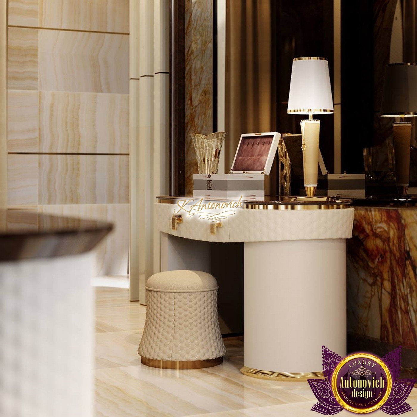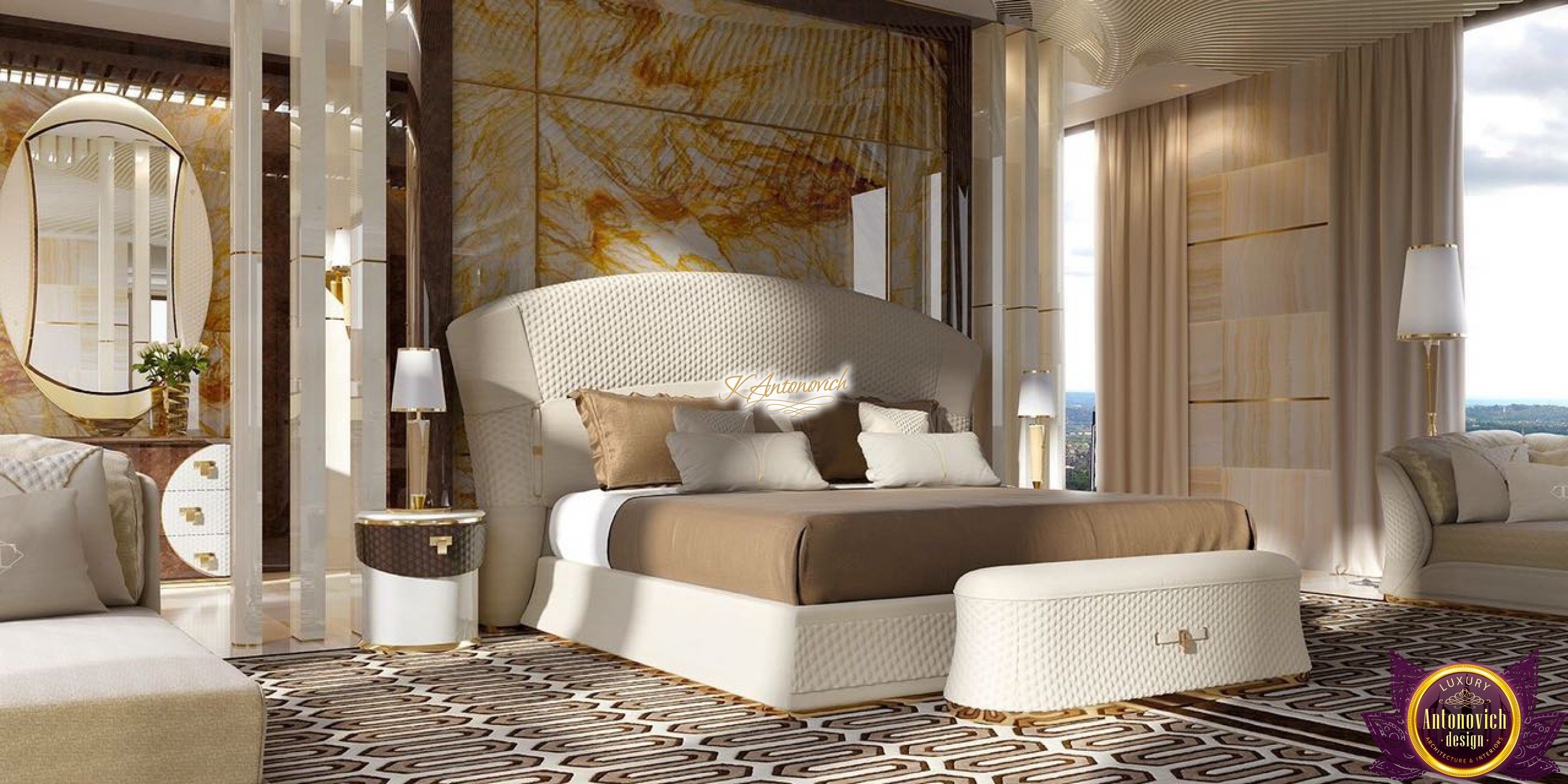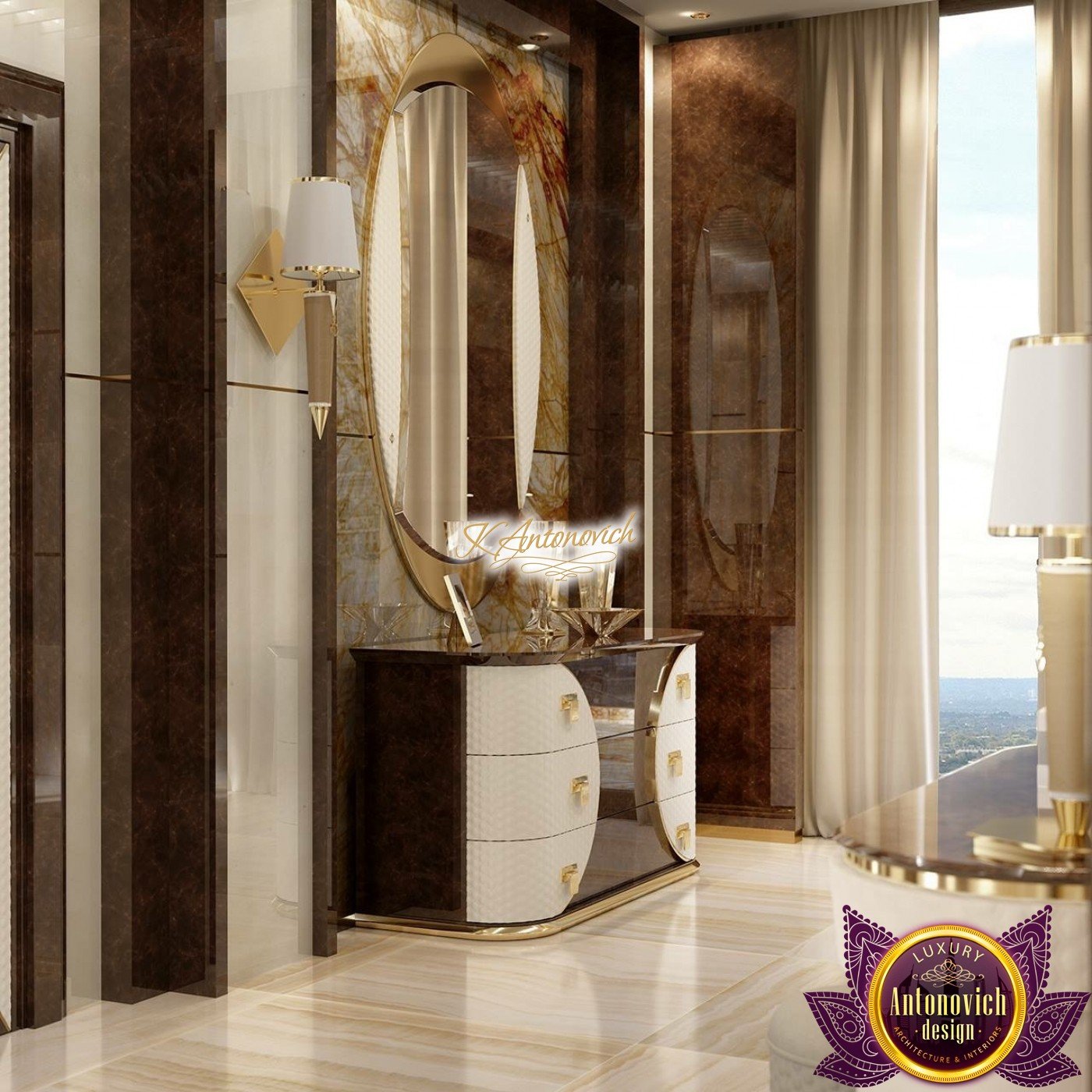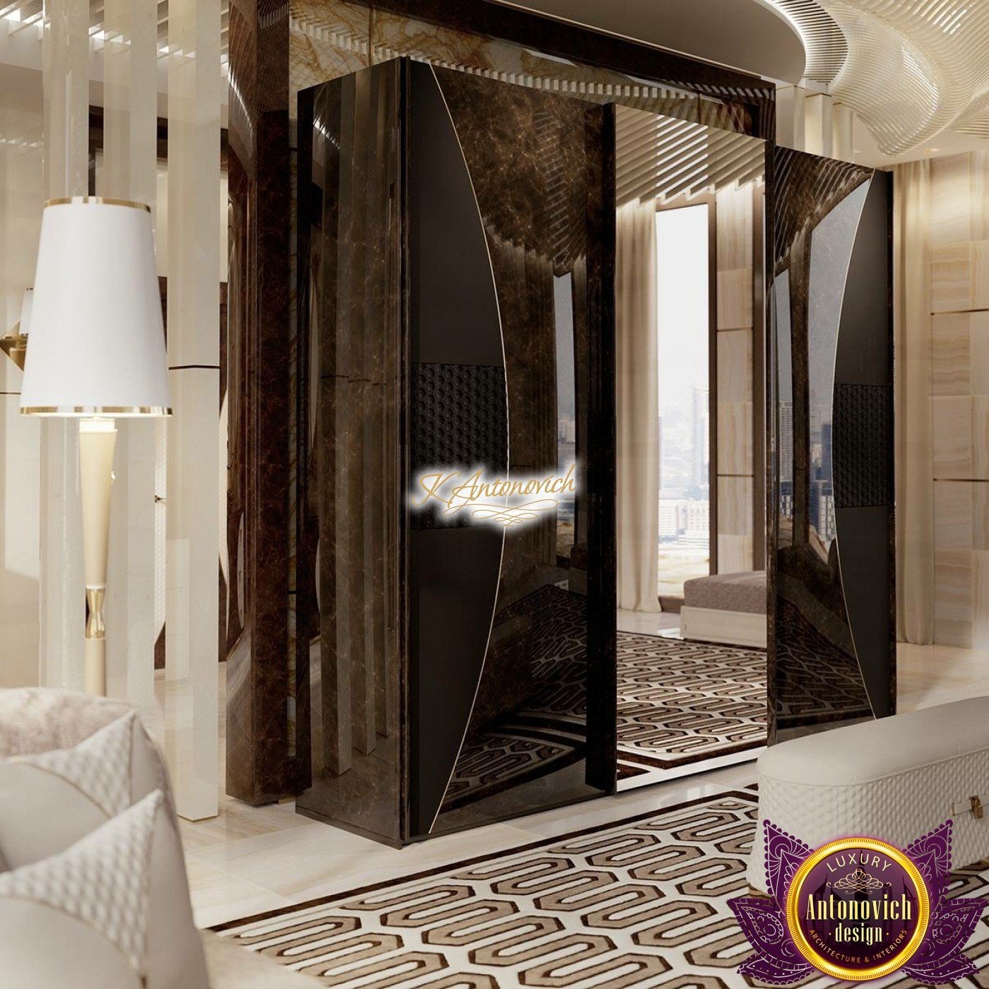 Ease of understanding of life, which is inherent to owners of the house, is reflected in the interior of the main bedroom. Top designers Interior designers of Luxury Antonovich Design Studio cleverly improvise with such styles as the minimalist and modern, each time creating unique images of the elite interiors 4 bedroom house design.This luxurious world for relaxation and comfortable rest. It would seem that some simplicity of the interior can simplify and downplay it respectability. But here we have quite opposite situation.Perfect selection of materials and exquisite details of exclusive walls decor give the master bedroom ideas a special charm of modern luxury.This is the feature of the interior, which is so necessary, in our dynamic and bustling life. The most restrained and concise look has the ceiling decor. Snow-white smooth surface of which is outlined by the line of LED backlight.The special design of the ceiling with two levels of niches gives an additional volume. In order to the interior was illuminated in full accordance with all rules and regulations, to the lines of backlighting, designers added stylish lamps and built-in ceiling lights. Curtains design in this 3 bedroom design continues motifs of style minimalism in the interior. Beautiful curtains of plain silk of muted shades of gray is gathered in the three bedroom flat design straight folds of drapery. The highlight of the interior decor of the bedroom became the original panel made of wood and mirrors, which are represented by the alternation of narrow vertical stripes. Décor panels in the interior usually perform not only decorative but also practical function. So, in this room decor panel made of wood, on which is fixed plasma panel, is also an excellent soundproofing.