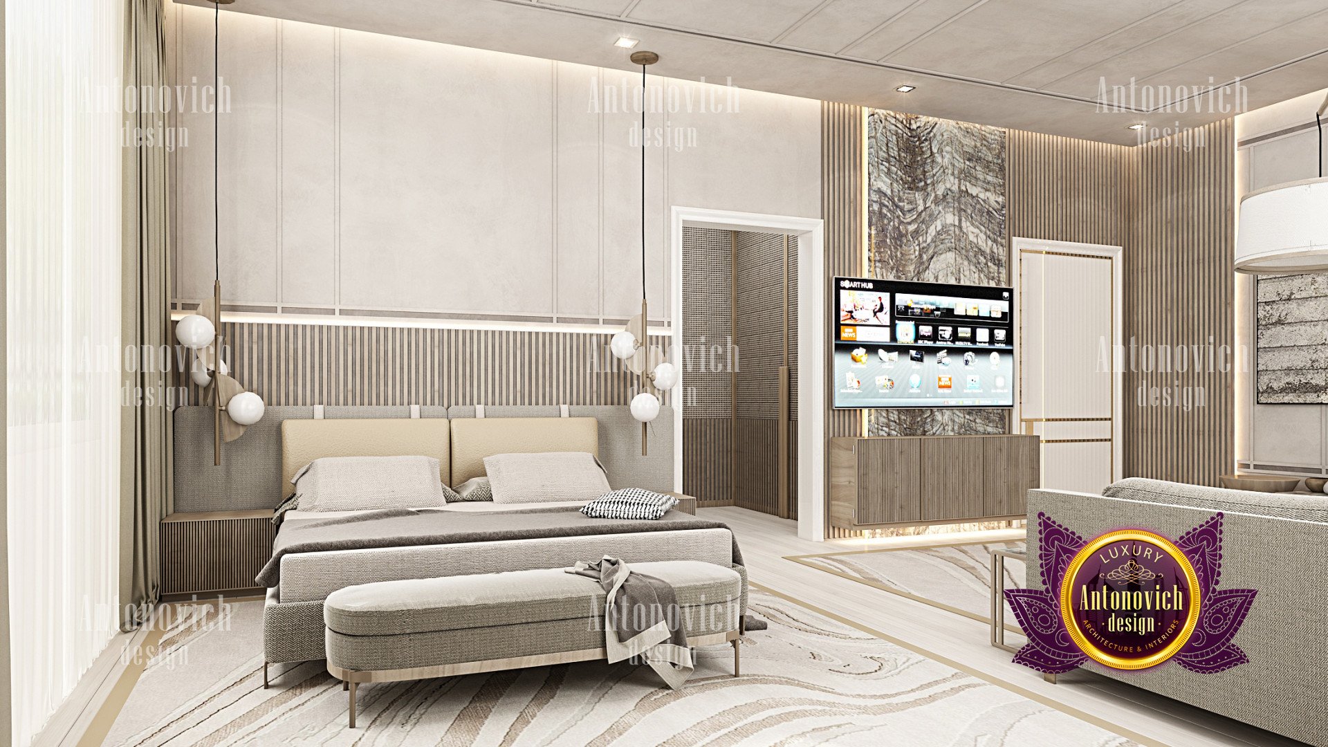 This exquisite bedroom interior design has the most pleasant and cozy mood that is coming from the right selections of hues and materials. What makes this bedroom looks more spacious and pleasant is how neutral hues have been formed and styled in the most expert procedure. As the top interior design company in the UAE, Luxury Antonovich Design always assures to deliver aesthetic perfections in every interior design arrangement most especially for luxury bedrooms. Each furniture design has a very unique style and details that make the bedroom looks more classy and comfortable. This exquisite bedroom interior design has a very relaxing sitting area that is filled with the most artistic decoration and smart selections of furniture. Every one of us needs a right spacing according to what deserve, some might want a cozy minimalist bedroom interior design with limited spaces, and some requires a very pleasant spacious interior setting just like these wonderful bedroom interior design. With Luxury Antonovich design, no matter what is the client is requiring, the team will absolutely bring out the best interior design solutions that will be very well suitable to clients needs, requirements, and most especially a bedroom that features their personality.