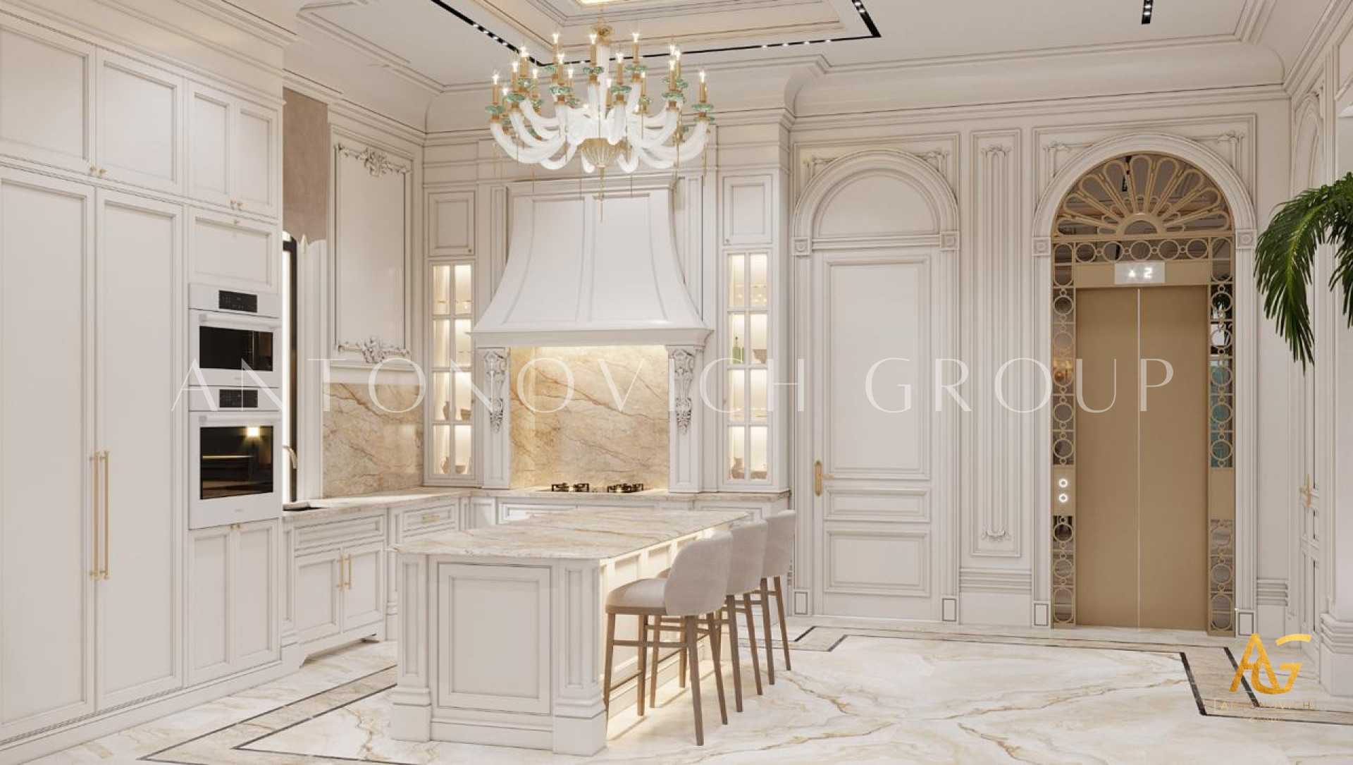 Dubai UAE kitchen design is the direction to which the design studio Luxury Antonovich Design pays great attention. This is a room in the house, which is always most actively visited. It is very important to combine functionality and ergonomics with the beauty and warmth of home comfort. And this variant of kitchen design in Dubai UAE became the embodiment of the best that exists today in the field of kitchen interior design. The advantage of the project was that for the kitchen was allocated a fairly large room with a high ceiling and two windows. This solution, interior designers Dubai UAE used to organize two zones. Kitchen zone and dining zone. The lush and elegant image of the interior has become a harmonious continuation of the interior design concept of the elite house in Dubai UAE. In general, the pastel palette of cream and milky shades prevails in the kitchen. This pastoral diluted with bright accents of curtains and furniture elements. A large window was decorated with beautiful curtains with a lambrequin. The combination of rich purple hue and creamy gives the decoration of the window a very elegant look. The window that is located in the kitchen area is decorated with a Roman blind in the same color combination. Soft chairs in the dining room area with a noble bearing are upholstered in noble velvet and encrusted with carved decor with gilding. The ceiling was decorated with a large niche with stucco and two elegant crystal chandeliers. If the chandeliers serve to visually distinguish the centers of each of the zones, then the floor decor in this design kitchen project in Dubai UAE has become a unifying element. Beautiful Italian marble with carved patterns fills the interior of the kitchen with a special solemn mood. All kitchen furniture became a beautiful reflection of palatial luxury. And behind these beautiful facades hidden elements of new storage systems and the latest kitchen appliances. This is a perfect example of a combination of beauty and functionality in the kitchen interior in a private house in Dubai UAE