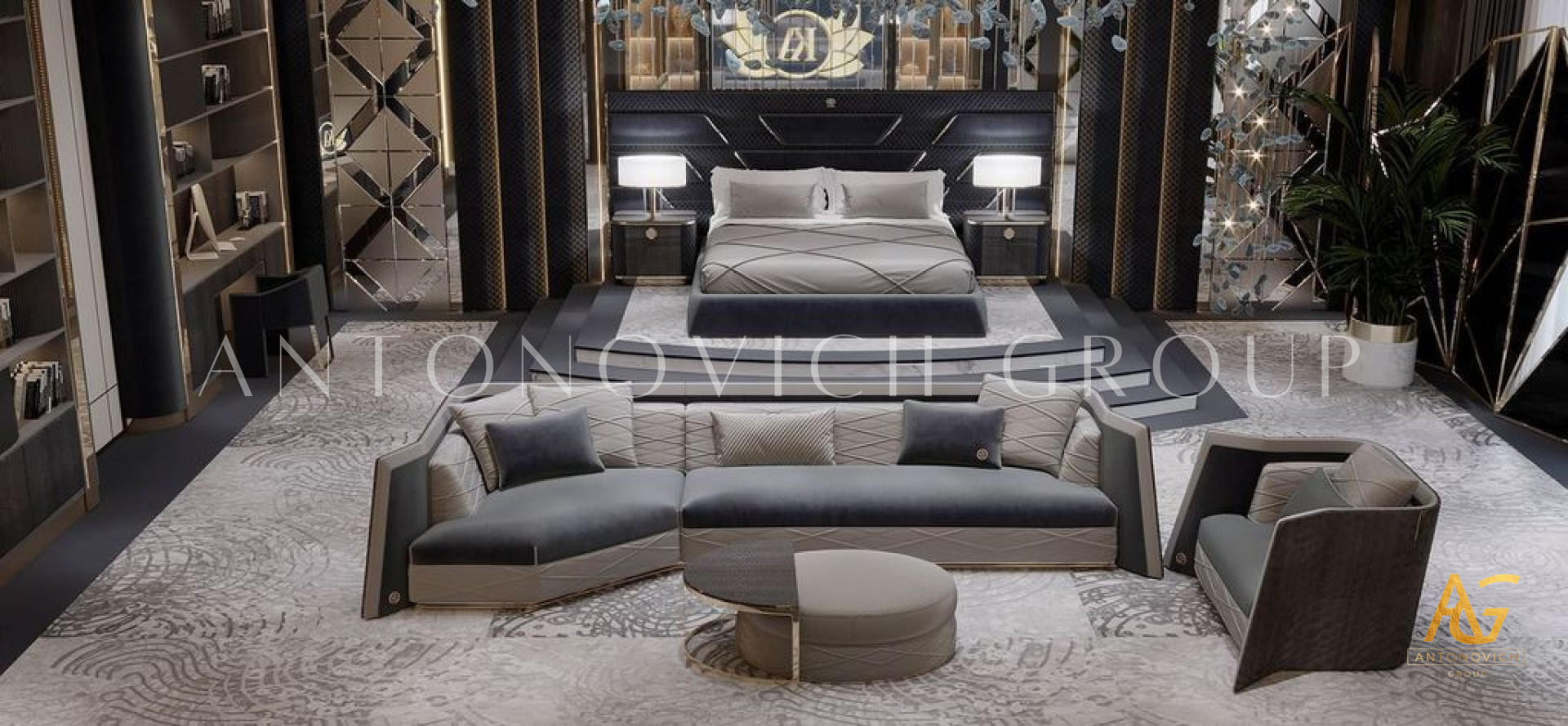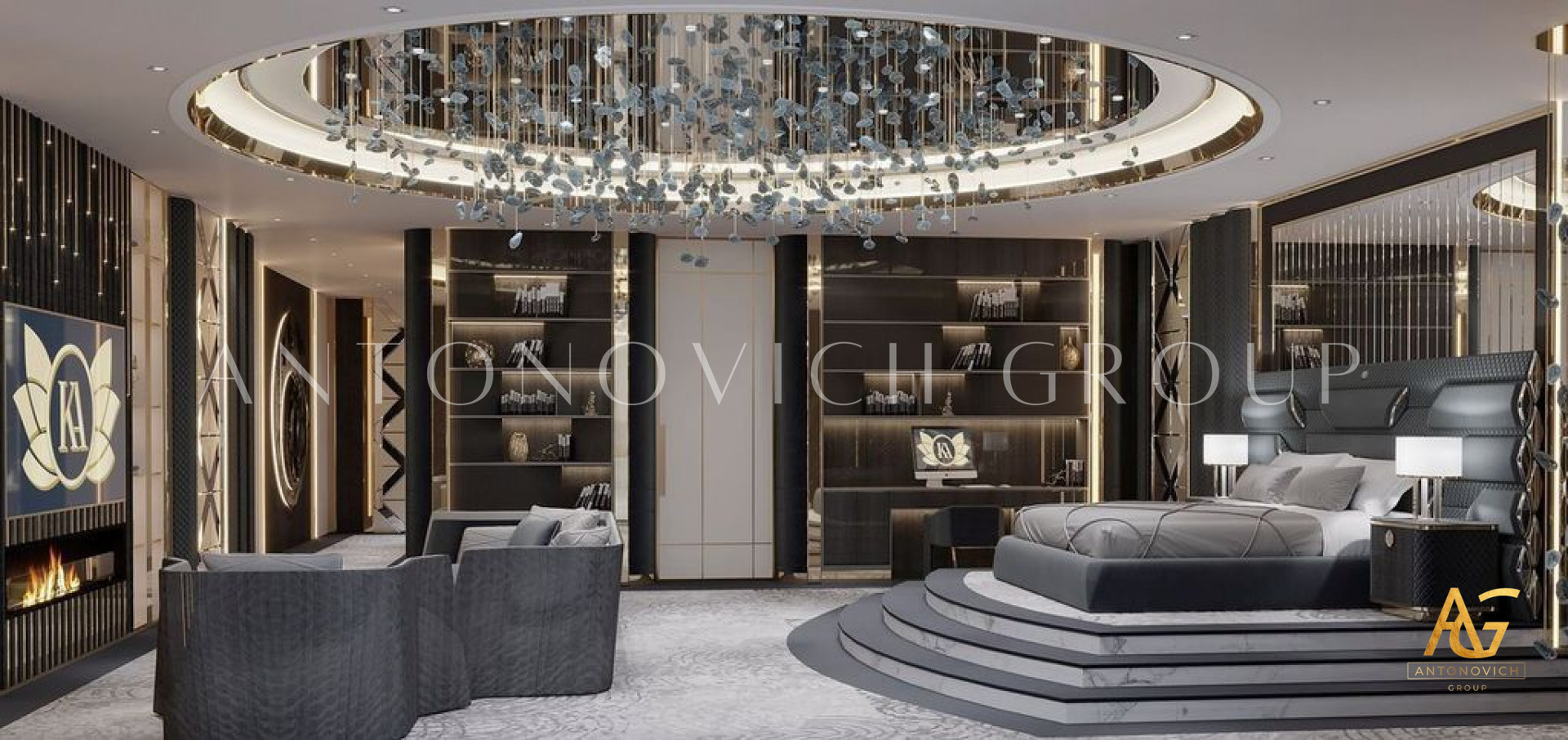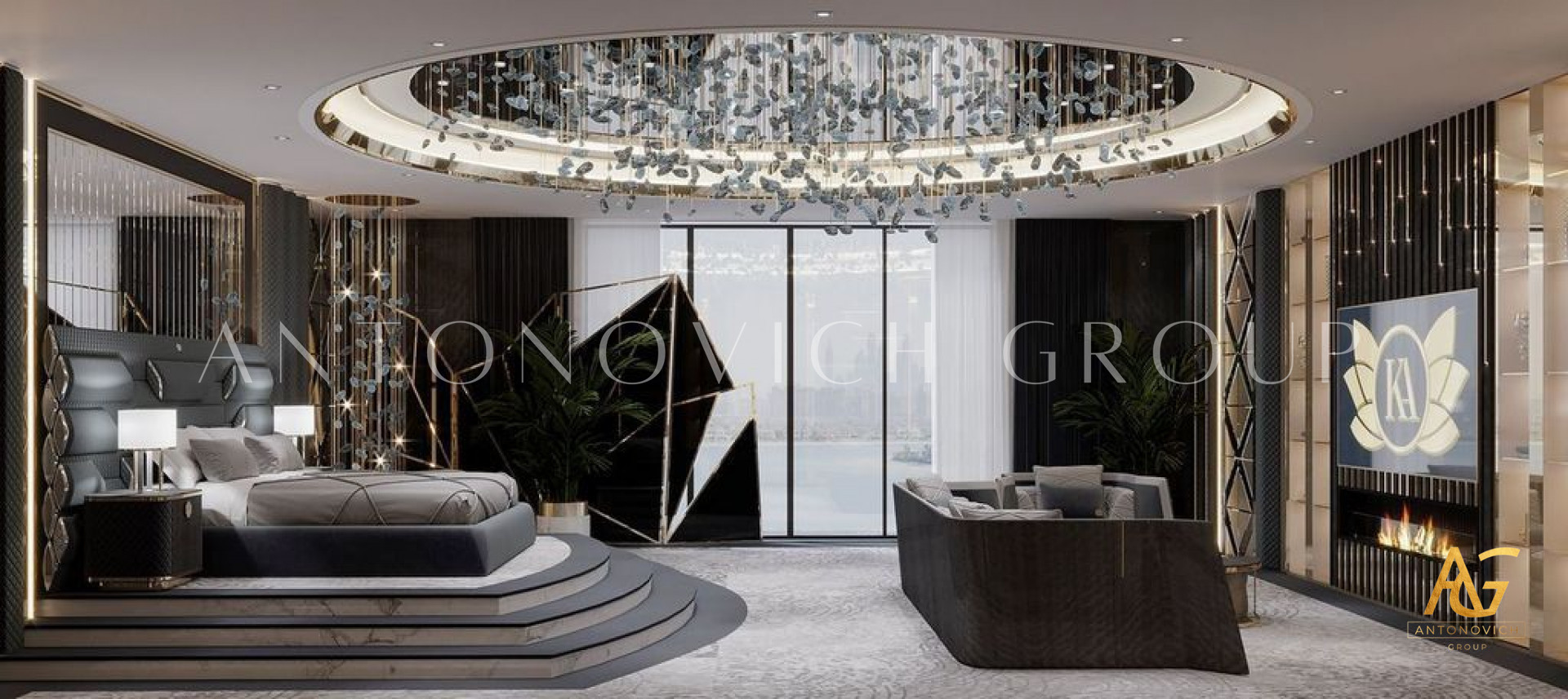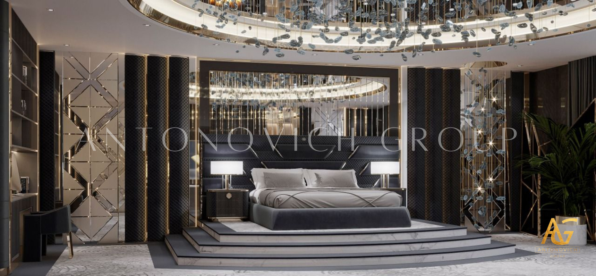 This master bedroom interior design is entirely decorated in in modern -contemporary style. The colors and textures have been combined and placed to perfection. Entering this master bedroom is like walking into a world of luxury and elegance, with a fantastic mix of a warm and inviting ambiance. The Luxury Antonovich Design joinery team has created a masterpiece by meticulously crafting the doors design, which includes intricate gold-painted carvings. The team was chosen as the most exquisite bed design, which is ideally acceptable for the full bedroom interior setting, resulting in a magnificent arrangement. The bed will be the focal point of any bedroom/master bedroom, and it must be carefully chosen to match the bedroom theme and mood.