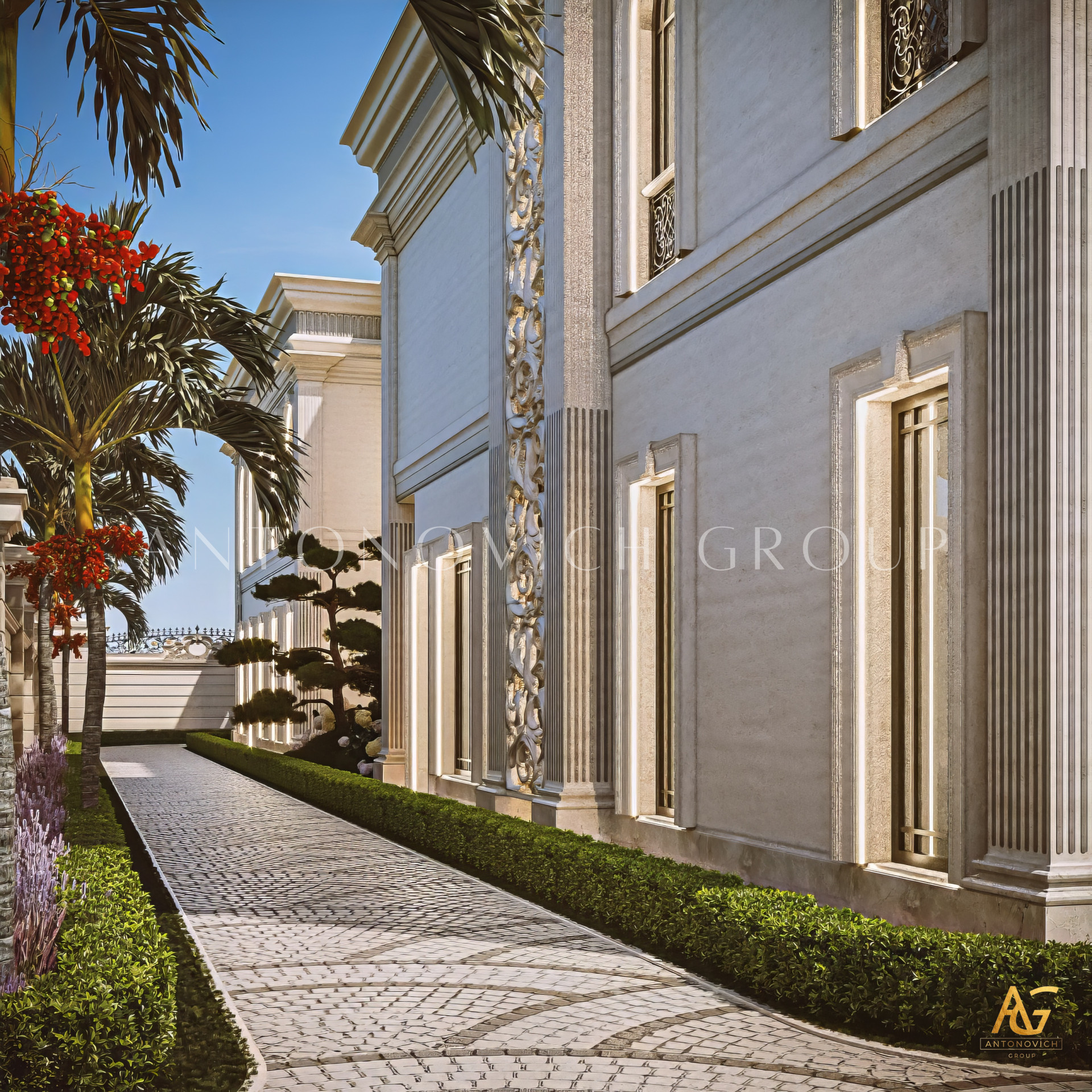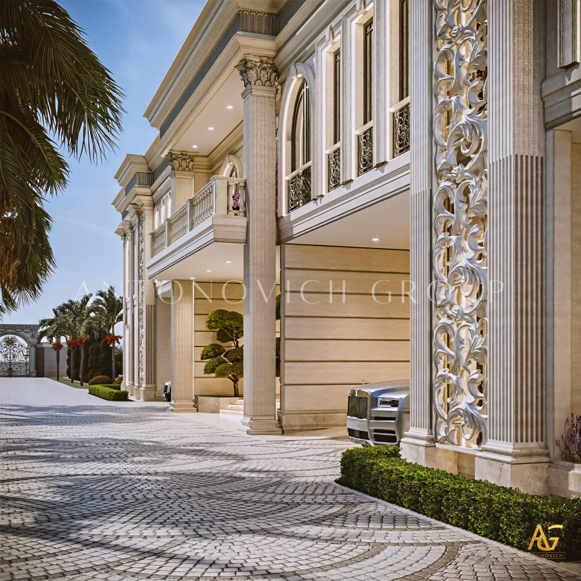 One of the best design companies in UAE Luxury Antonovich Design is proud to present you this beautiful house exterior design. The main twist of design is its fascinating decorating elements. Building is richly adorned by friezes, pilasters, vases, other sculptures. Our company knows how to make a project in classical style unique using little adorable details. We always create an architectural masterpiece.