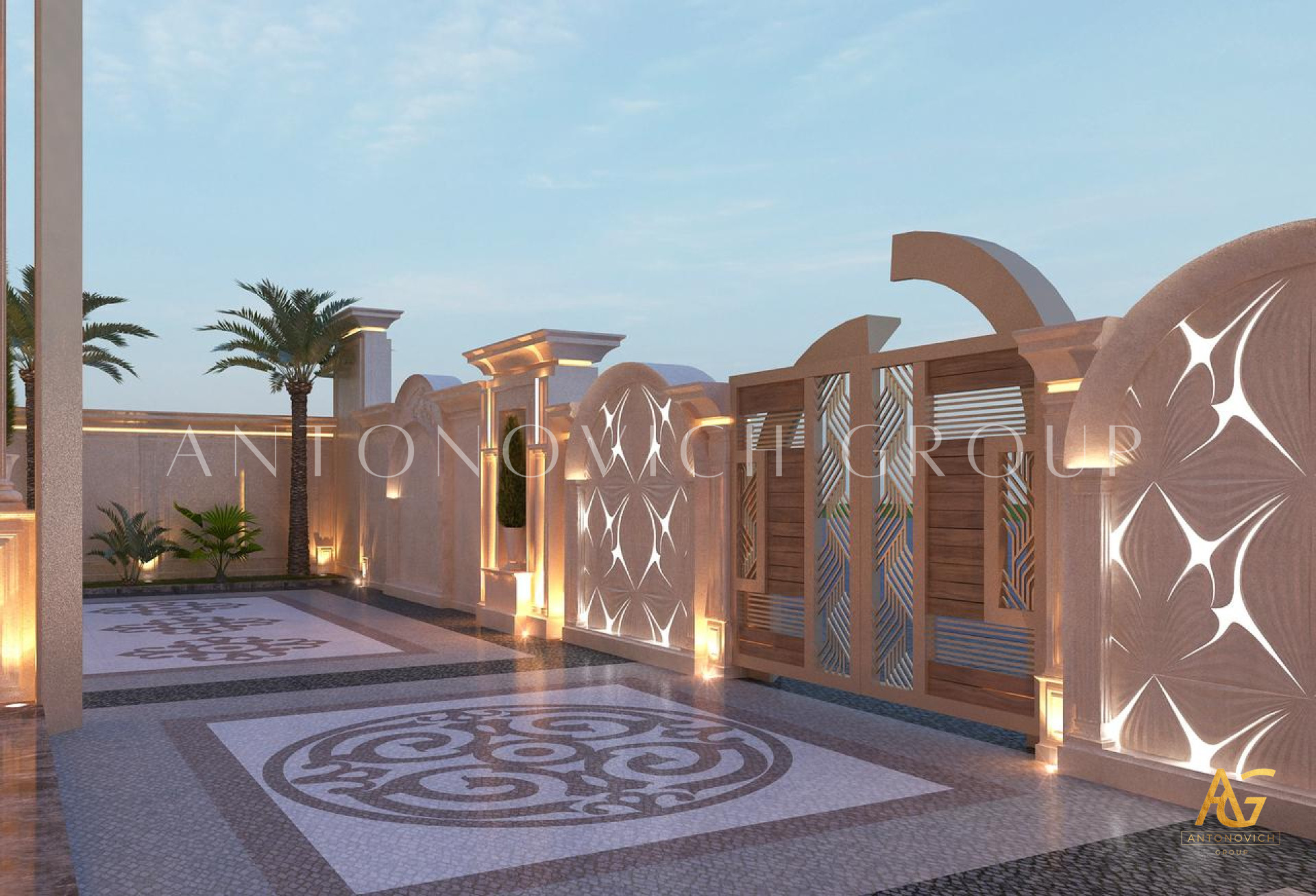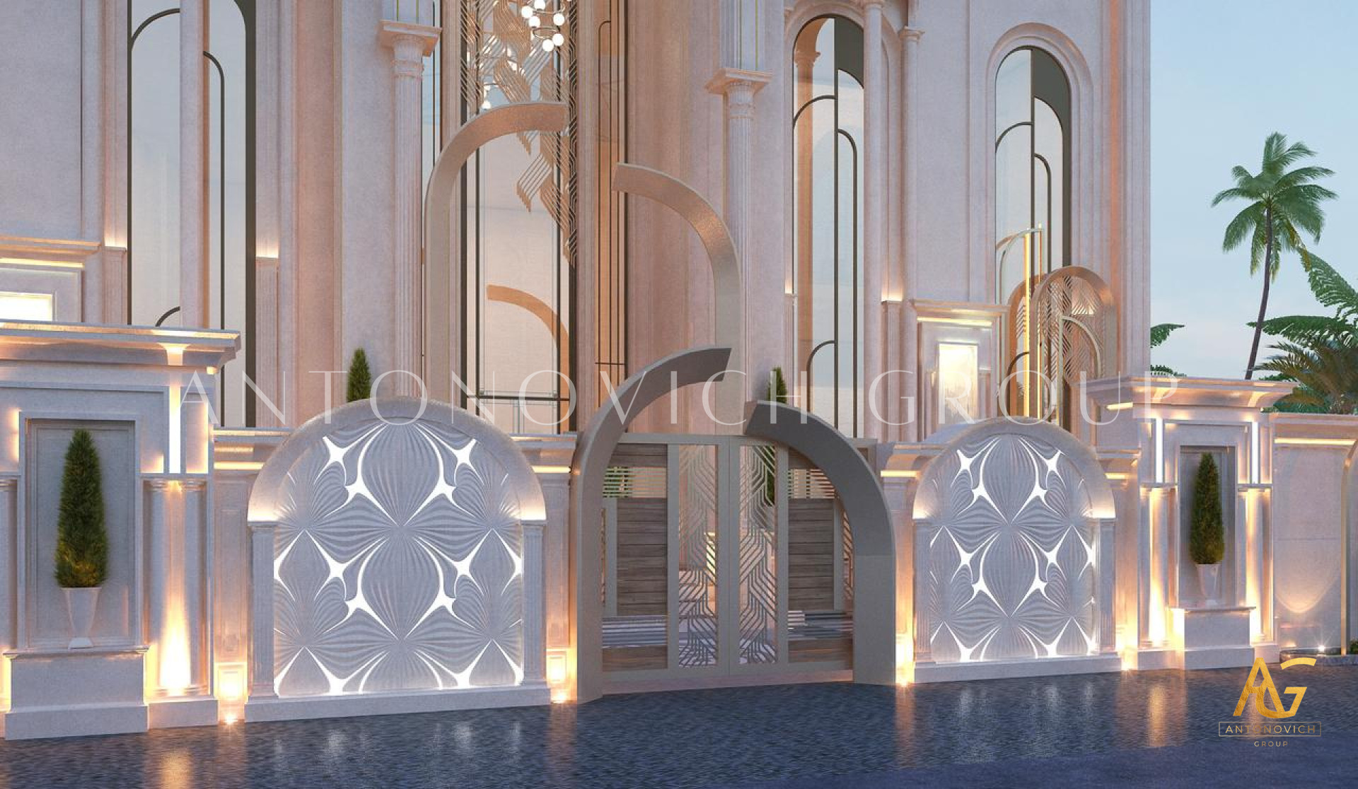 The design of the house front of the architectural and design company Luxury Antonovich Design combines a modern classics and captivating notes of oriental style. The natural texture and materials, which are processed in different ways, are very important in the creation of exterior design. Glamorous, mysterious, unique style of architecture, landscape design creates a special atmosphere. Visiting this charming home designing, you will transport to the eastern fairy tale and feel the enveloping atmosphere of ease and comfort. There are intricate patterns and carved details in this style of exterior design. The architectural features - mannered shapes, numerous archways, unique columns, magnificent facade stucco. Stone, metal, clay are used as the building and home decoration materials in the exterior villa design. It should be noted that the exterior design of the architectural and design company Luxury Antonovich Design; it is a luxurious, laconic and unique style. Color scheme of the facade is a combination of smooth and deep beige tones. If you look at the facade, the house seems to be light, airy, harmonious asymmetry is visible, volume and capacity. Forged gate with automatic control impress of its view.
