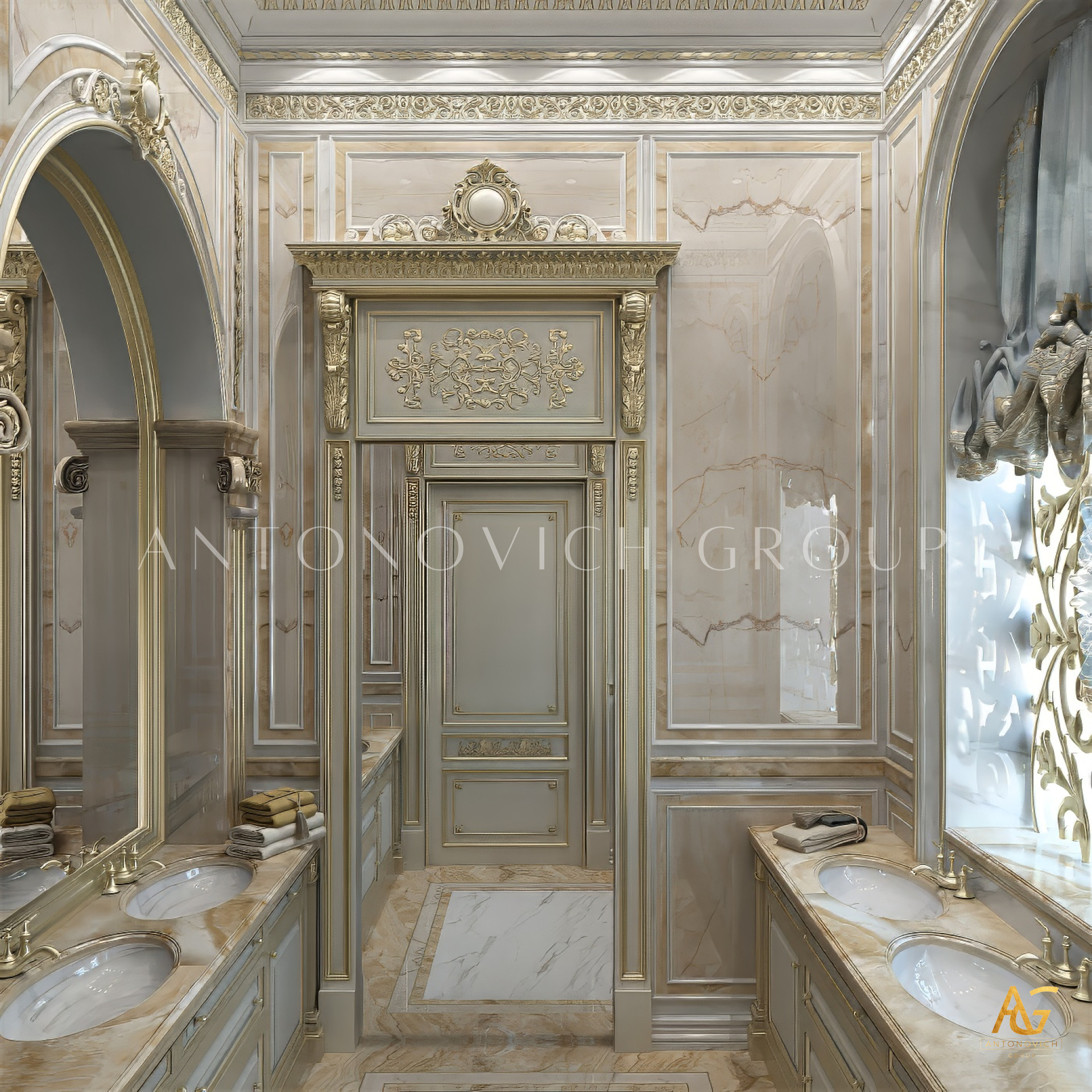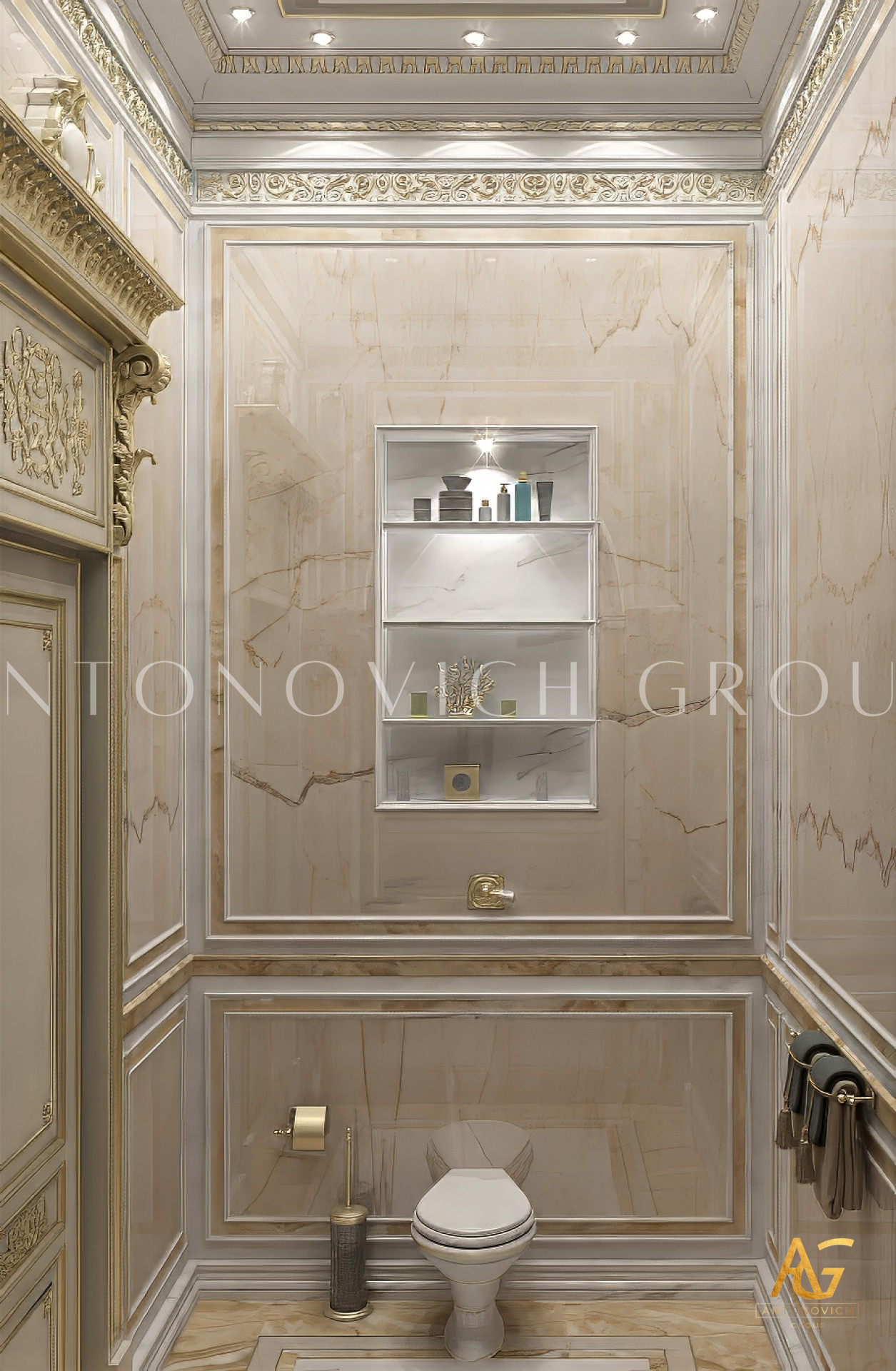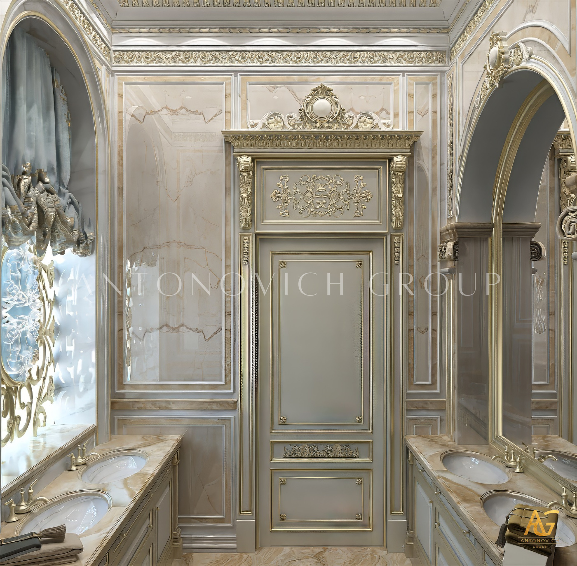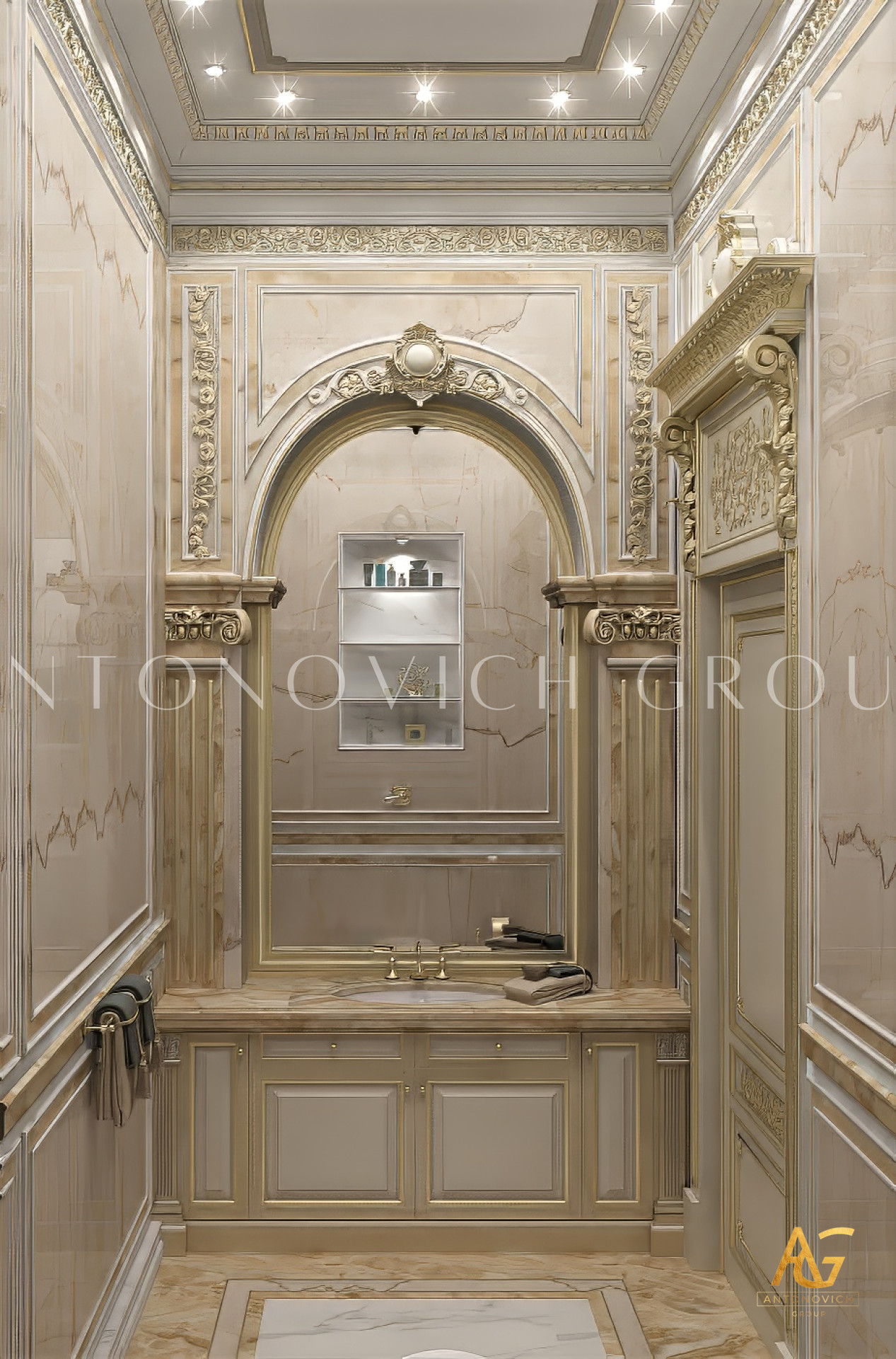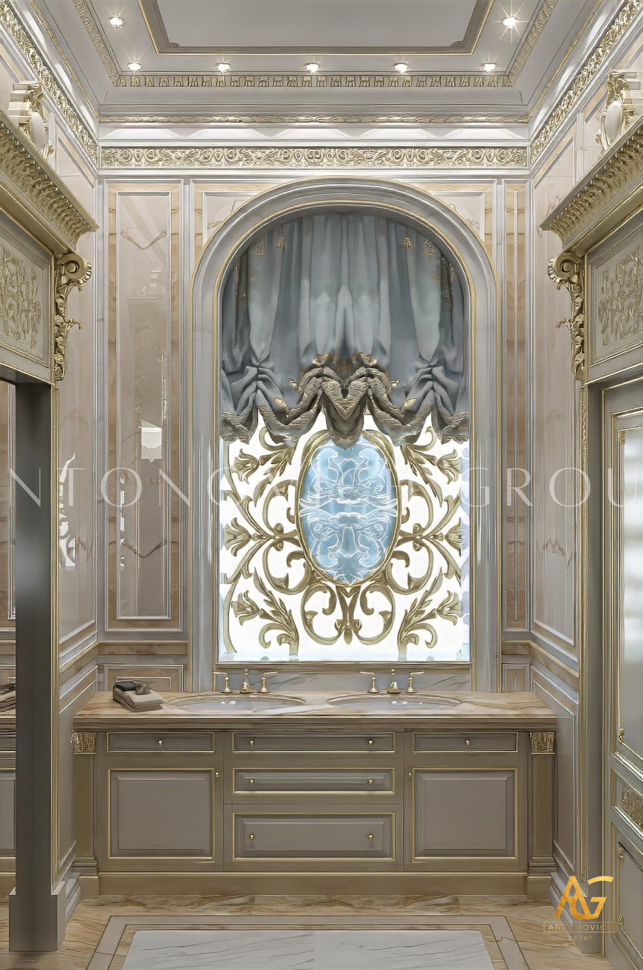 The luxurious bathroom interior design for a luxury home also includes wonderful racks and cabinets for storing your stuff. The mirror is another lovely feature of this luxurious bathroom interior design. The mirrors elaborate border and outline features are a stunning sight to behold. The ceiling, too, is one-of-a-kind! The details, which include a nature-like accent, draw a lot of attention. The luxury bathroom interior design has been created with a great deal of love. The colors serve to create a soothing ambiance, while the lighting gives the luxury bathroom a wonderful impression. Everything about this work is undeniably appealing!