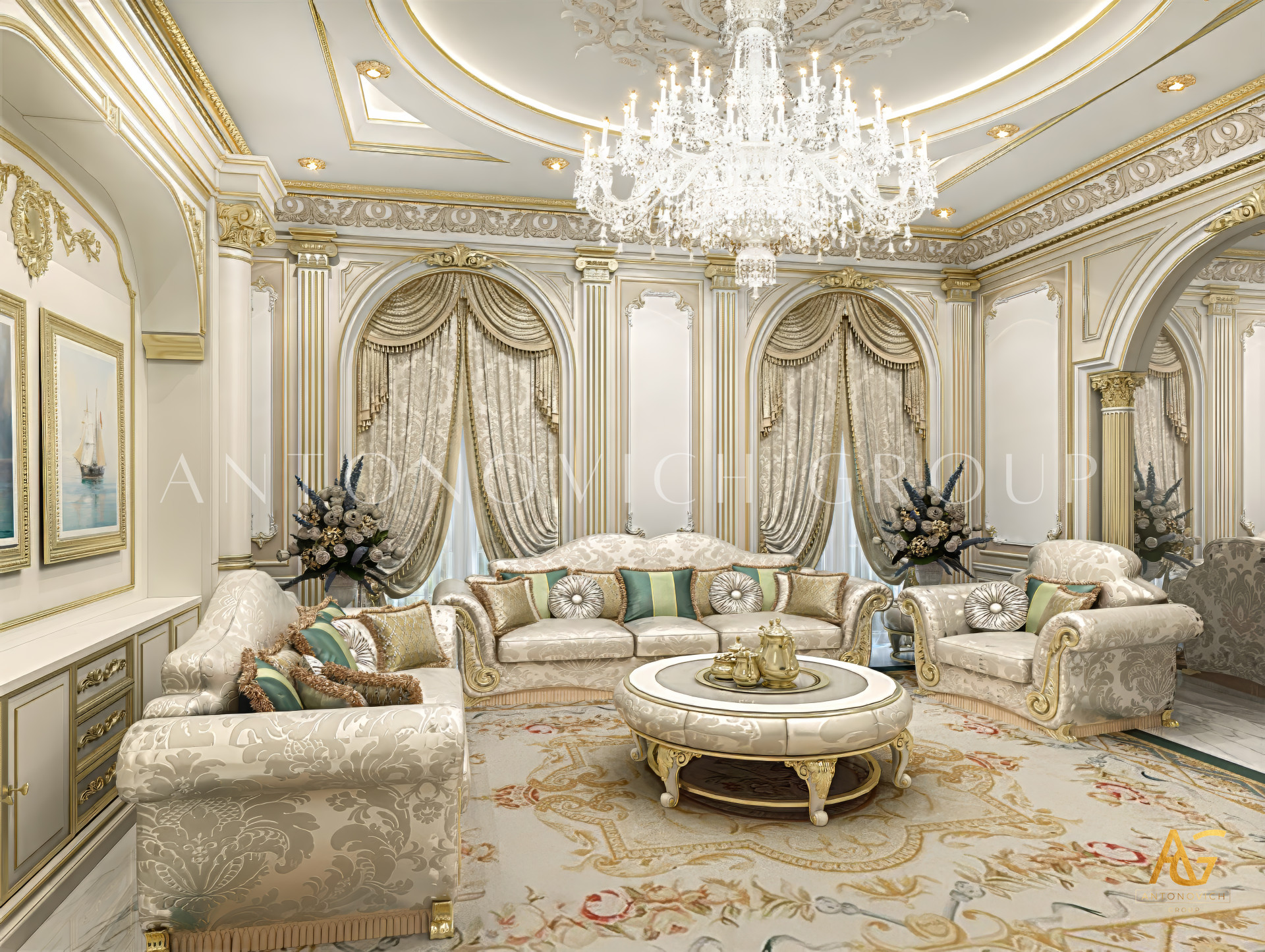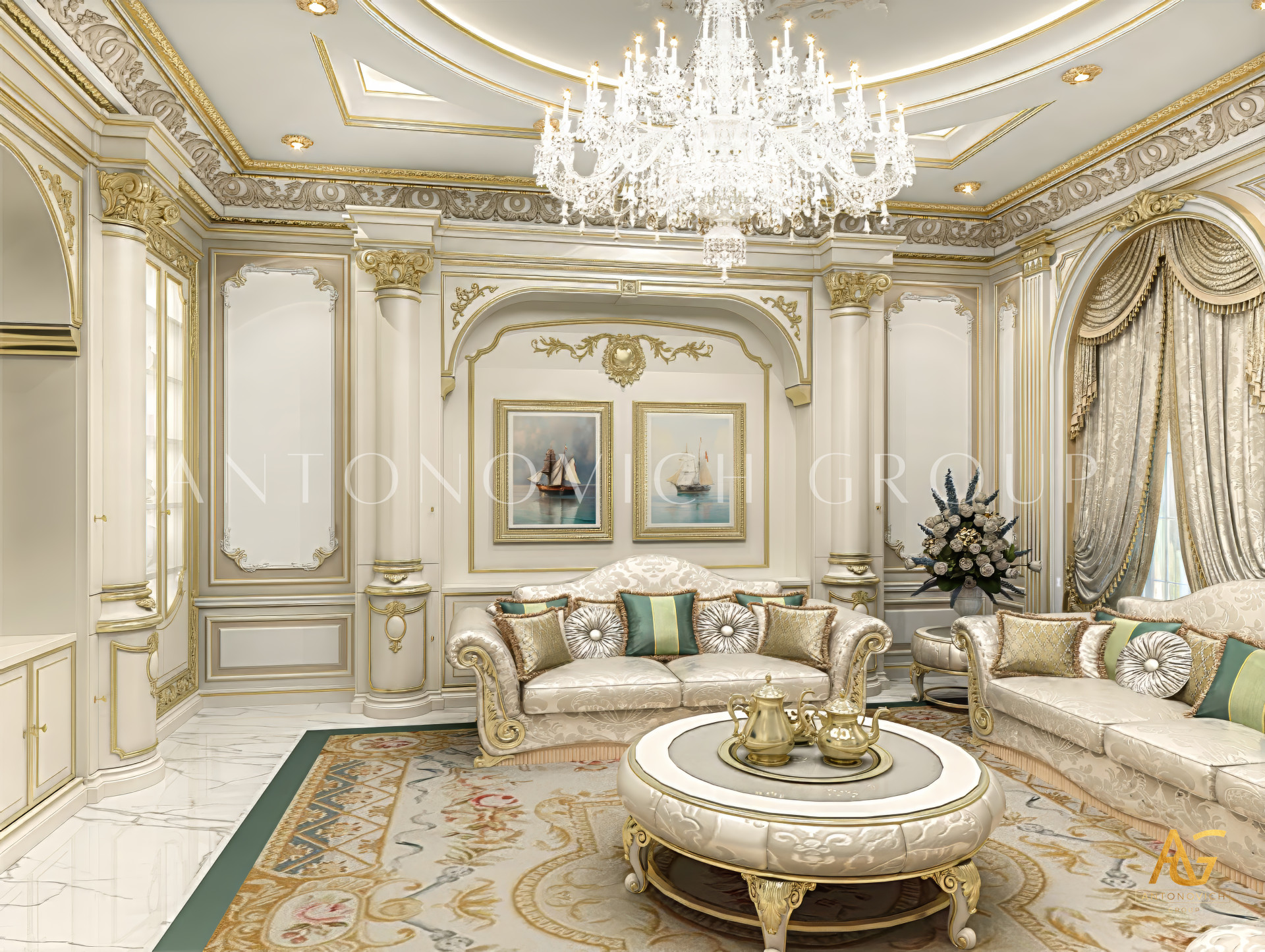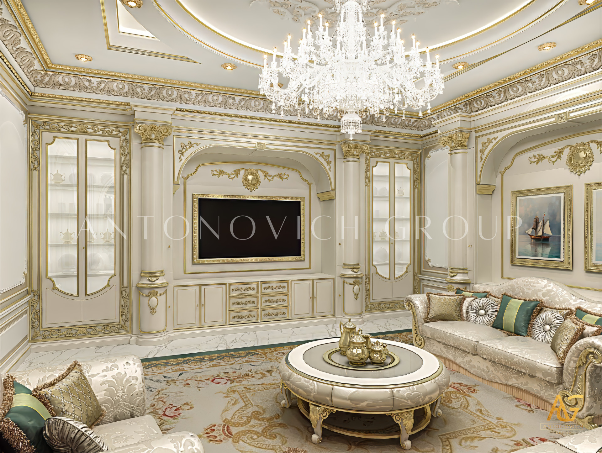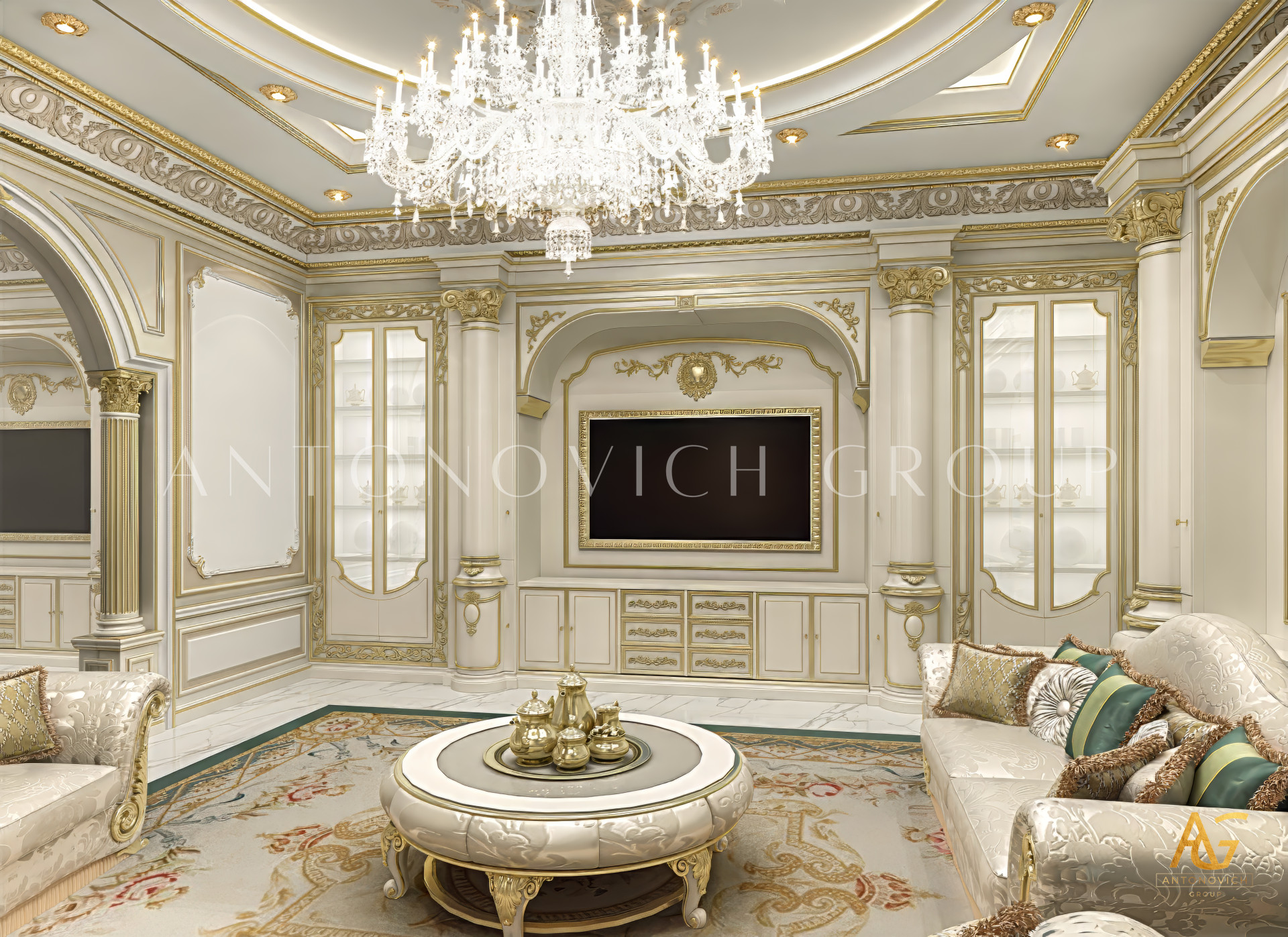 One of Antonovich Group most spectacular interiors is this sleek and exquisite interior design. Superior colors in the exquisite luxury living room interior design elevate this to the status of a costly masterpiece. The gold decorations on the ceiling, doors, chandeliers, and even the tables are spectacular. Its gleaming hues complement the luxurious living room interior designs lovely color scheme. A lovely accent and furnishings complete the upscale living room. The elegant billiard table is unique. It has an incredible stance. The furniture designs used in this intriguing and creative luxury living room interior design have all of the beauty that you require to feel comfortable and tranquil all of the time.
