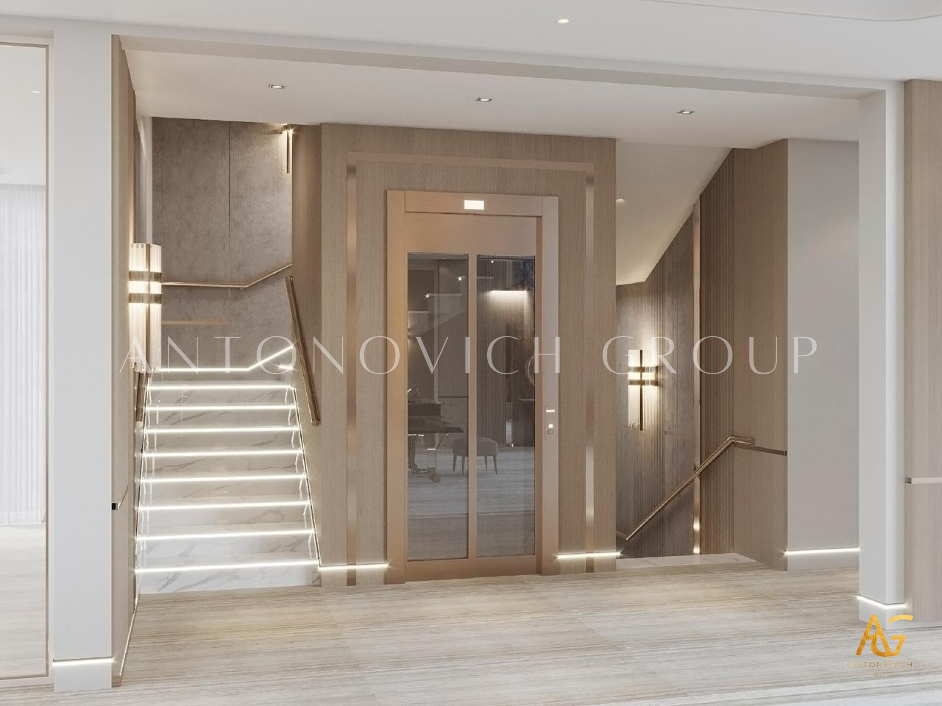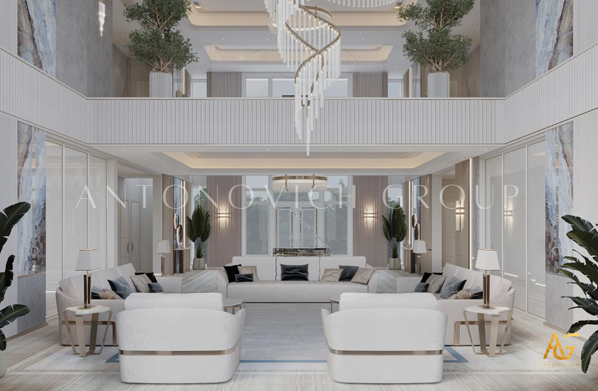 Modern palace, which impresses with its splendid decoration created by designers of the studio Antonovich Design. As a basis of the elite interior decoration of the villa in the UAE, we took luxurious white marble. Elegant interior design is closely connected with the architectural project. House central portal has become the epicenter of the magnificent interior story interior design images. And the simple interior design of the hall became double staircase of white marble, leading to the second floor of a beautiful villa.The graceful contours of ladder portal are joined at the top part and become the beginning of a large terrace on the second floor. Marble floors are decorated with carvings of natural stone in different shades. A special role was given by interior designers to the decoration of windows on the first and second floor. Some windows decorated with luxurious velvet curtains in a classic style hue of rotten cherries. The rest of the windows are decorated with very beautiful stained glass windows with the authors patterns. A real masterpiece, which graced the interior, became a magnificent stained-glass dome. This element defines the center of the luxury space as well as a massive crystal chandelier. 3d interior design of houses in the classical style is the new masterpiece of talented designers Luxury Antonovich Design studio. Interior design in UAE very harmoniously combine time-tested traditions and new technology. In order to create the ultimate comfort for owners of the house and their guests, modern elevator in the lobby was provided. Due to the circular lift shaft of transparent glass and exquisite decor, elevator very harmoniously blended into the luxurious interior.