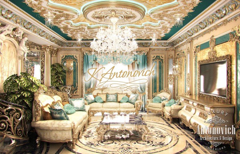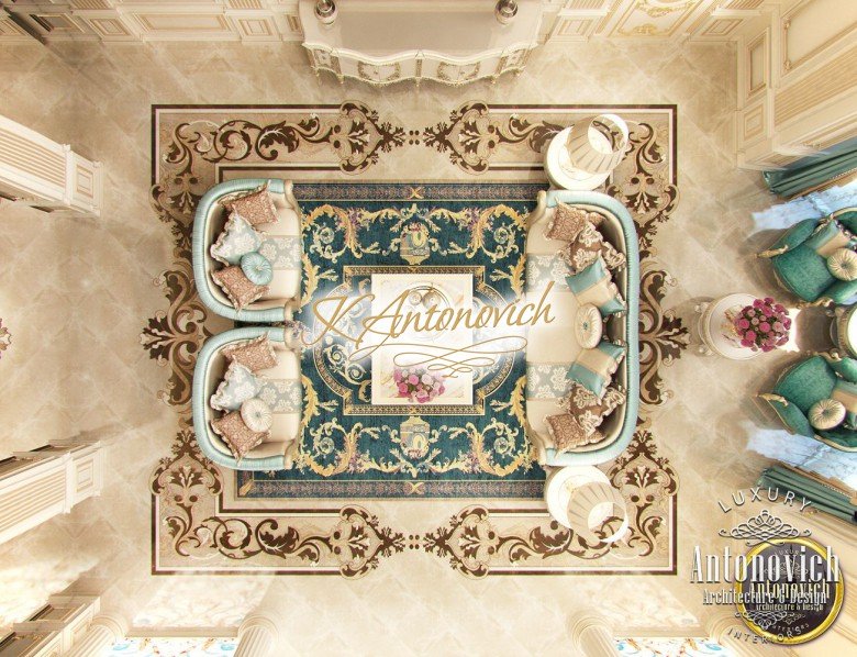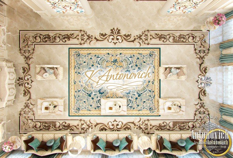 Artistic expression of interiors by Luxury Antonovich Design is largely connected with the luxurious floor design. Carved marble floors became a business card of the studio. These are real works of art that adorn the most luxurious and respectable interiors. The floor design is integral to the walls and ceiling design. Also, floor design harmonizes with other decor items. In this project, carved patterns on the marble floor are created of several stone types, including semi-precious materials. And the patterns are similar to ornaments on a luxurious Persian rug in the living room. The floor design is a delicate and elegant way to zone any space. Here the carved pattern became a way to determine the boundaries of the living area. The carved floor is a way to emphasize the artistic value of the interior. This masterpiece will go down in history and will delight more than one generation of the villa owners. The luxurious floor design is based on the proper use of modern technologies.