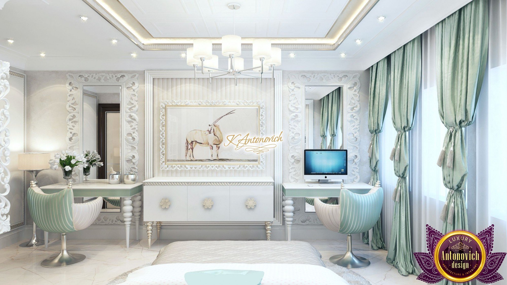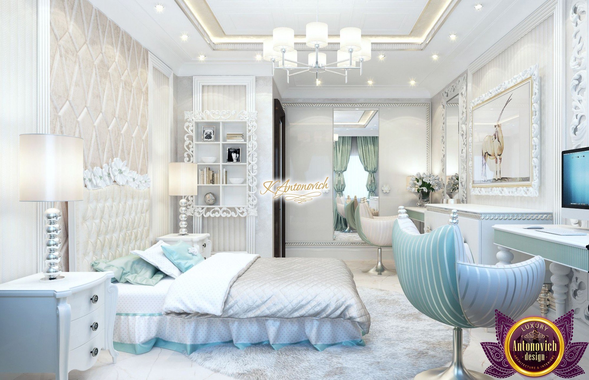 Creating each interior, interior designers of design studio Luxury Antonovich, primarily seeking to create an ideal environment for the customer.This luxurious bedroom has been designed for the eldest daughter of the house owners. Interior fully corresponds to a bedroom for adults. But the designers have added some charming accents to emphasize that the owner of these apartments is a young girl.To this objective also contributes a bright range of colors.The culmination of the beautiful interior story became a luxury bed and wall decor behind its headboard.It is in bedrooms interiors soft textile panels have become the most popular element of the decor.This decor embodies the softness and warmth of home comfort but also serves as a wonderful soundproofing material. This further contributes to a comfortable rest and healthy sleep. The headboard itself decorated with a soft panel of velvet in bright colors with diamond shaped buttons.The additional charm of this element of the bed gives carved decor in the form of beautiful flowers. Splendor and harmony to the decor panel add two symmetrically arranged inserts of cream color velvet in a frame of white wooden frames.Beautiful bedroom interior impresses with its magnificent decoration. The floor of white Italian marble with a soft fluffy carpet combines practicality and warmth of home comfort. Particularly elegant and magnificently beautiful in the interior looks a luxurious silk curtains shade of mint. Curtains decorated by soft holders in the form of large brushes. Tenderness and elegance bedroom interior fully corresponds to the character of the room owner.