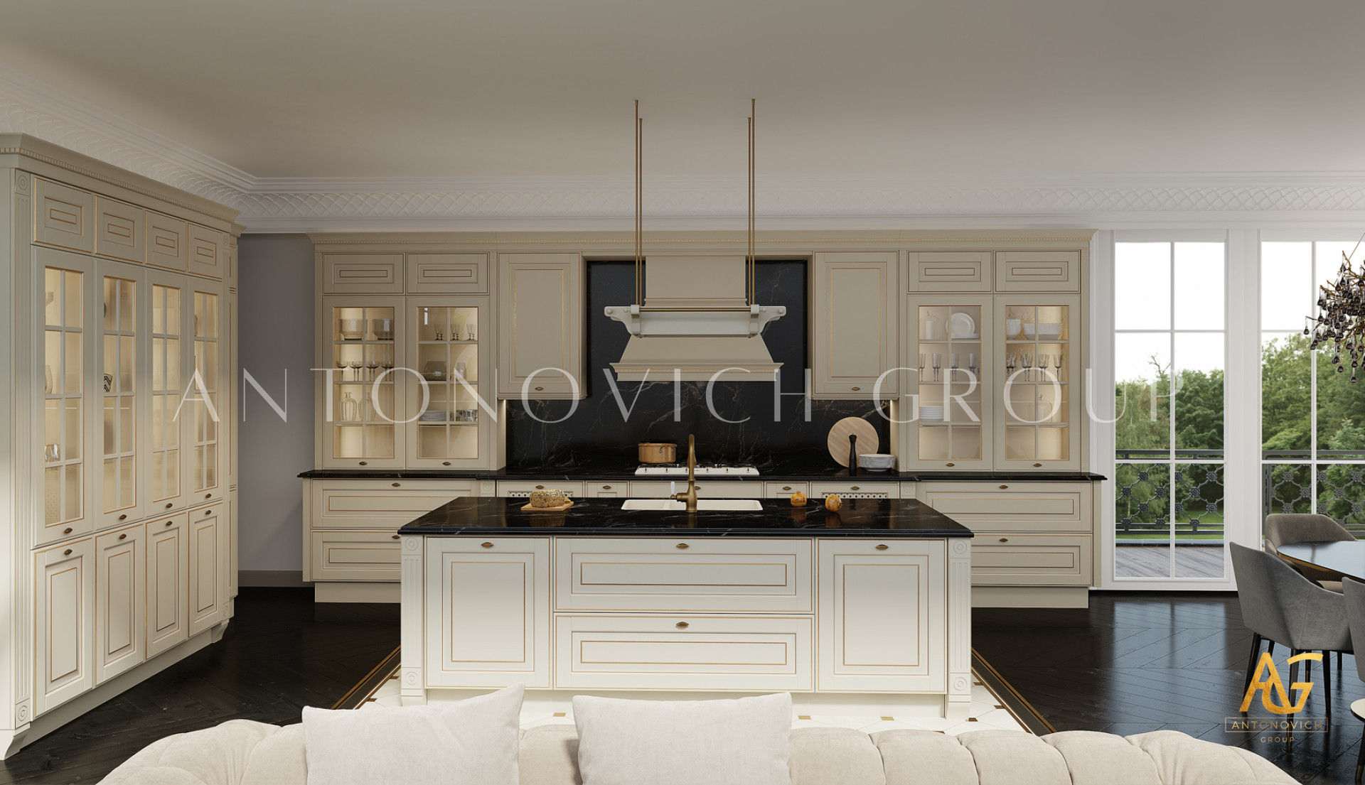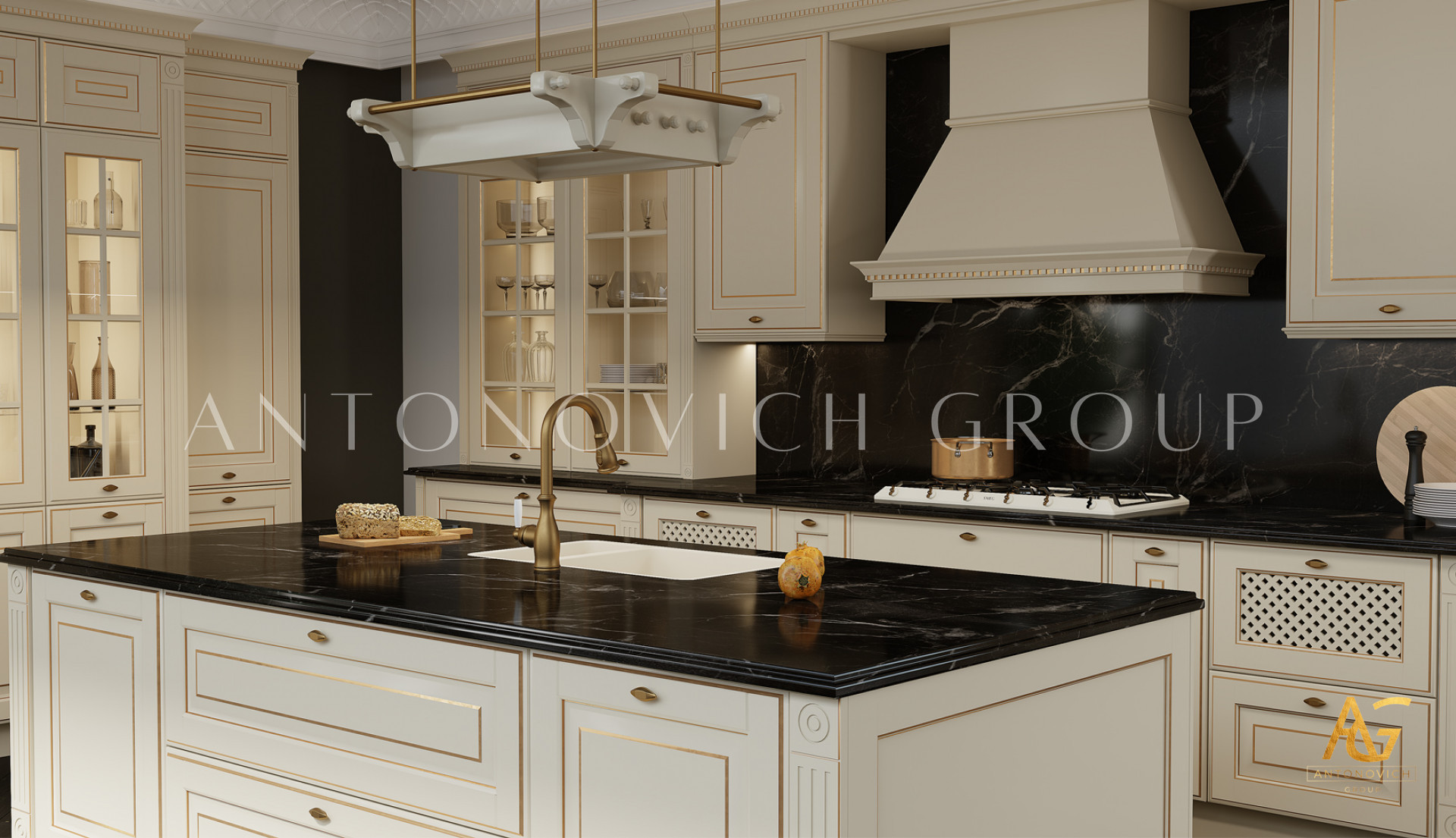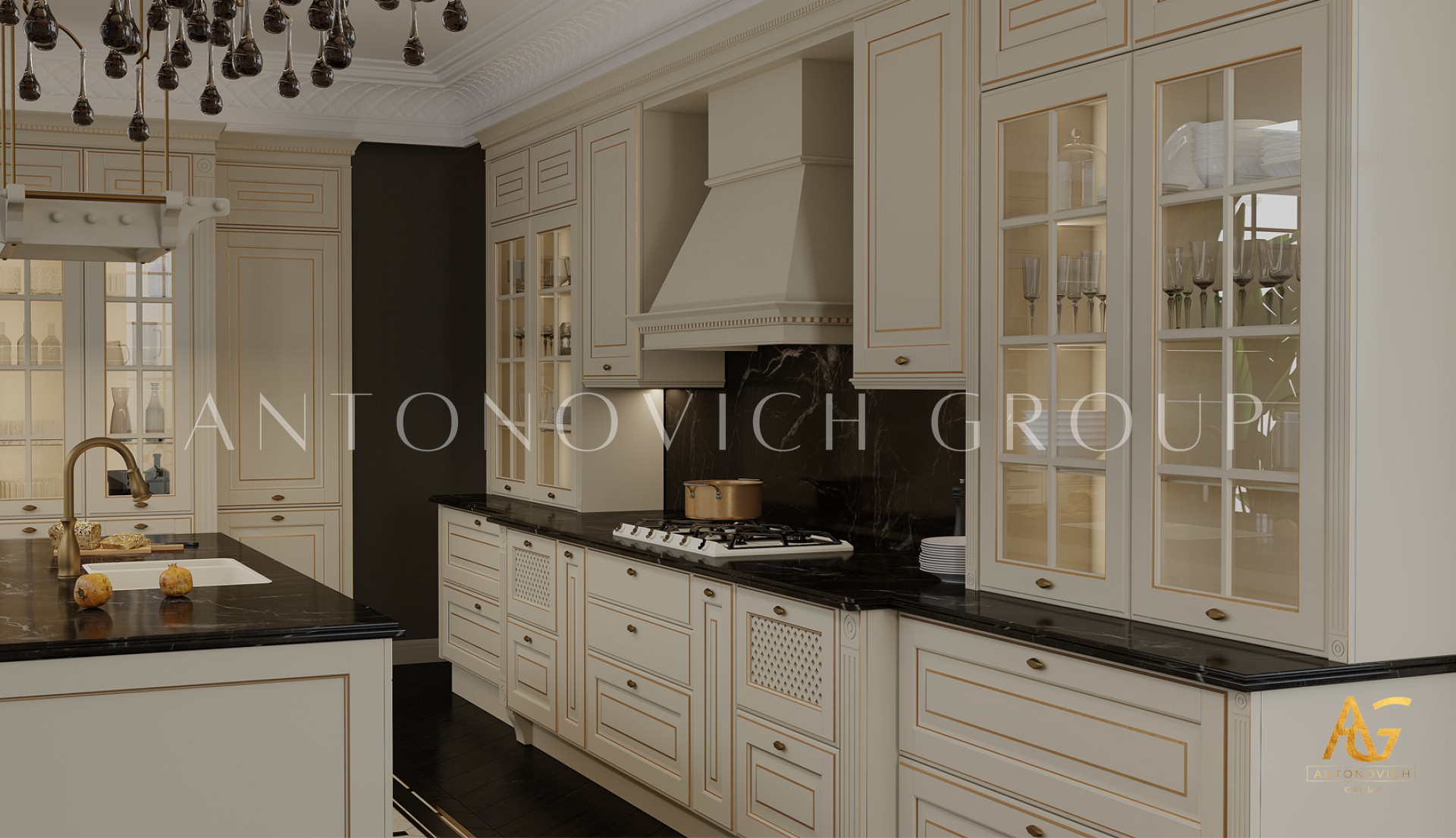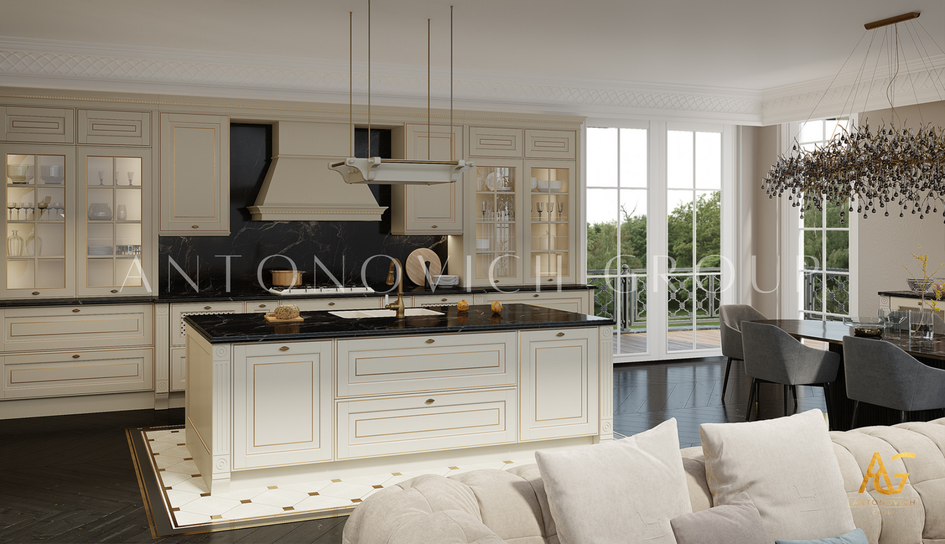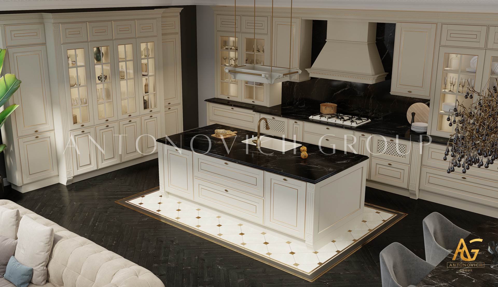 Ornate embellishments will astound you. With acres of shiny white accented by striped wood, the overall vibe of this luxury kitchen interior design Dubai is light and open. Look up, though, because theres a brilliant design decision hanging from the ceiling: a black chandelier. This is great because it contrasts with the rest of the room in both color and style. If you have a modern luxury kitchen interior design in Dubai, a sleek lamp is an obvious choice. However, if you go bold and black, it will stand its ground quietly and without being distracting. Sometimes the greatest way is to do something unexpected. Make your seat covers darker. Recovering stools or chair pads is a simple method to experiment with the aesthetic. Make sure you take your time when selecting a sink for your opulent luxury kitchen interior design in Dubai. Consider premium flooring alternatives. Theres no denying that lavish and decadent marble comes to mind when we think of beautiful flooring. Contact Luxury Antonovich Design for the best kitchen interiors.