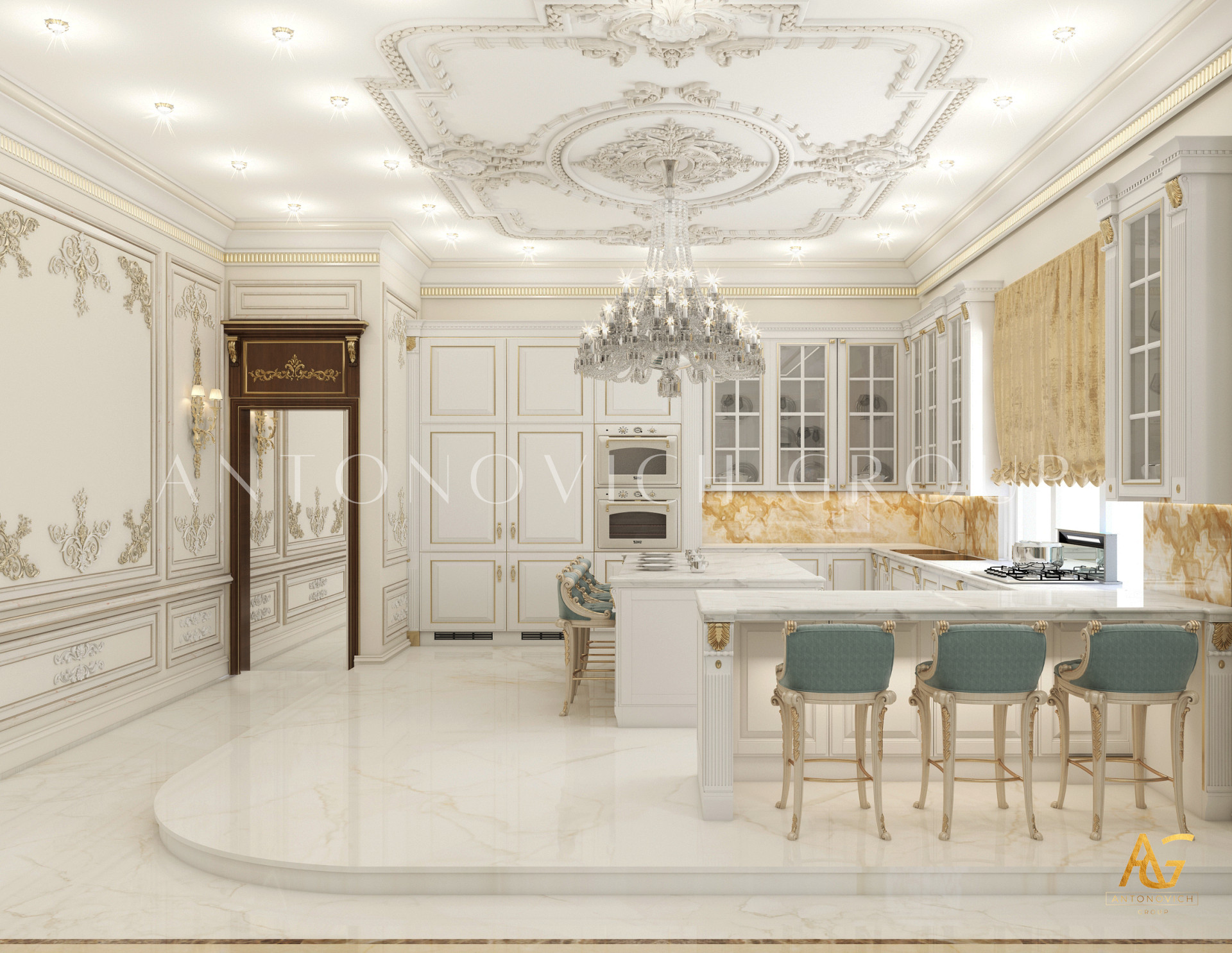 Always popular and fashionable classics in the works of the studio Luxury Antonovich Design does not cease to please and surprise with its beauty, novelty, and uniqueness. This interior of the house in Abu Dhabi was an excellent embodiment of the wishes of its owners. Their main wish was to get the luxury of the palace residence within the city apartment. And with this task, designers of the studio Antonovich Design coped brilliantly. Respectable living room was decorated with a beautiful ceiling with stucco decorations, an elite parquet floor of light wood of English styling, luxurious furniture, and beautiful curtains. A discreet palette of shades in the interior became the moment of elegance and cozy mood. The magnificent and elegant decor of the walls with stucco molding, gilding, silk wallpaper, paintings and classic sconces perfectly blended into the interior and became a luxurious frame of other details and decor elements. Curtains of silk velvet with a pleasant lilac shade echoes with the upholstery of the furniture. The dining zone is located at the window and occupies almost half the room, which perfectly emphasizes the hospitable character of the apartment owners. The beautiful white kitchen continues the motifs of the classical style. In the overall white range of pearly shades, soft chairs of silk mint shade and luxurious curtains in the same tones with printed golden ornaments look vividly. The most romantic and gentle corner of the apartment is a beautiful bedroom with a luxurious wall decoration. And only for the childrens room, interior designers applied a completely different concept of modern style. After all, the main task is to create an ideal living environment for every member of the family.