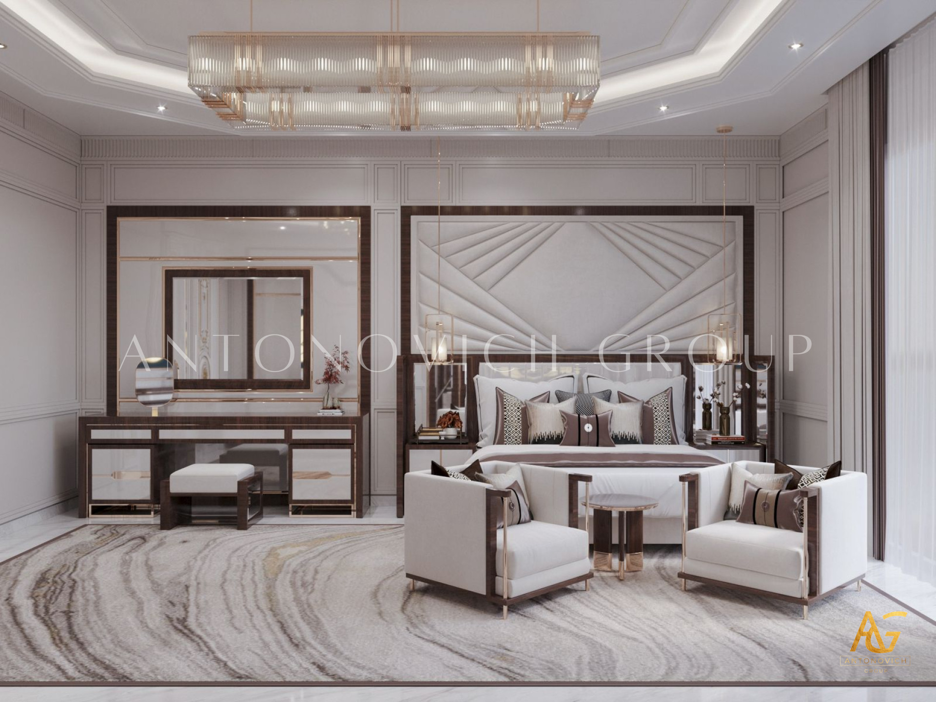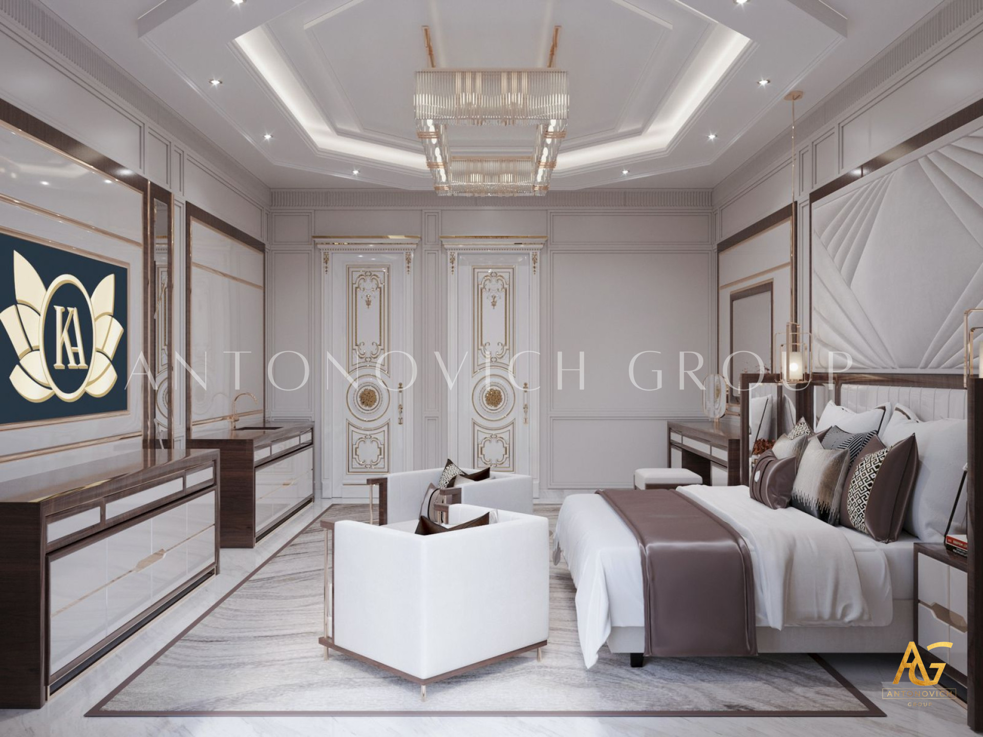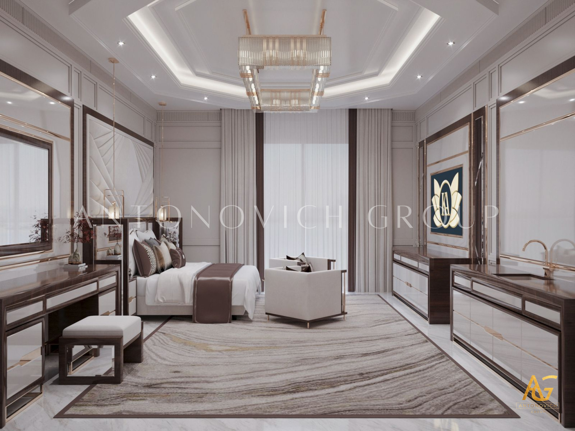 The whole modern design is based on clean lines and more on the simplicity side of design. The consideration of picking colors are more than often neutral but in this model that the Luxury Antonovich Design created the design has a blue and gold accent colors which add depth and character to the room. The interior of this bedroom is well planned and mapped out to make sure that the area has more space and the furniture is less crowded.