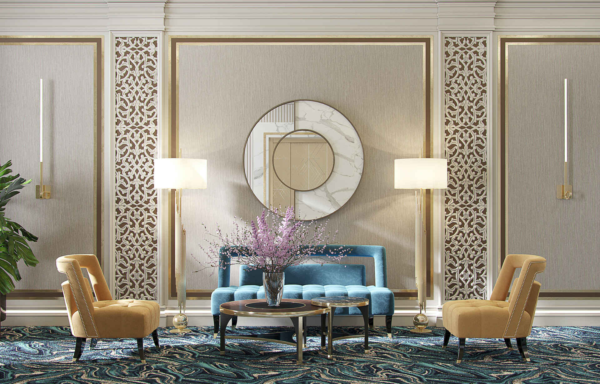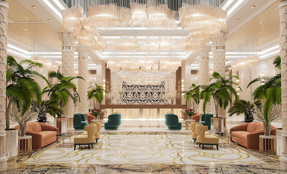• Grand lobbies and atriums with bespoke chandeliers, art installations, and feature walls