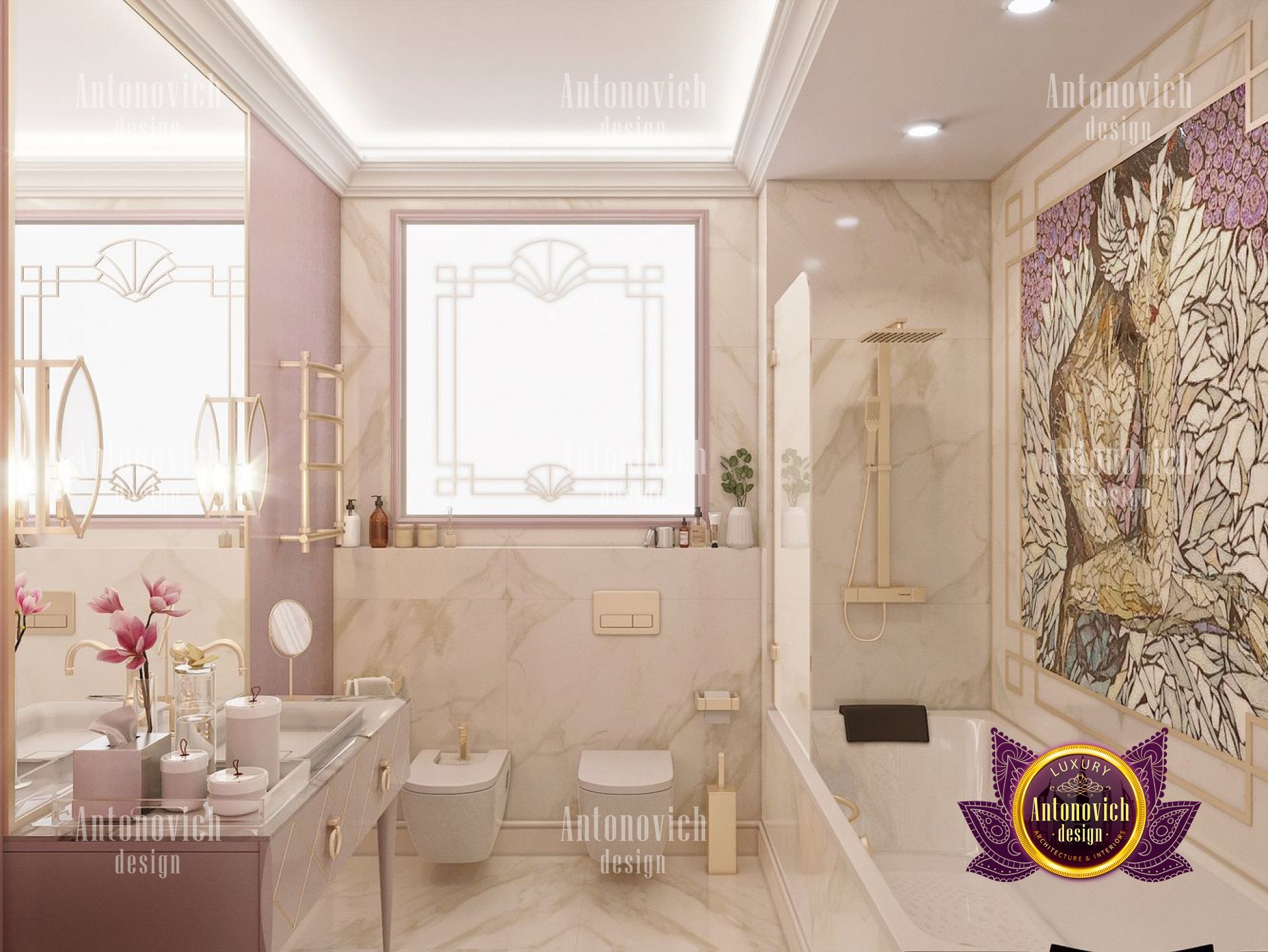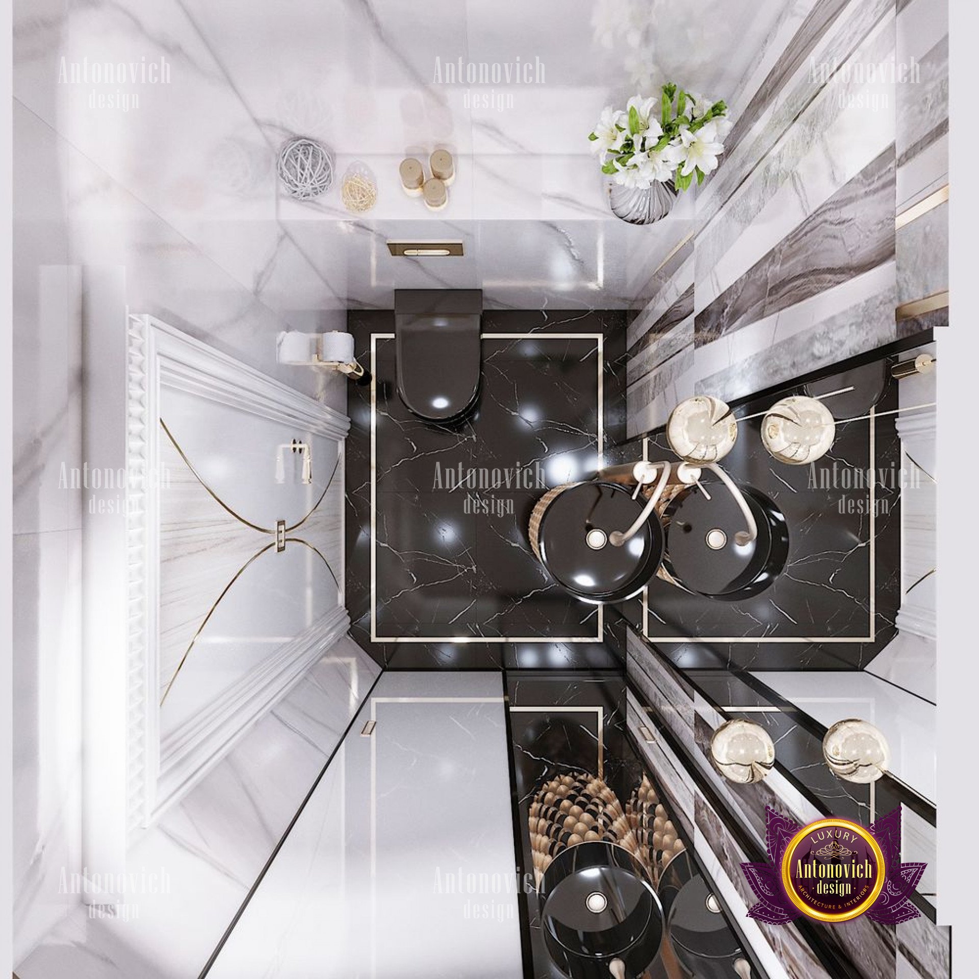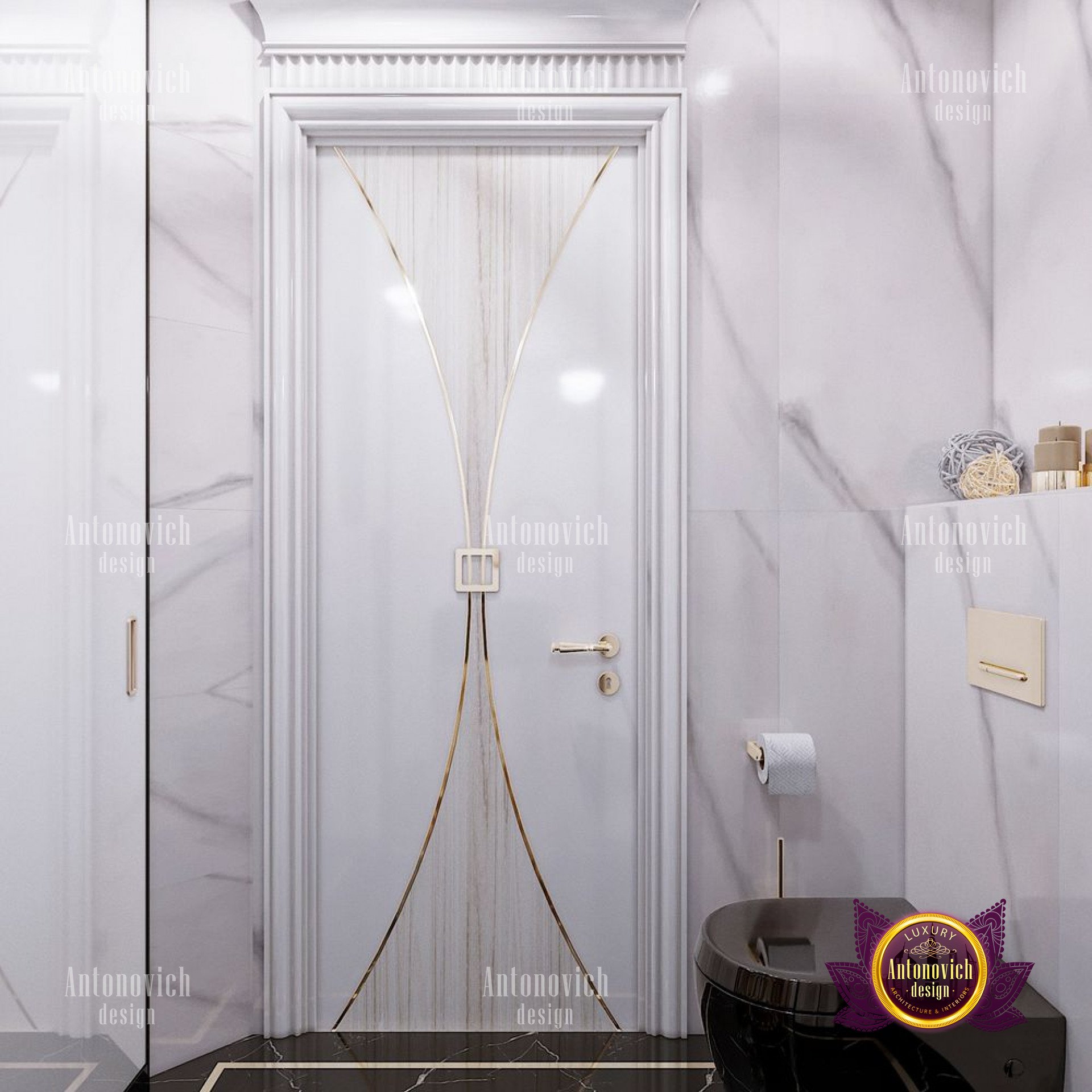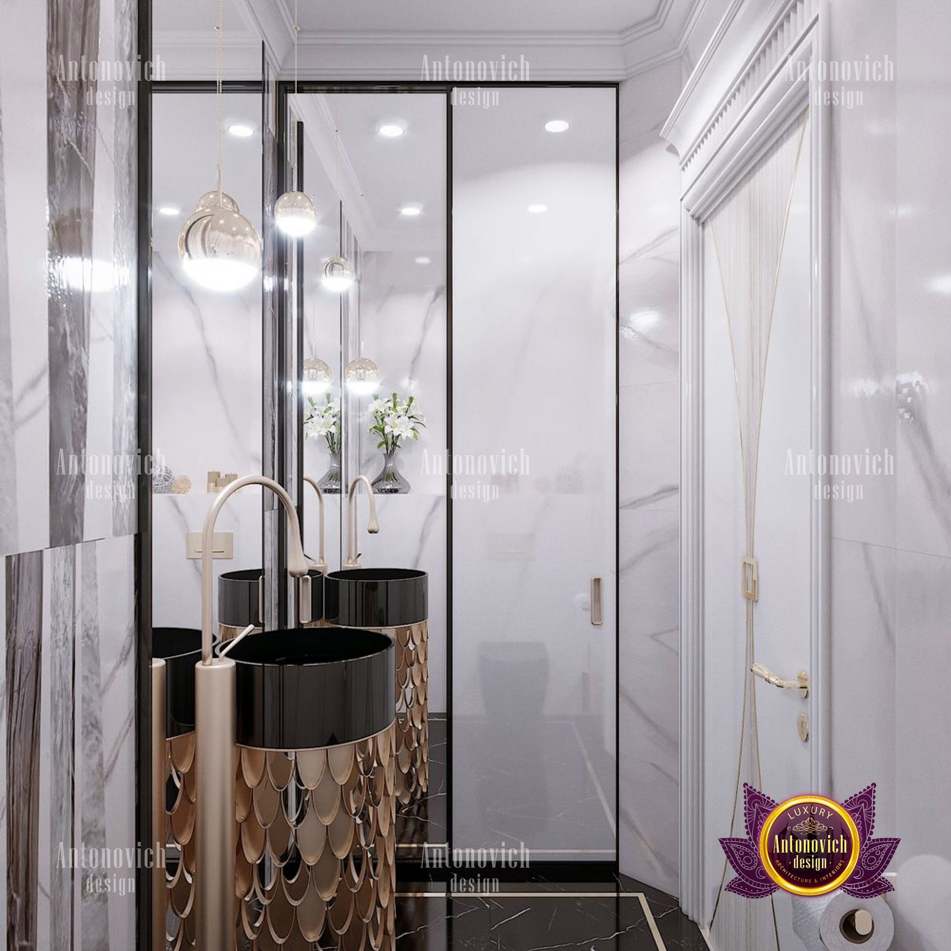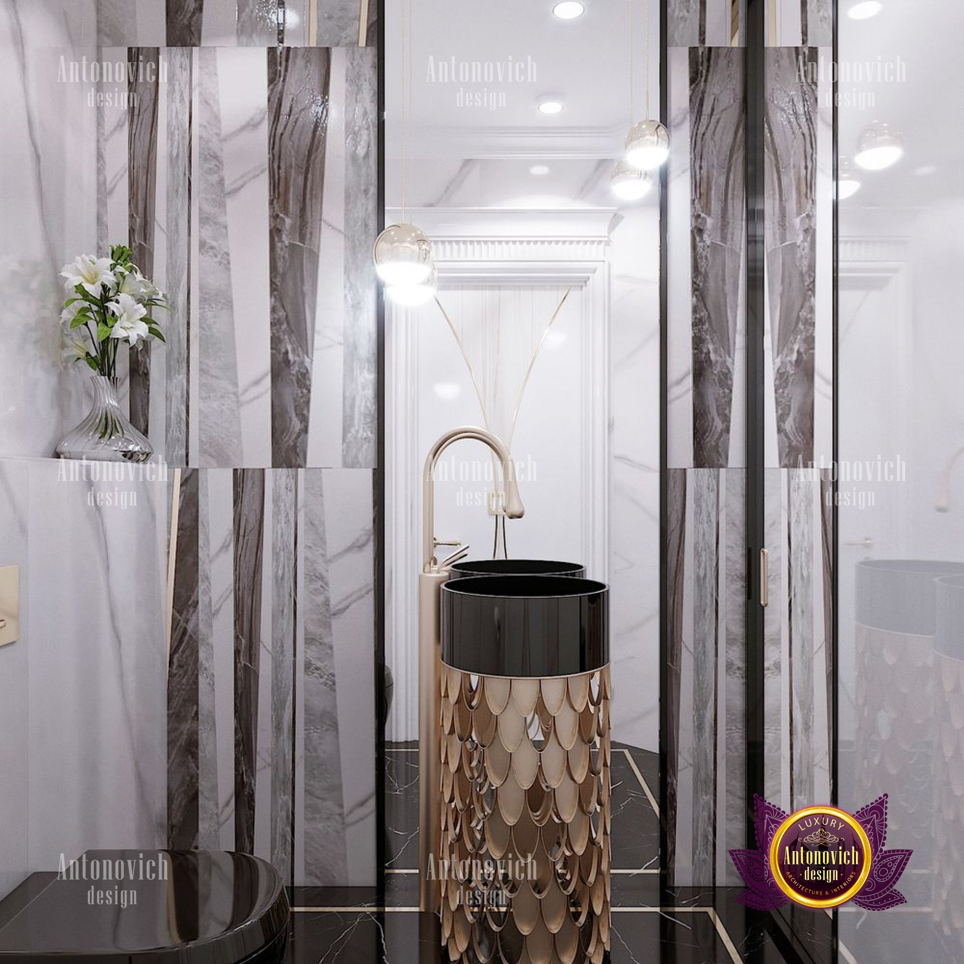 The bathroom is a mix of modern and luxury. The gorgeous gold sink along with its blacktop is such a wonderful sight to see. The marble walls add to the beauty of the room. With its amazing style and balance of luxury and modernity, this stylish apartment design in Dubai will be your dream interior design.