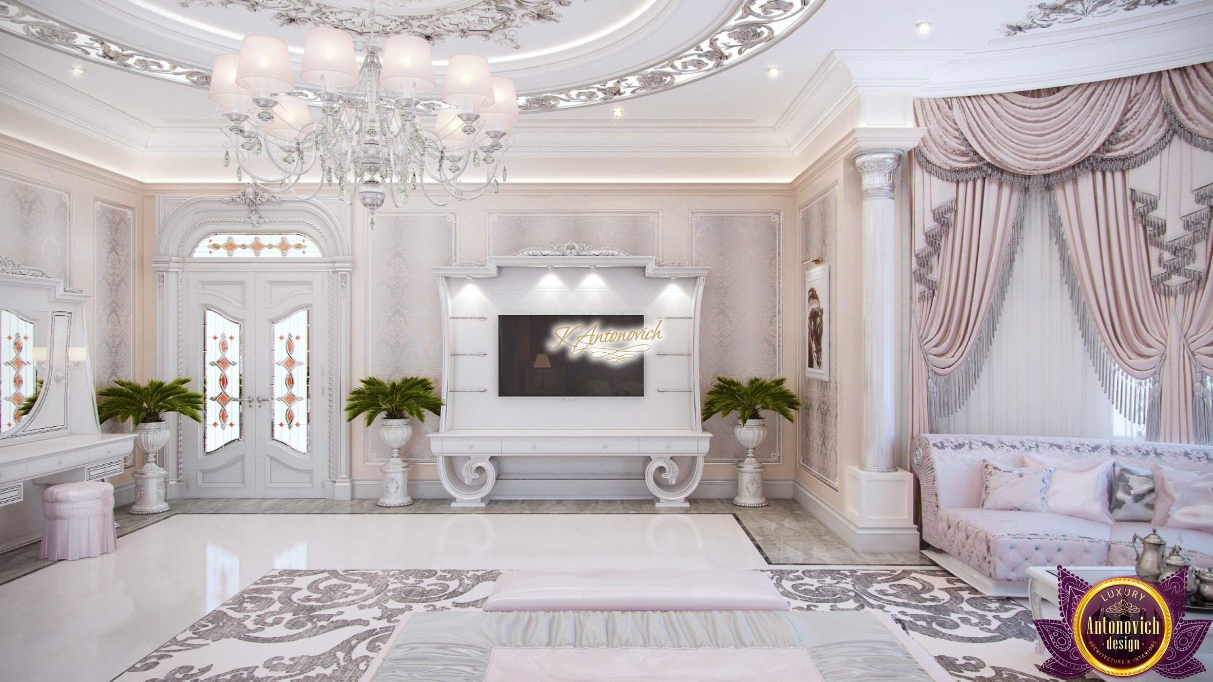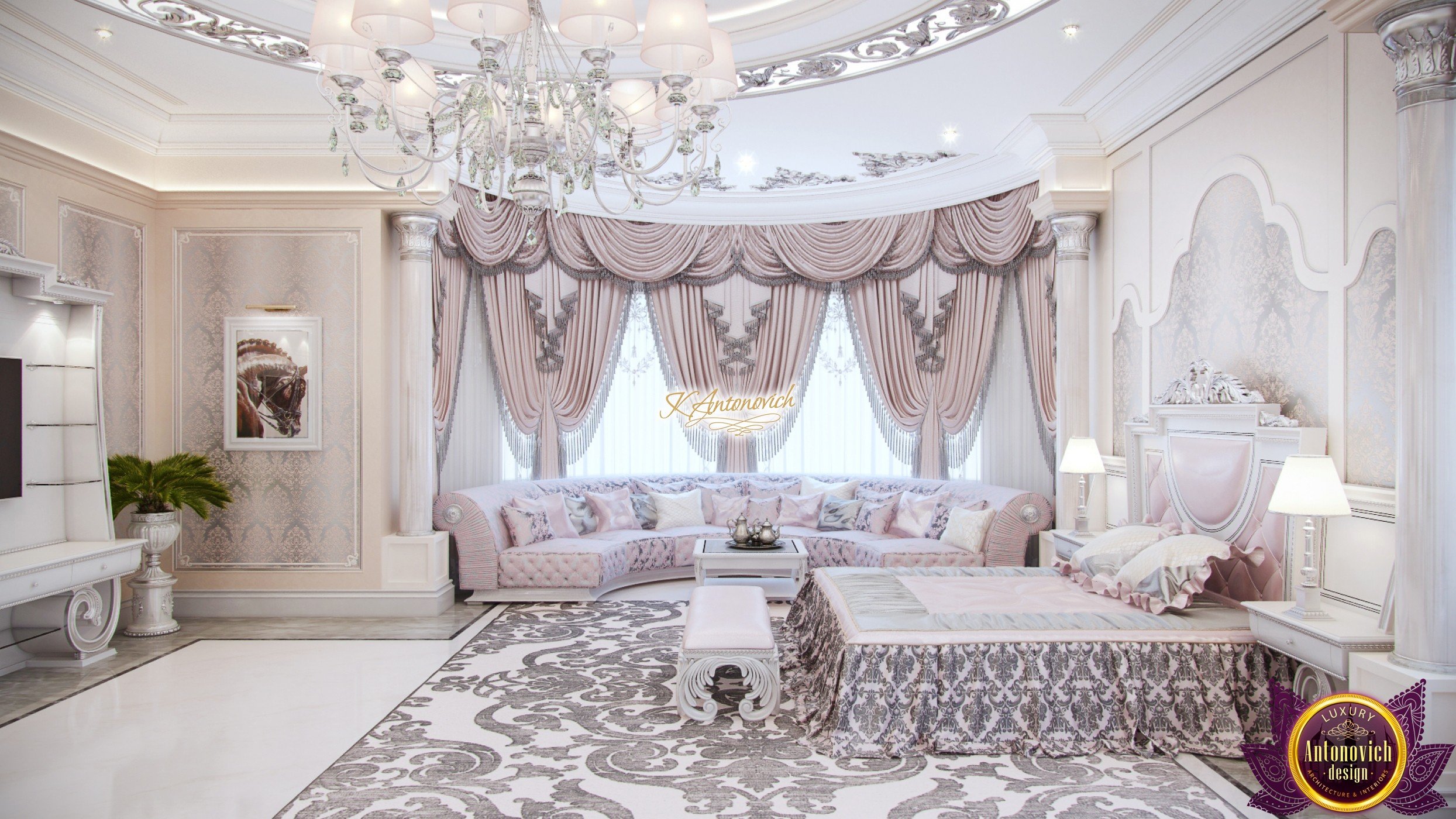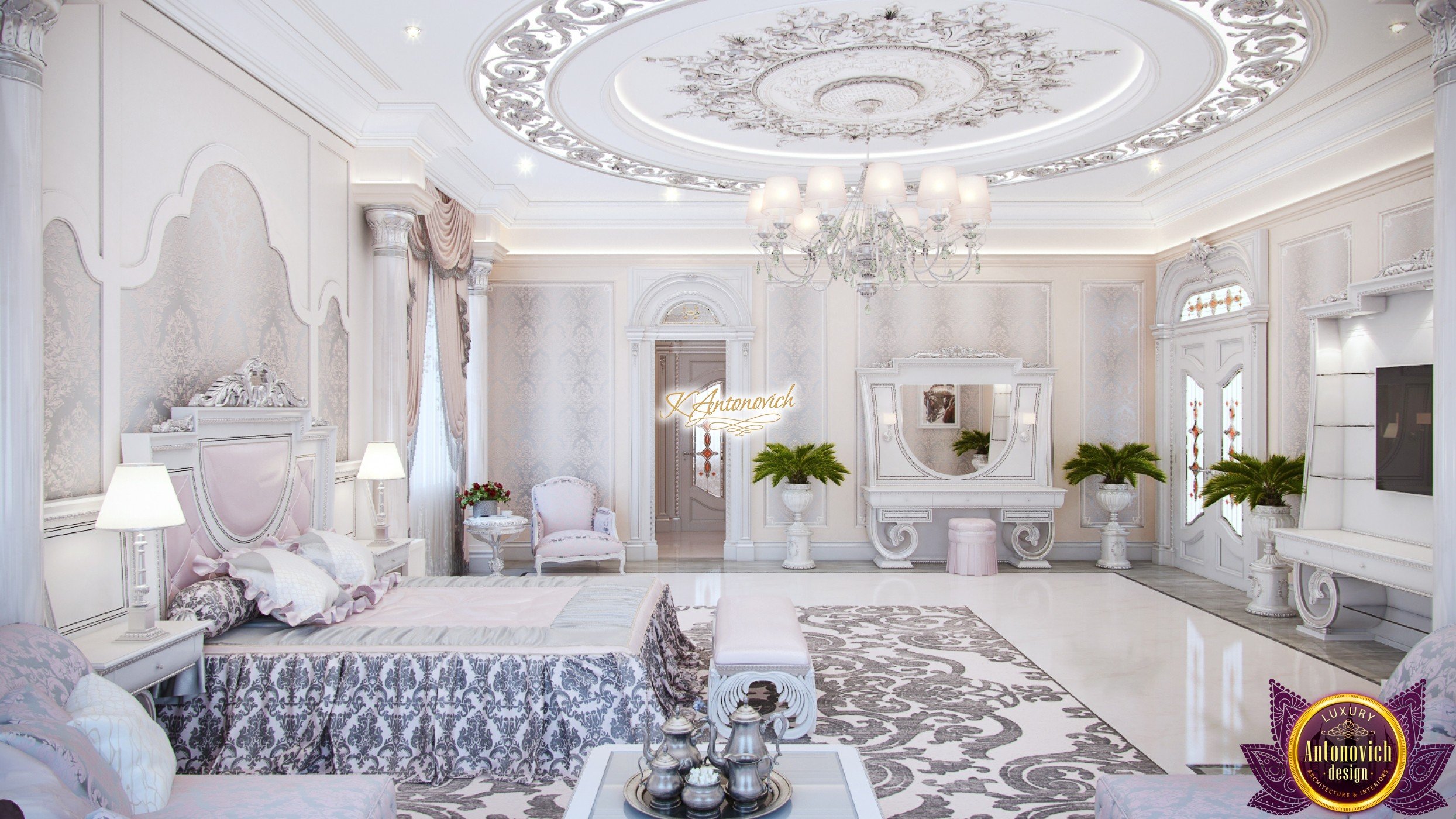 Luxury furniture designs surround this luxury bedroom interior design. The desk, bed, and sofa all have the same design, giving the room a cohesive appearance. This luxurious bedroom interior design does not have a dull vibe. Its the ideal hue for a motif that emphasizes glam. The magnificent chandeliers in the luxury interior design are ideal for the richest. The details in this bedroom are amazing!