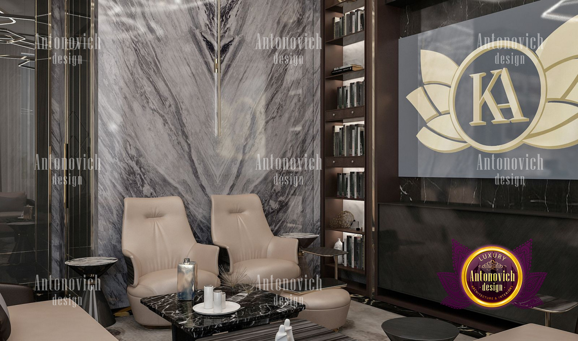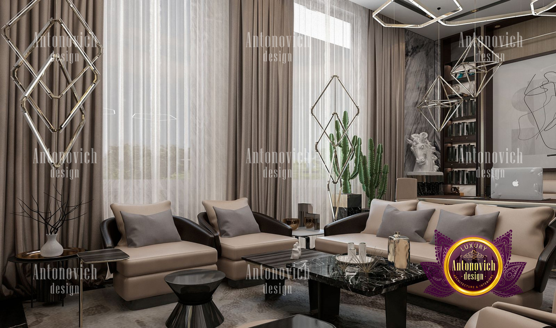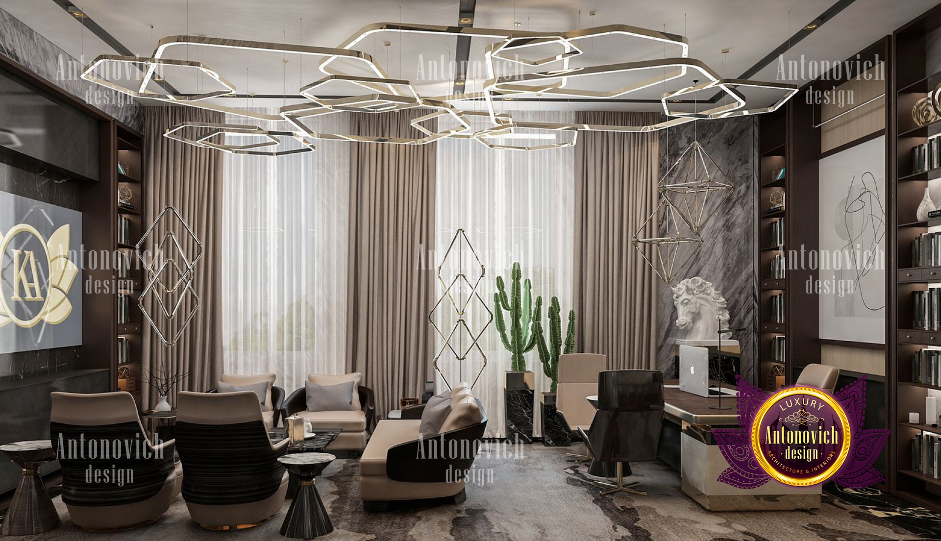 The dark color is the hue of wealth and elegance, and it may give Saudi Arabias interior design a magnificent feel. Depending on the tint, it might be severe or gentle. Luxury Antonovich Design, one of the top interior design companies in Saudi Arabia, has used the stunning hue of dark colors to create luxurious Riyadh home office décor and interior design that will pique your interest. The richness of the room arrangement is enhanced by the gorgeous interior hue. The rich dark colors of the chairs are sophisticated, drawing attention to the fine furniture, while the soft accent of the curtains exudes elegance and gentleness, making it ideal for upgrading your luxury home office décor and interior design.