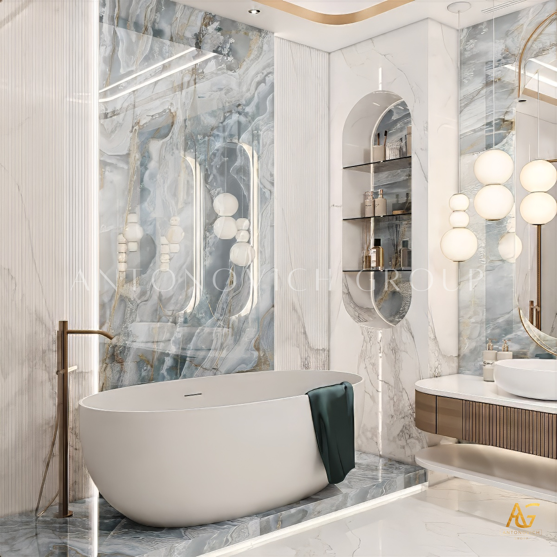 A hallmark of Antonovich Group’s bathroom interiors is the use of premium materials sourced globally. Natural marble, fine ceramic, onyx, crystal chandeliers, and polished metals are carefully selected to achieve both visual beauty and long-term durability.