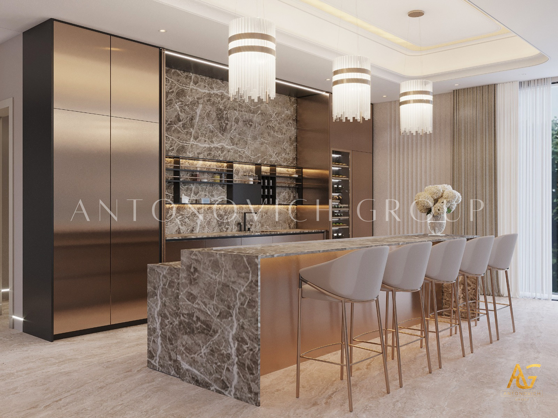 At the core of this project lies a distinctive design philosophy, where every detail is meticulously curated to evoke opulence and sophistication. Antonovich Group's team of seasoned architects and designers approached the villa with a vision to create a harmonious blend of contemporary aesthetics and classic allure. The result is an exquisitely crafted residence that resonates with a sense of grandeur.