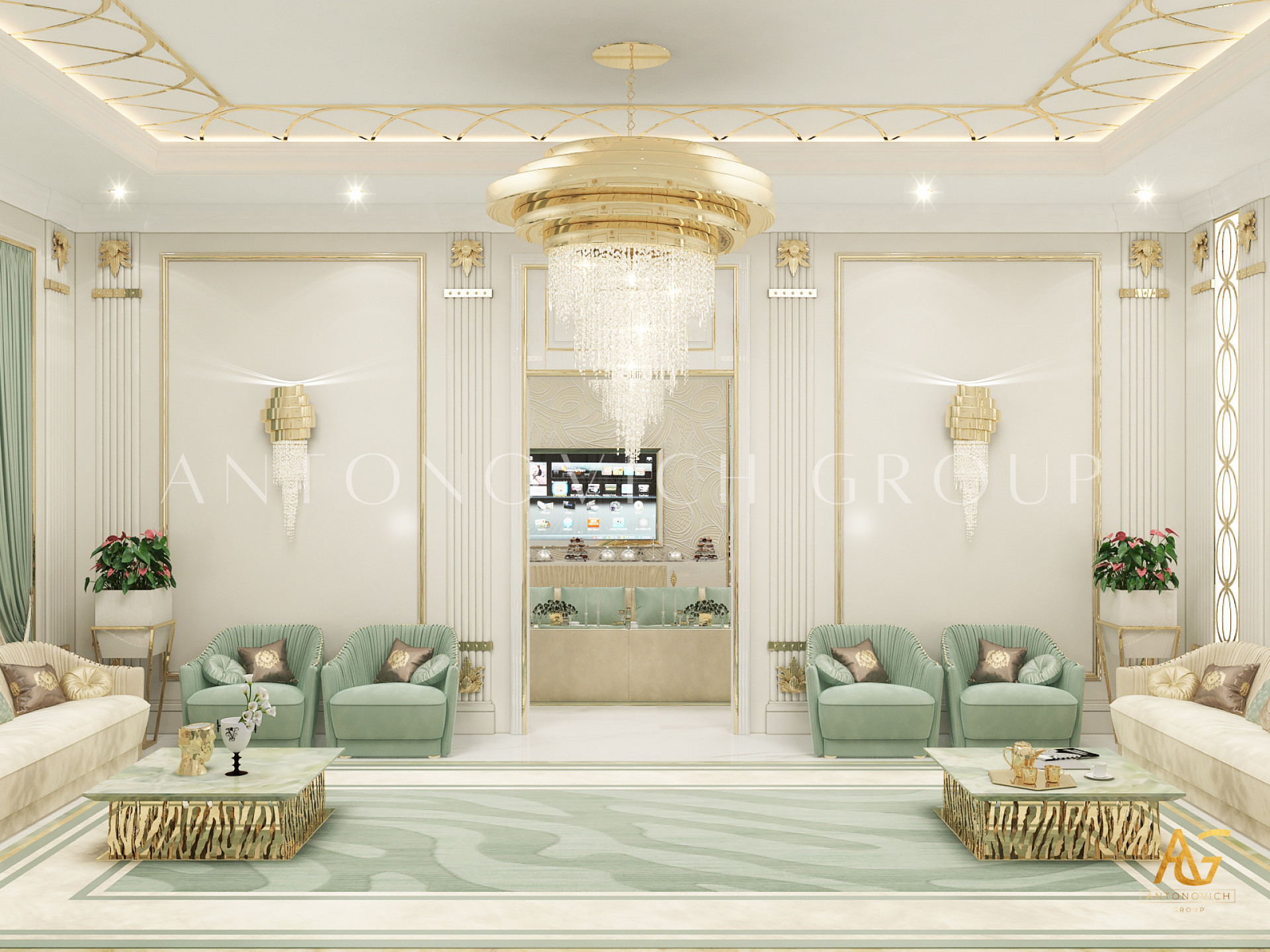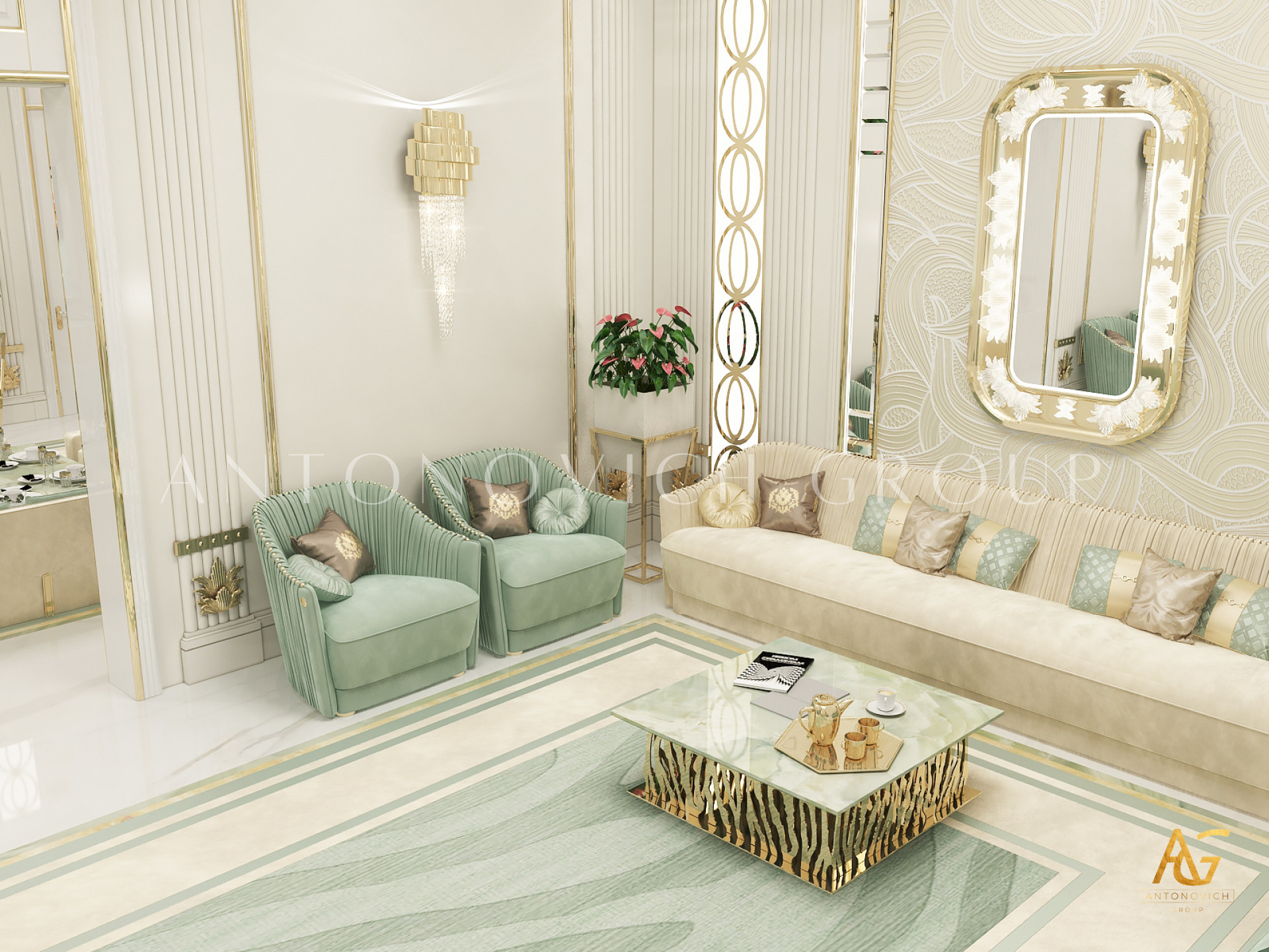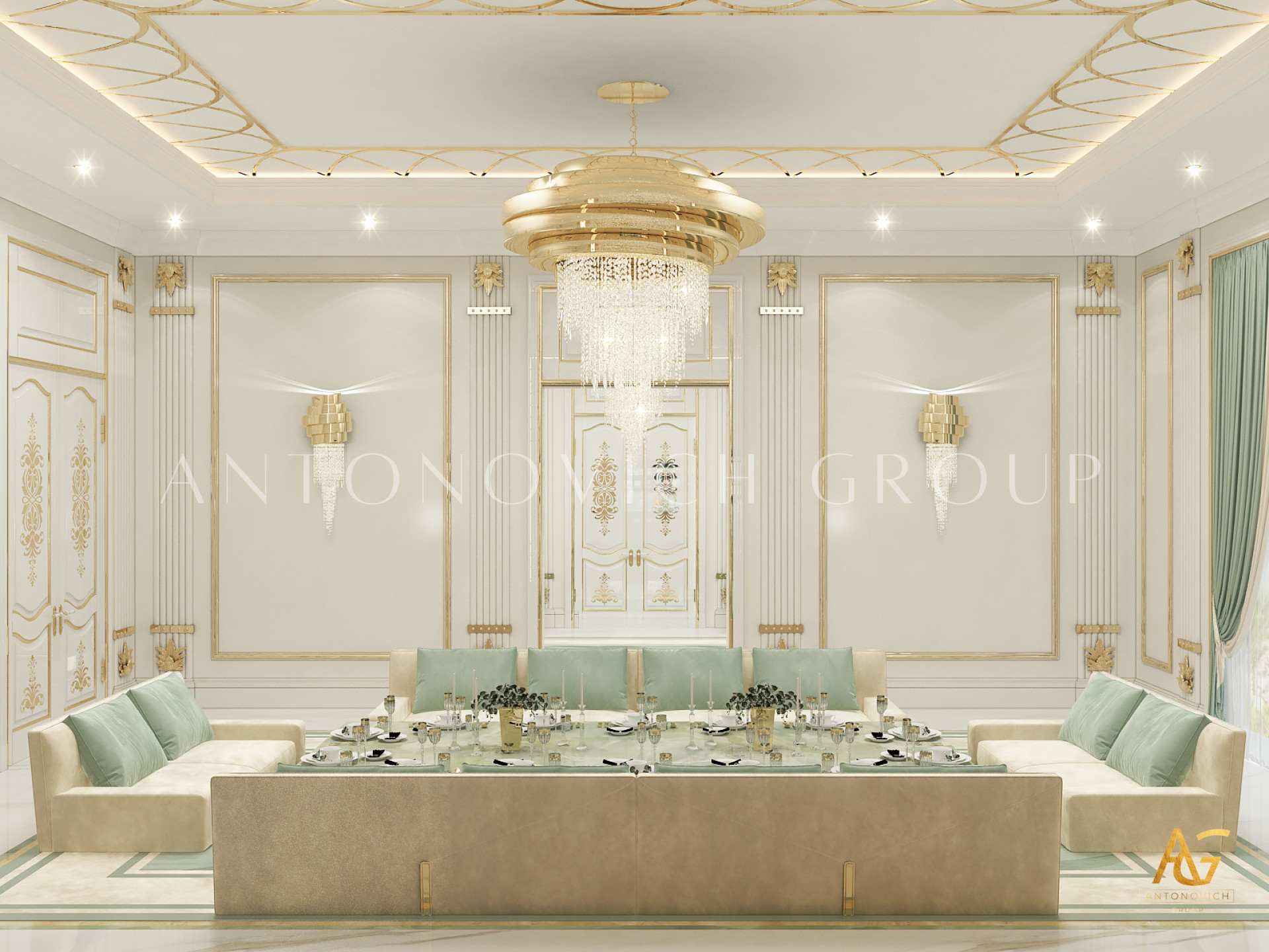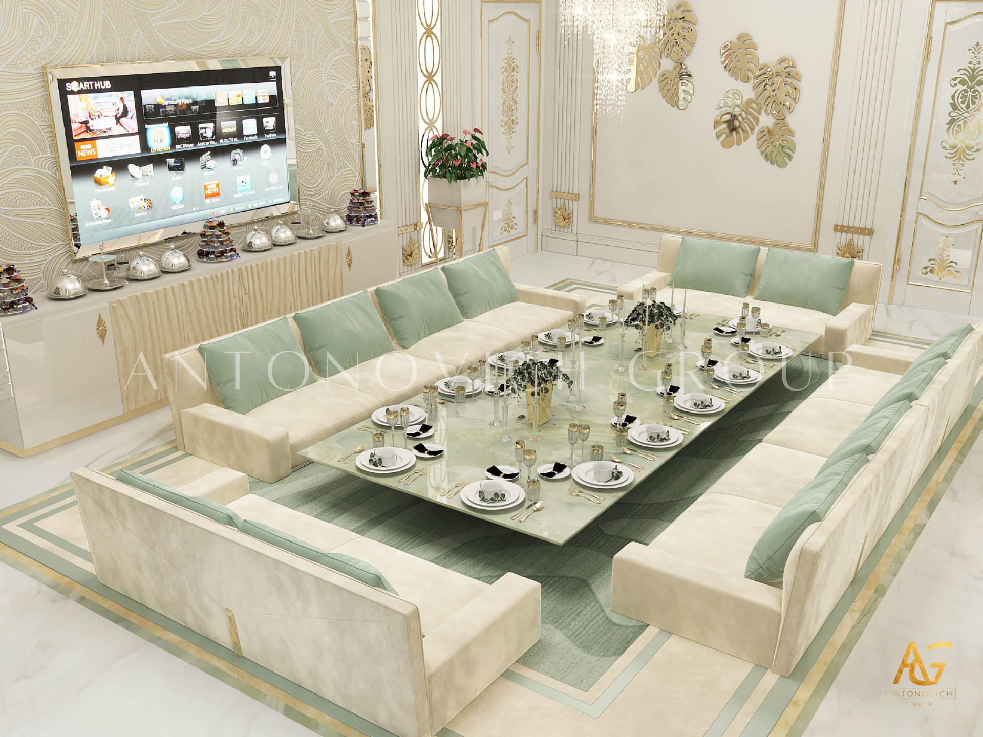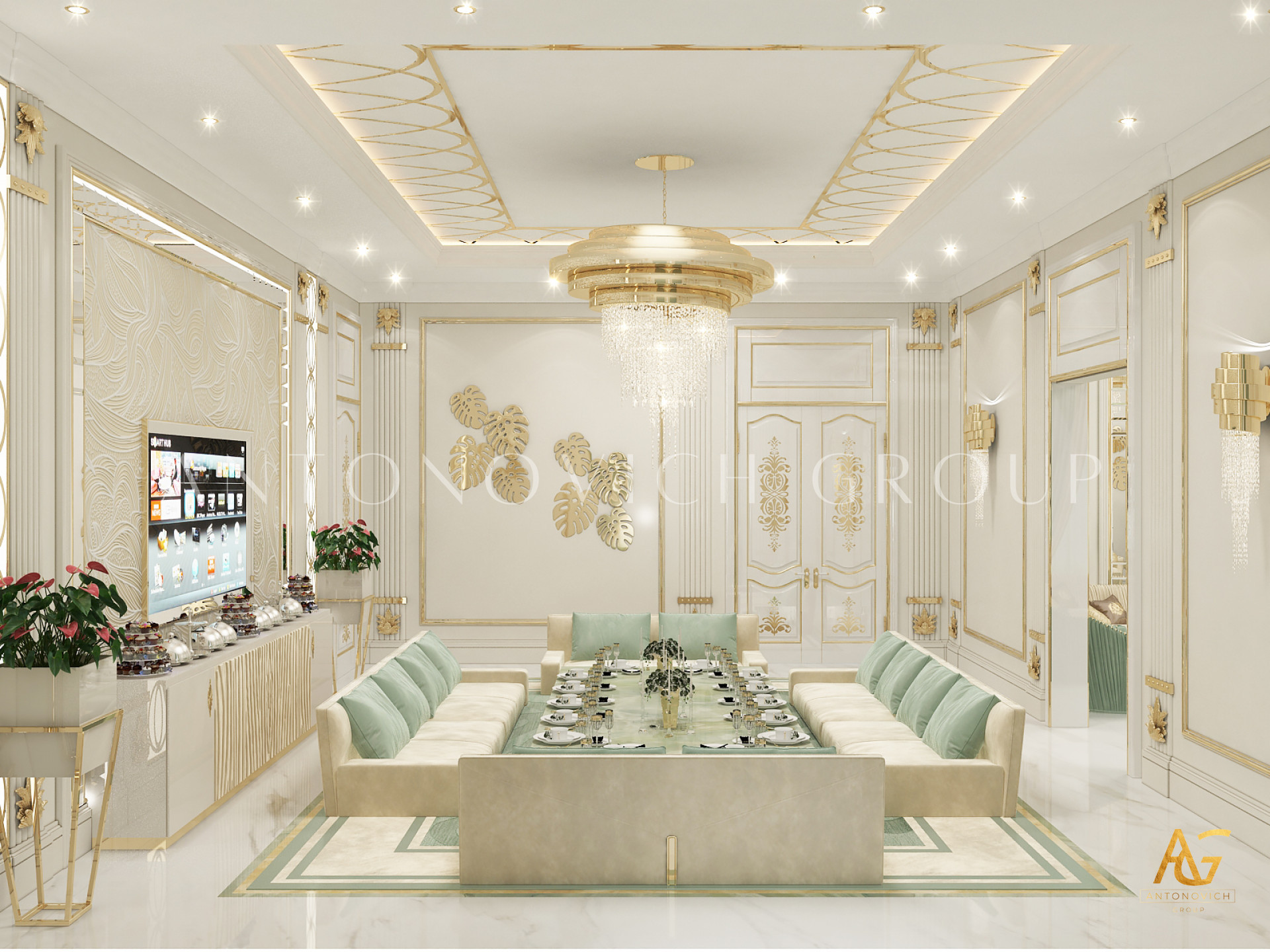Top furniture designs, vast layouts, lavish wall decors, fine furnishings, dramatic colors, and lovely details characterize this magnificent living room design. This Luxury Villa Design Oman living room design places a premium on luxury. Luxury Antonovich Design, OMANs best interior design firm, has produced a modern luxury interior that is ideal for the Muscat lifestyle. The attractively designed rooms have wonderful touches in every corner. With green accents and ample room, the opulent Oman interior design is one of the best in the city. Creating a Luxury Villa Design Oman interior design like this one without the help of the top interior designers in Muscat is difficult. This exquisite Luxury Villa Design Oman interior design was produced in a professional style by Luxury Antonovich Design and its best interior designers in Muscat. The intricacy of the design is lovely, and the dominating color scheme is gold and white. The opulent living area has a consistent theme. The beautiful and elegant furnishings contribute to the modern luxury ambiance. For a Muscat home, a luxury living room interior design is ideal.