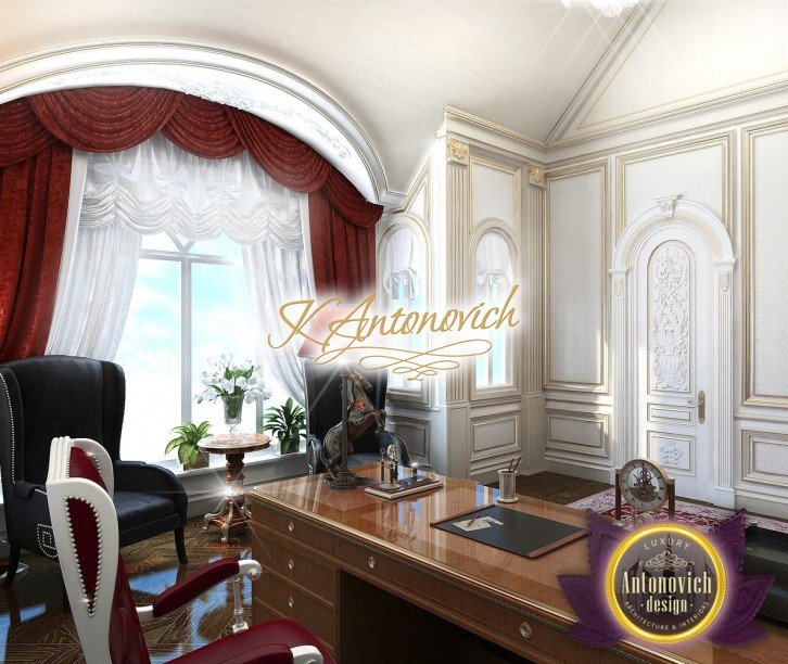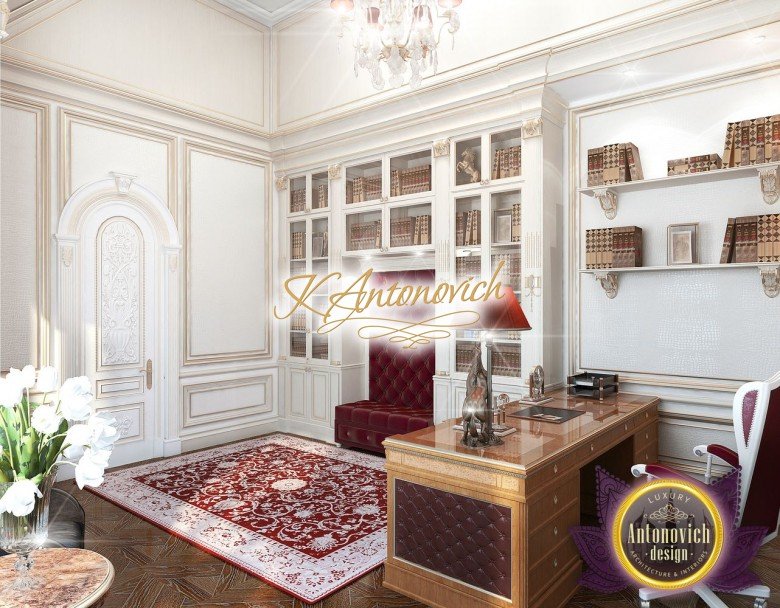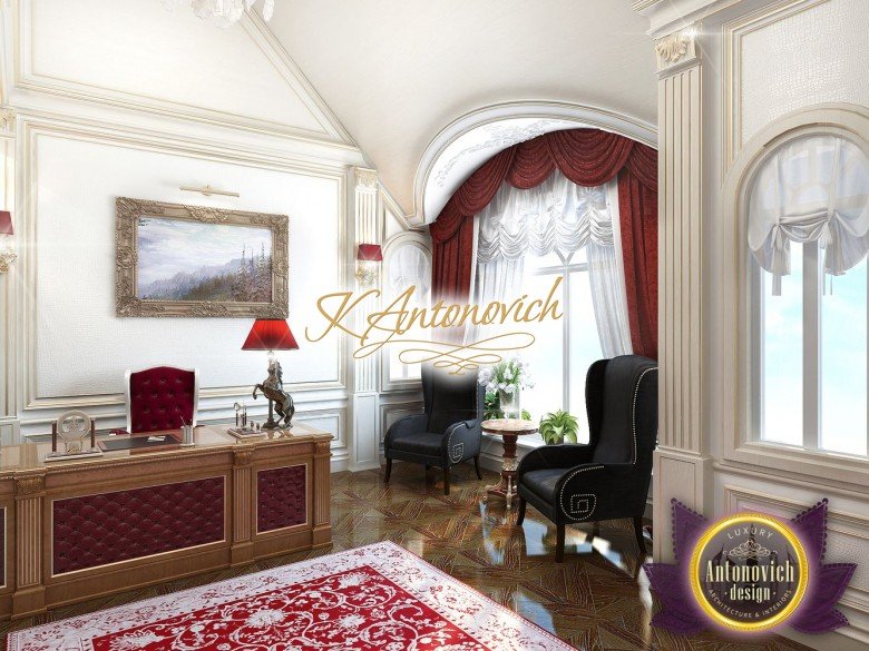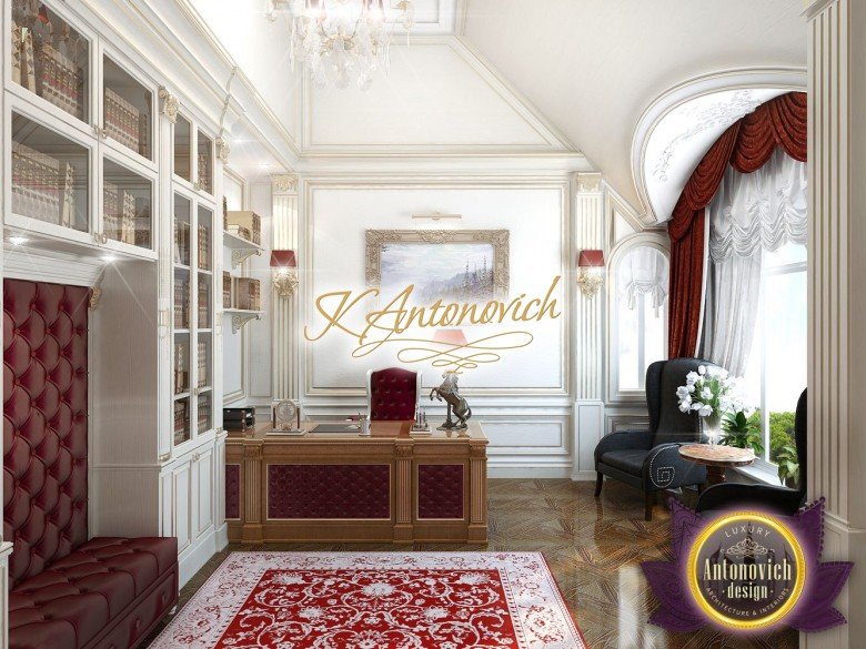 The red luxury interior design has several patterns that make the office a masterpiece. It is like a classic mansion but a luxury office interior decoration. From the carpet to the walls to the furniture, everywhere you look at is stunning classic pieces that complete a beautiful luxury interior design.