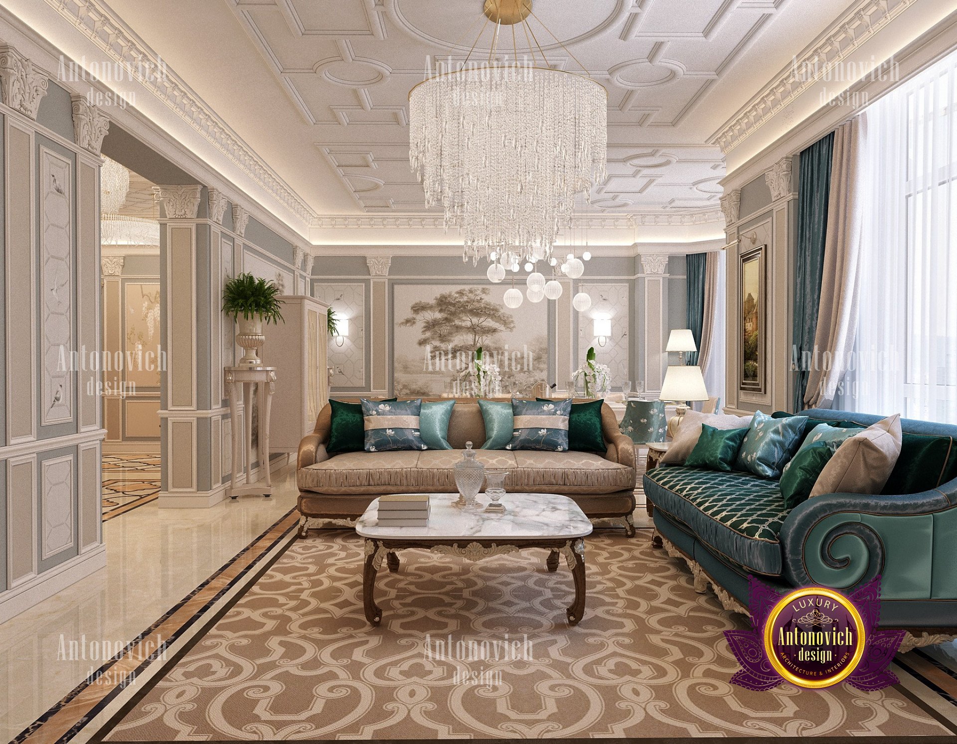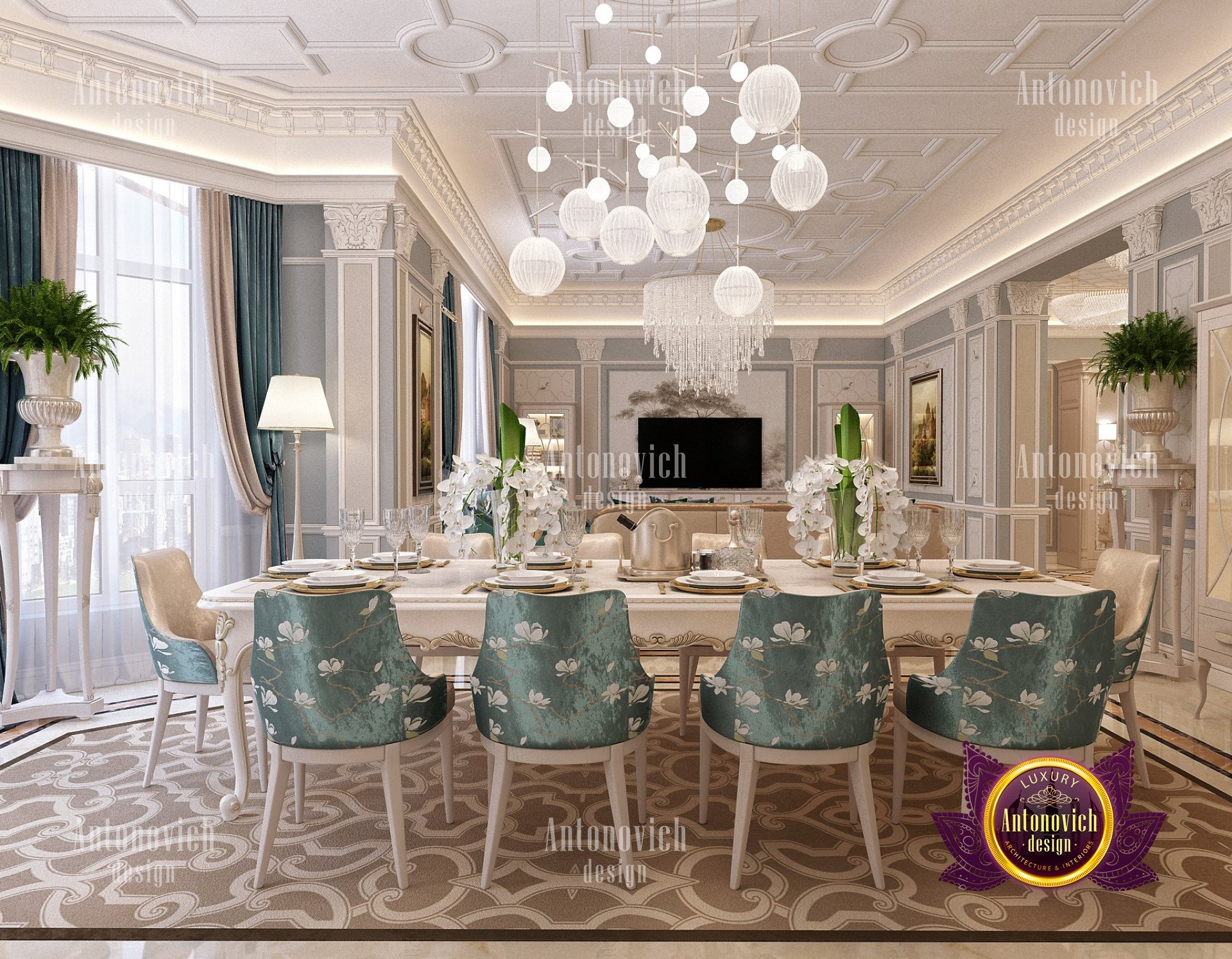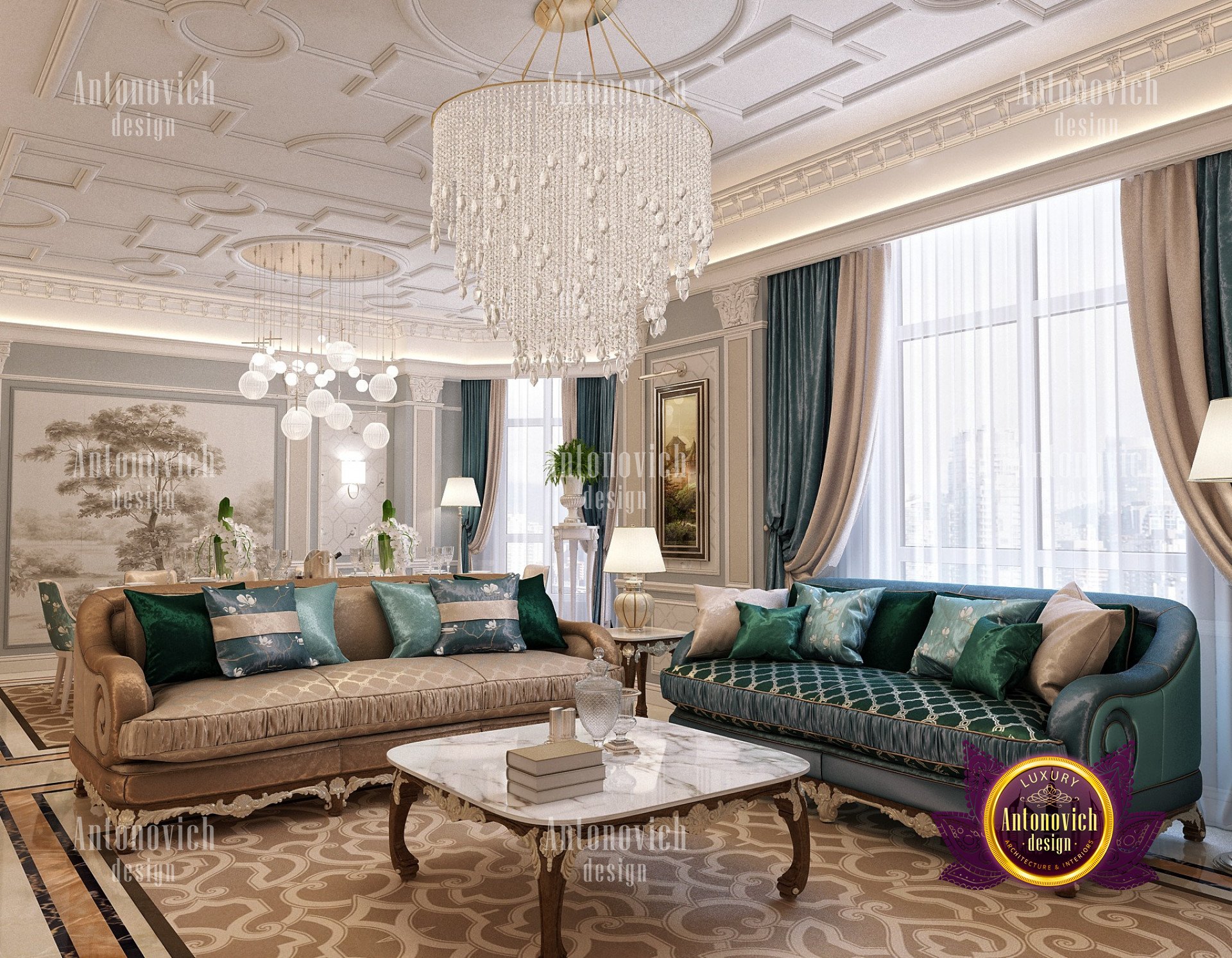 The living room furniture consists of soft chic sofas of elegant emerald and caramel color, the dining area is decorated with beautiful chairs in light turquoise tones, located around the perimeter around the table. The completeness of the picture adds a small square coffee table on a low basis. Creative and stylish chandeliers with crystal pendants complete the stylish design, adding to the atmosphere of the original zest.