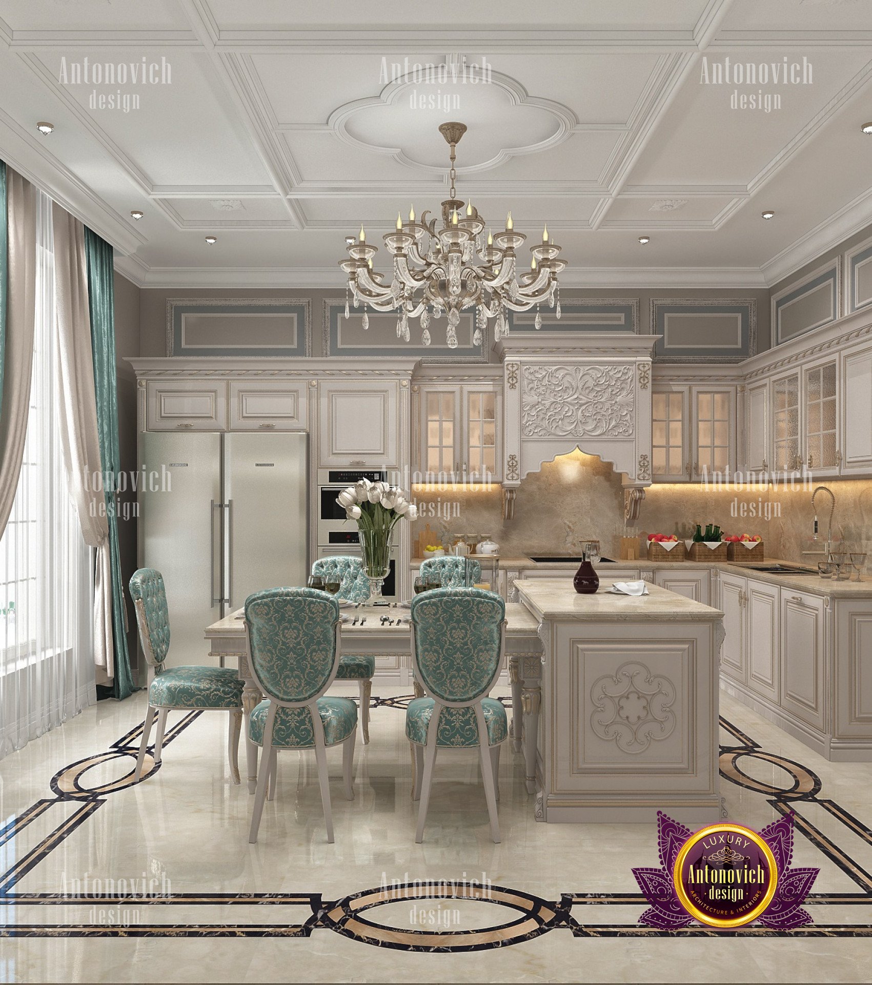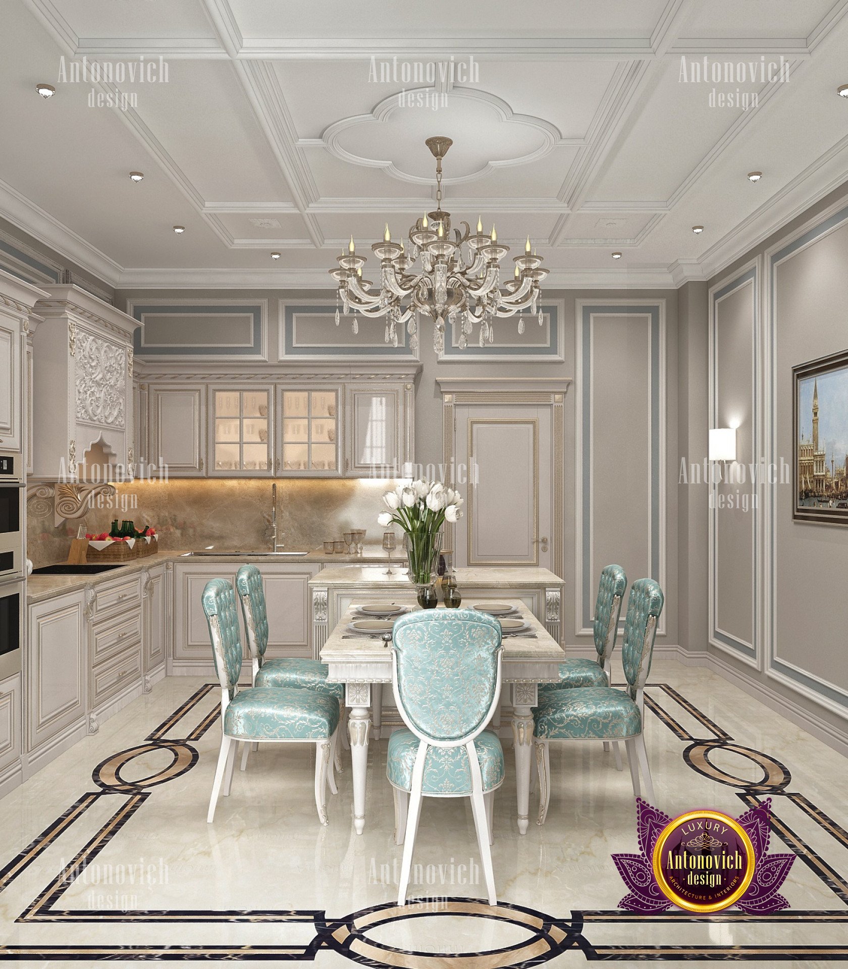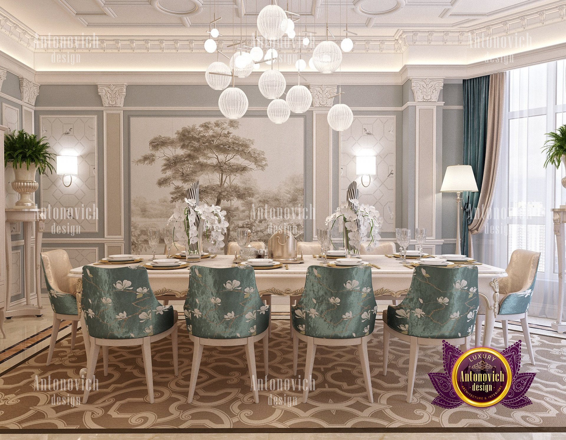 The living room furniture consists of soft chic sofas of elegant emerald and caramel color, the dining area is decorated with beautiful chairs in light turquoise tones, located around the perimeter around the table. The completeness of the picture adds a small square coffee table on a low basis. Creative and stylish chandeliers with crystal pendants complete the stylish design, adding to the atmosphere of the original zest.