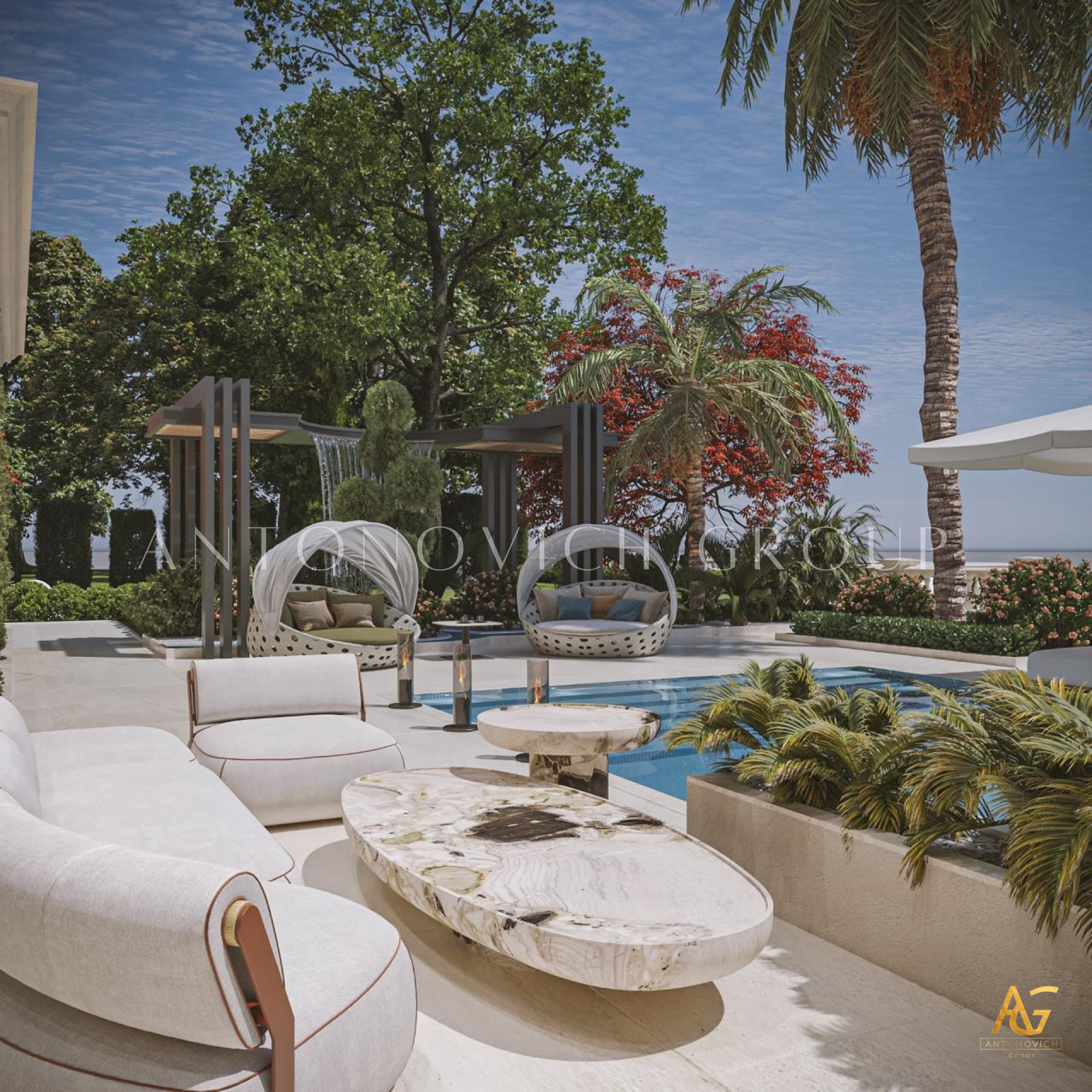 Antonovich Group is a reputable exterior renovation company in Dubai that will work closely with homeowners to understand their specific needs and create a customized renovation plan that meets their budget and style preferences. Our expert renovation team also handles all aspects of the renovation project, from obtaining necessary permits to coordinating with subcontractors, to ensure that the project is completed on time and within budget. This Exterior renovation services for Jumeirah Golf Villas in Dubai can also include the installation of new outdoor living spaces, such as decks, patios, or pergolas, which can be the perfect way to enjoy the beautiful weather in Dubai. Antonovich Group has featured a very special wall plant and vines effect that emphasizes the beauty and sophistication of the exteriors.