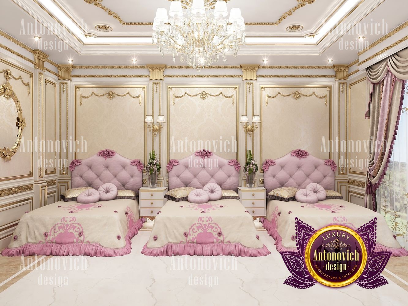 This luxurious bedroom interior design for girls is part of an expensive villa design project in Lagos. The entire house is filled with the most glamorous and expensive decoration and furniture set up as it has a classical interior design concept. Even this bedroom is being required to have feminine touches of style, Luxury Antonovich Design still manages to create very luxurious details of gypsum, walls, ceiling, and even every selection of lighting, chandeliers, and decorations to sustain a consistent interior design mood for the expensive villa design which has a classical concept. There is a three single bed in this room which has been perfectly arranged in the right and balance alignment having an equally beautiful and stylish bed arrangement. A very stylish gold detail has been performed as a very special accent towards the walls and ceiling which perfectly matches with the lighting and chandelier design. Luxury Antonovich Design has selected the finest fabrics which are made up of premium class materials and design for the linens and bedsheets as well as for the curtain and shades.