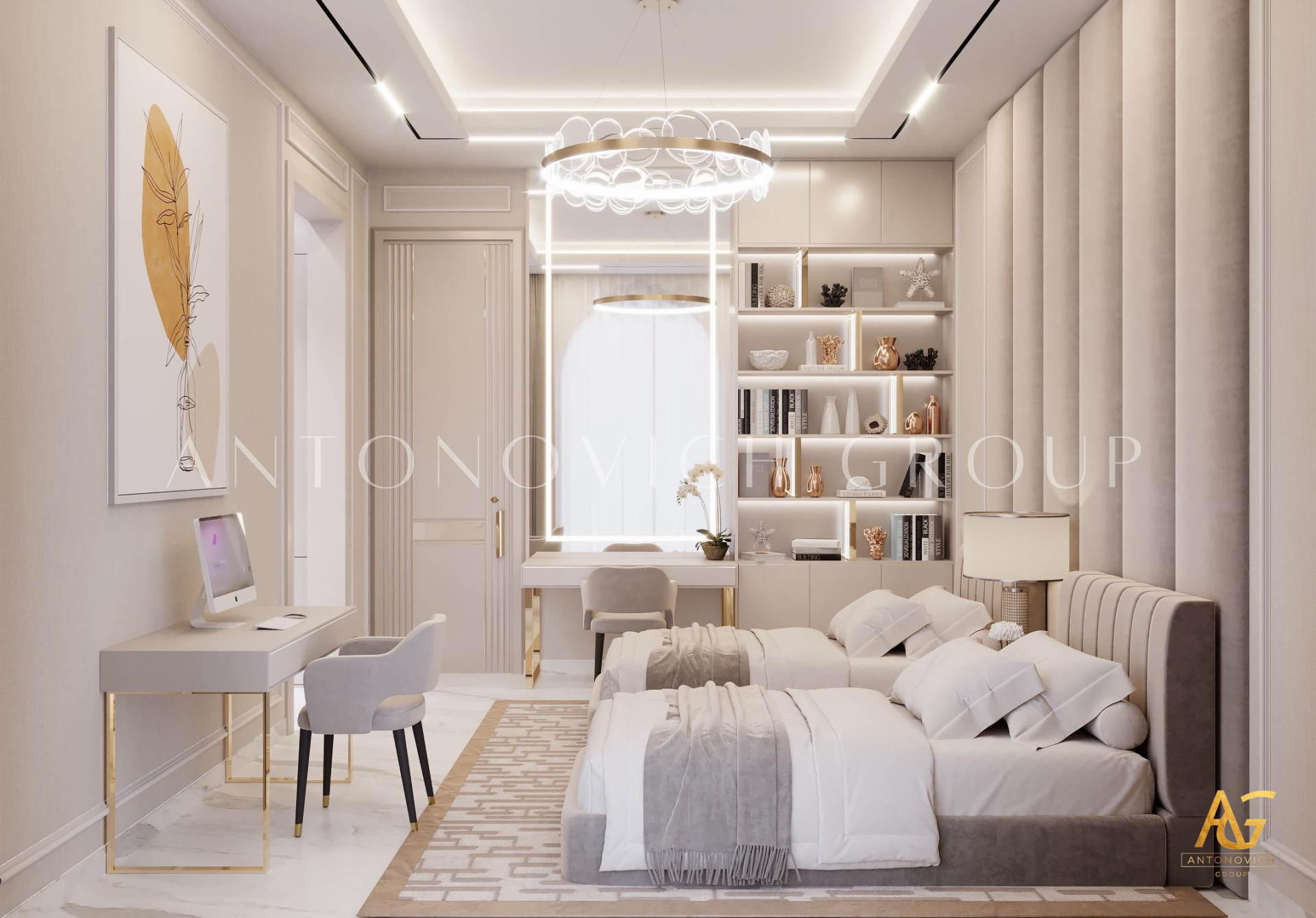 The fantastic television rack is one of the most distinctive characteristics of this luxury childrens bedroom interior design. The TV rack is triangular in the middle with little triangles on each edge. The illusion adds a lovely atmosphere to the luxury childrens bedroom interior design. It also includes a lovely and soothing sofa in the middle and tiny seats alongside it. The arrangement is thoughtfully constructed, so relaxing here is wonderful.