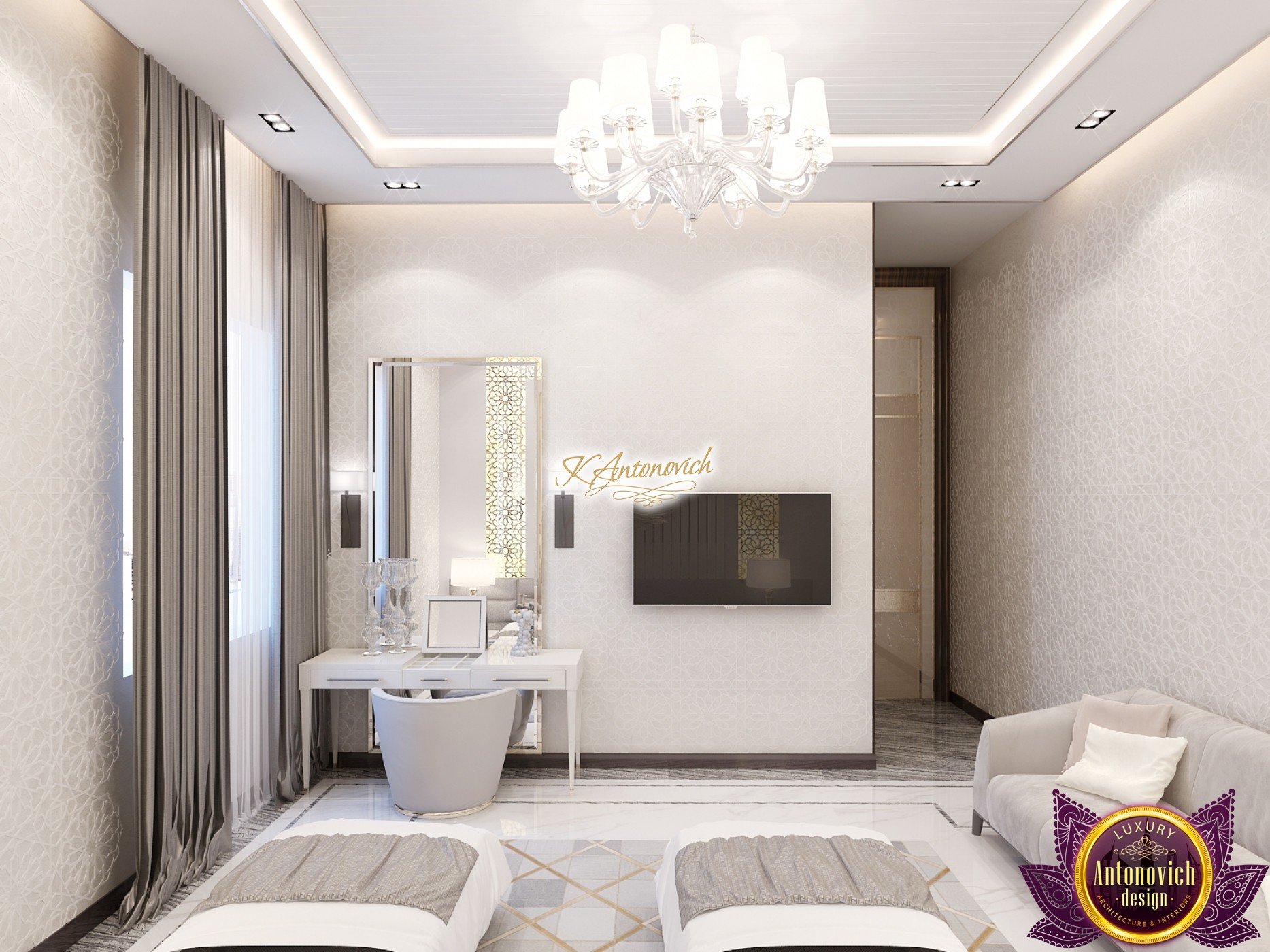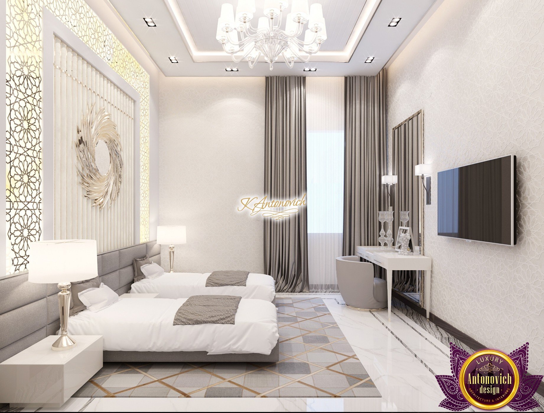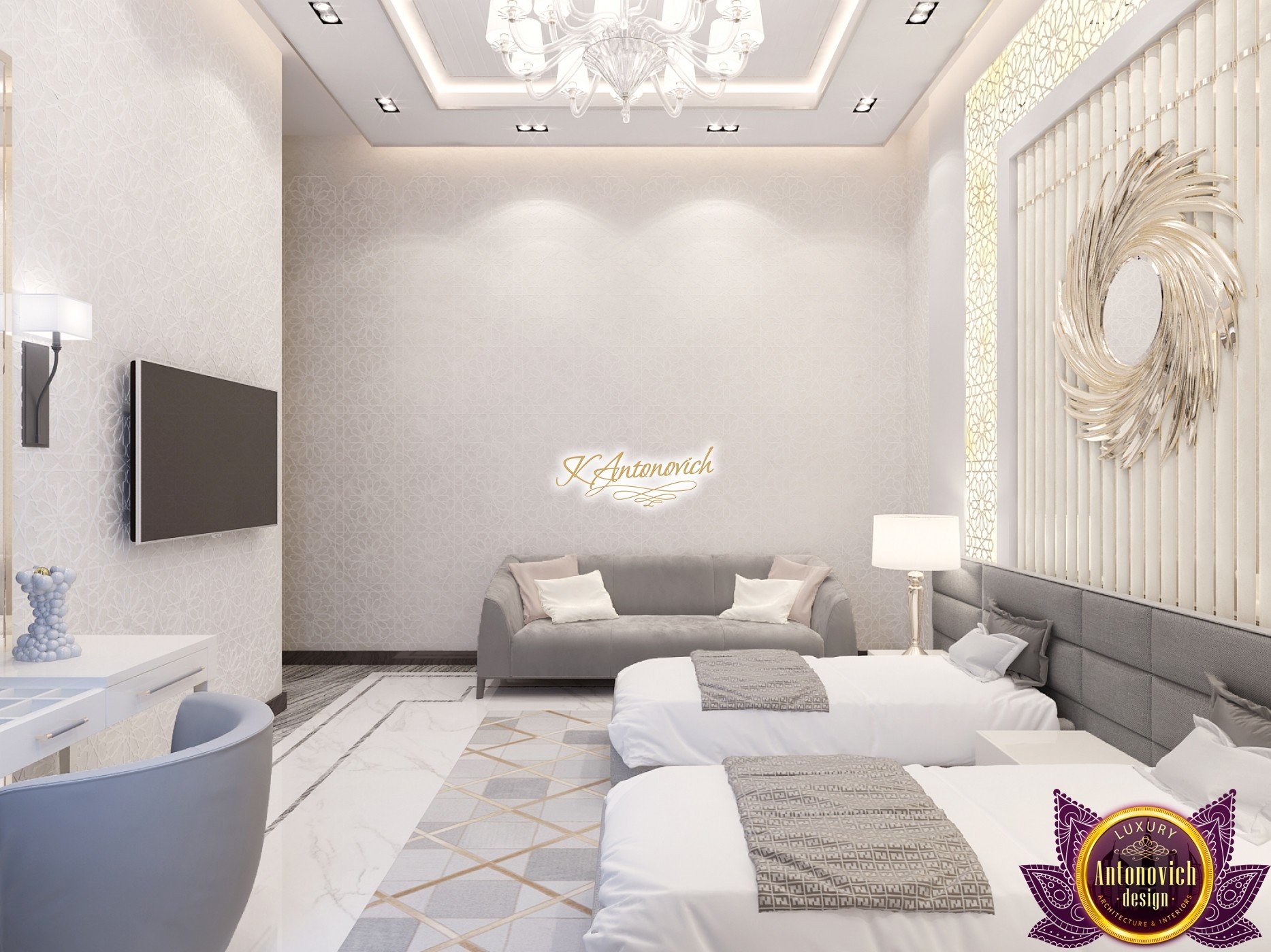 Very harmonious and integral image of the interior in the style of modern classics created by Luxury Antonovich Design Studio designers for a child's room in a luxury apartment.Two sons of the apartment owners, aged 11 and 12 years got very warm and cozy atmosphere for relaxation. The interior of the children's bedroom is dominated by a light range of gray, white and silver shades. This interior is perfectly fit for adolescent boys. Their irrepressible energy, which is inherent in this age, in this room will be slightly softened, and children can really relax and unwind in comfortable surroundings.Child's bedroom interior has a very elegant and restrained character. The curtains in the bedroom of plain silver silk are gathered in straight folds and cascade down on the floor of white marble.To make the floor decor more expressive, designers have added thin lines of black marble with beautiful natural veins. Soft natural carpet geometrically ornamented perfectly complements the warm and cozy mood.Two comfortable beds are united by one soft headboard, which is upholstered with textiles of muted shades gray.The basis of walls decor is light-colored wallpaper with textured ornaments.The highlight of this project, of the children's bedroom from the studio Luxury Antonovich Design, became a beautiful decor panel behind the headboard. The panel is framed by a stained glass cloth with backlight through the exquisite patterns.The ornamental motifs on the stained glass repeat exactly the wallpaper pattern. This makes the space very solid, harmonious and aesthetically perfect.