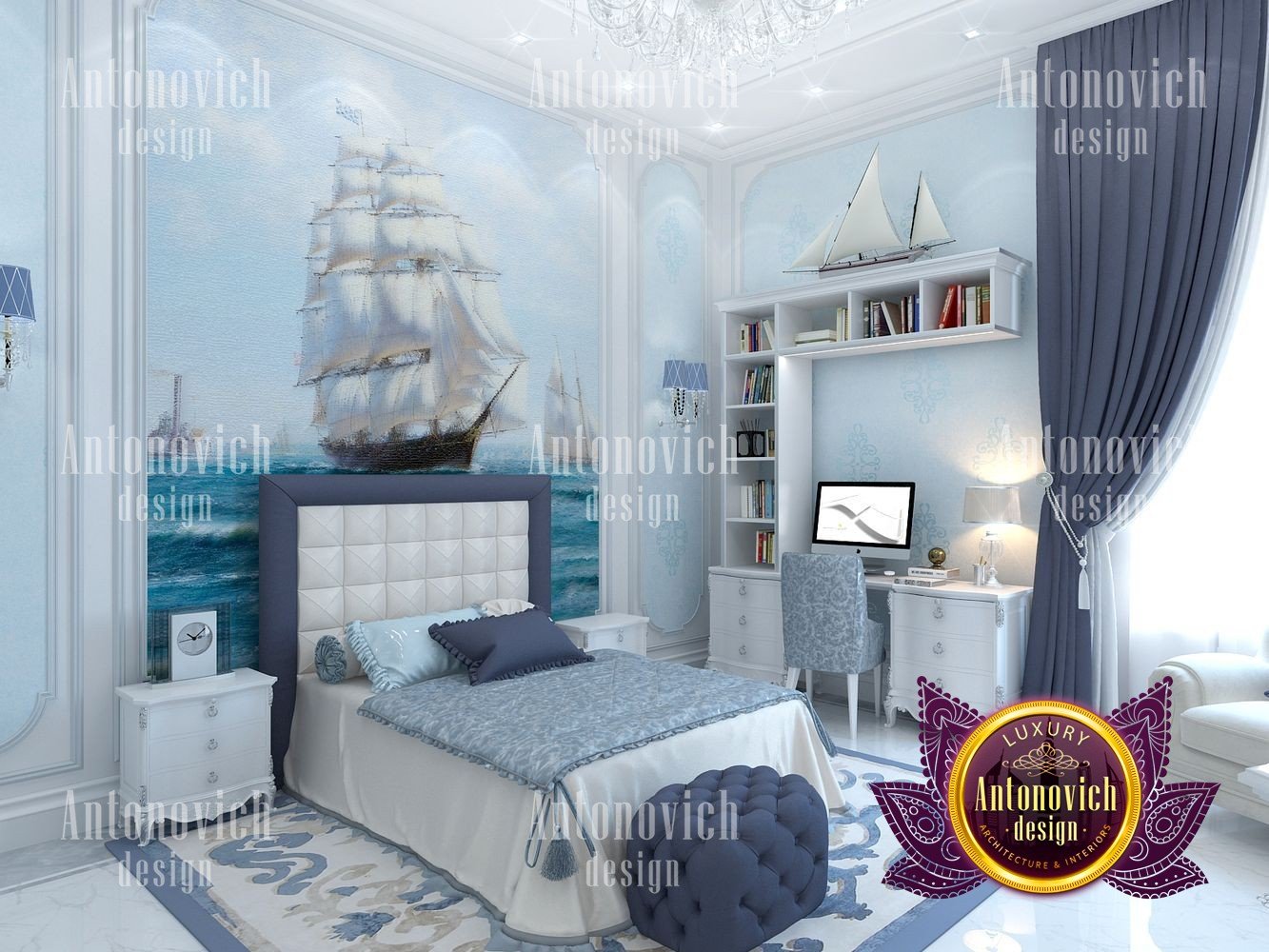The childhood, the length of about sixteen years (it is precisely such boundaries that scientists place) can be conditionally divided into several quite different periods. And the design of the interiors of children's rooms takes into account the characteristics of each period. That's the only way you can create the ideal environment for your child. Designers of the studio Luxury Antonovich Design offered a concise modern style for the eldest son of the owners of an elite apartment in Dubai aged 14 years. In a relatively small space, the authors of the project succeeded in combining the sleeping area and the study area in such a way that the child felt absolutely comfortable at every moment of stay in his room. This children's room design demonstrates how versatile can be a modern style with a touch of minimalism. This multifaceted interior, designers expressed with the help of a combination of a contrasting range of hues, from a light palette to bright blue colors. Also, interesting is the decoration of the walls behind the bed headboard. A 3d volumetric panel of a steel shade with a geometric ornament interestingly plays chiaroscuro and at the same time is wonderfully combined with wood in the decor of the walls. Harmonizes the space a combination of shades in the decor of the walls, the decor of the bed and the decor of the window. So the coverlet on the bed of silk of a silvery shade is combined with the decor of the wall, and the silken cushions of a saturated blue color perfectly repeat the color of the curtains. Furniture, in this case, does not load space. It is extremely functional and ergonomic.