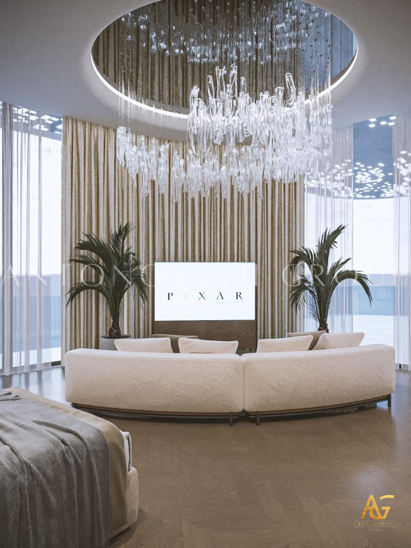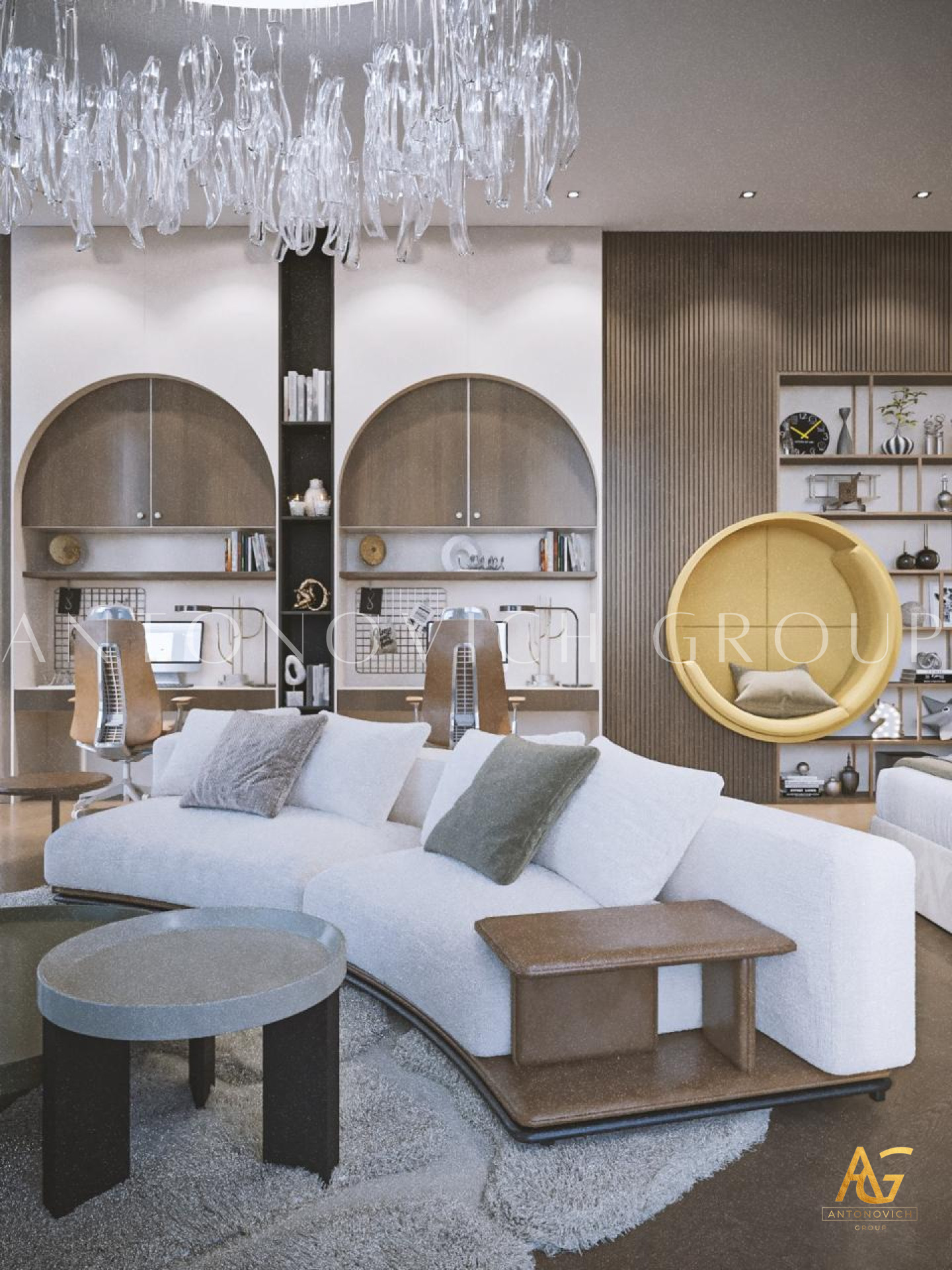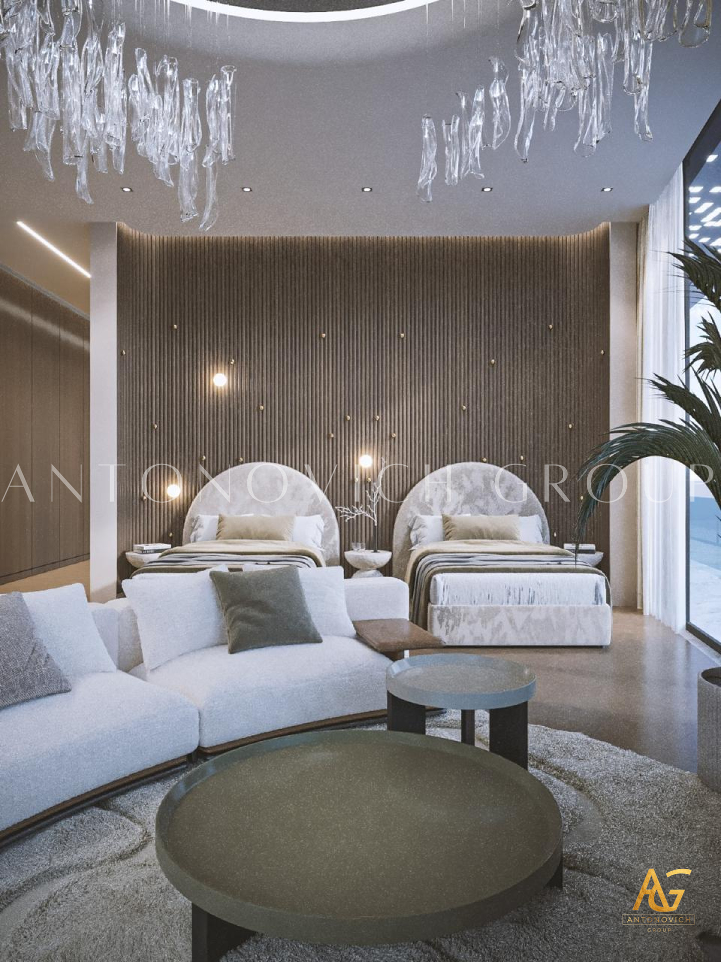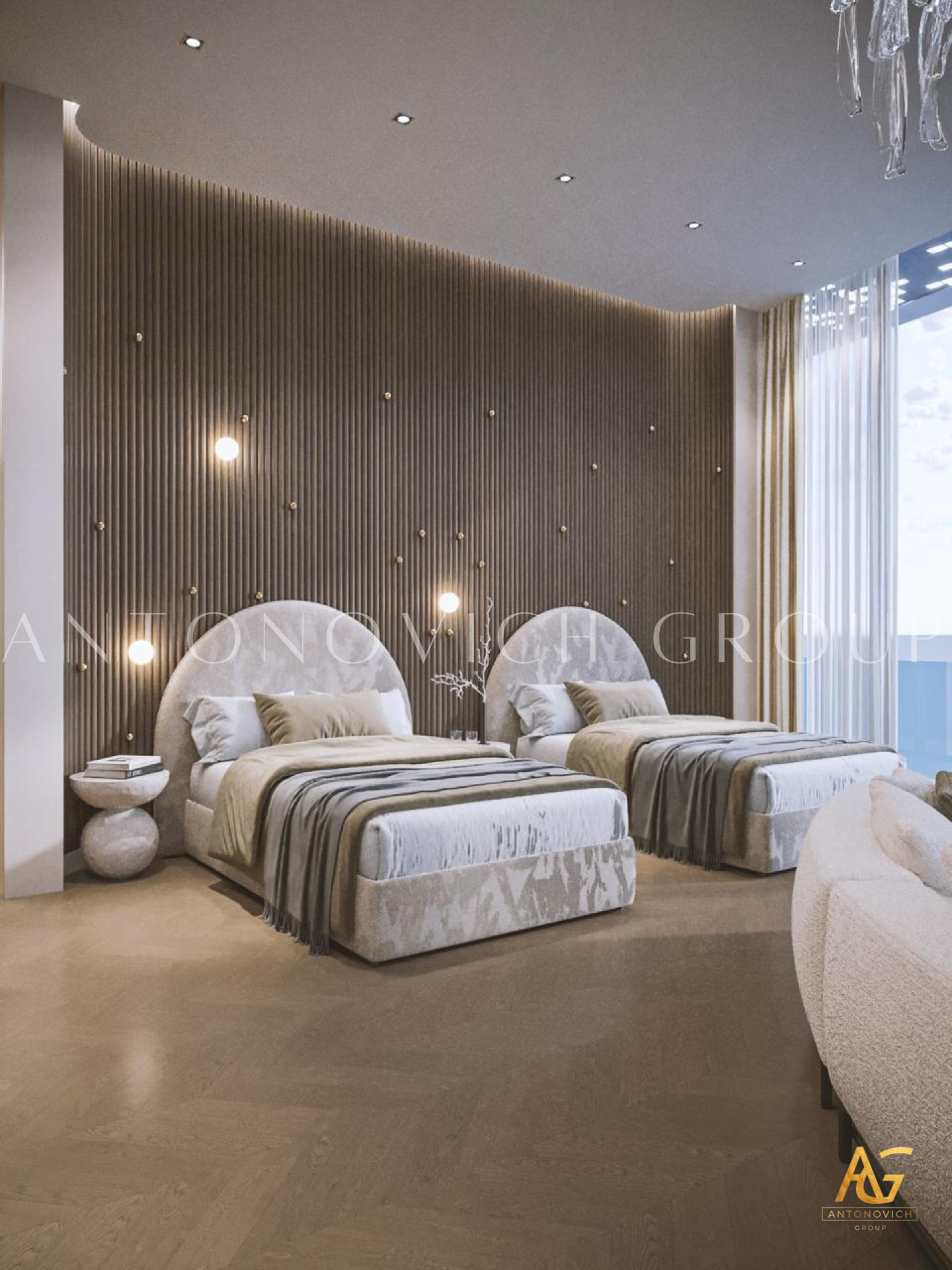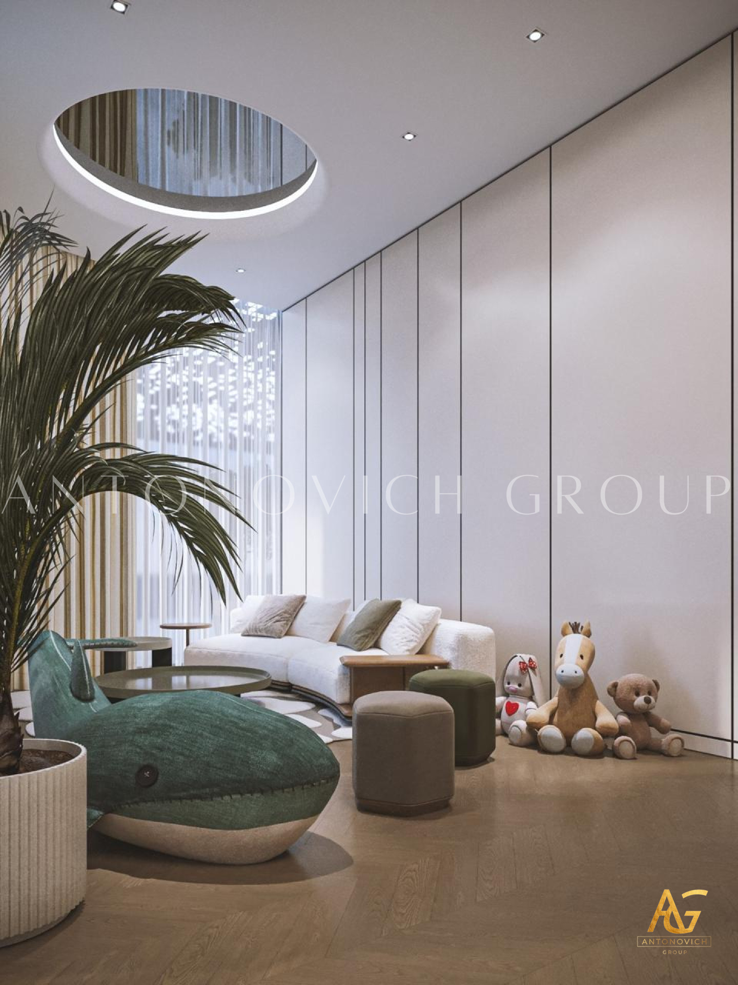 The Luxury Antonovich Designs designers suggested creating a room in which everything obeys the laws of absolute happiness in this project of a childrens room in an elite apartment. The interior has a unique functionality and ergonomics. Designers had to use the maximum imagination so that everything younger son of the apartment owners likes, his favorite toys, books, and souvenirs became an integral part of the cozy interior of the childrens room. A very interesting, practical and quite cozy solution was offered by designers for window decoration. Furniture in the English style became as an extension of the window opening and the walls. Here you can comfortably store all things, and the window-sill it is a desk with all the necessary attributes. The light color of furniture close to ash-gray contrasts very beautifully with curtains made of dark green silk. A small space is very comfortable, cozy and reflects the character and hobbies of the child. Other walls interior designers suggested decorating with special wallpaper from a new collection designed for childrens rooms. The world map on the wall in gentle shades fills the room with the beautiful romantic and dreams. Comfortable looks natural parquet from light wood and a carpet with a light geometric ornament. The main colors of the interior are the pastel. With such a background, the ceiling in the form of a starry night sky with special LED lights looks very rich and bright.