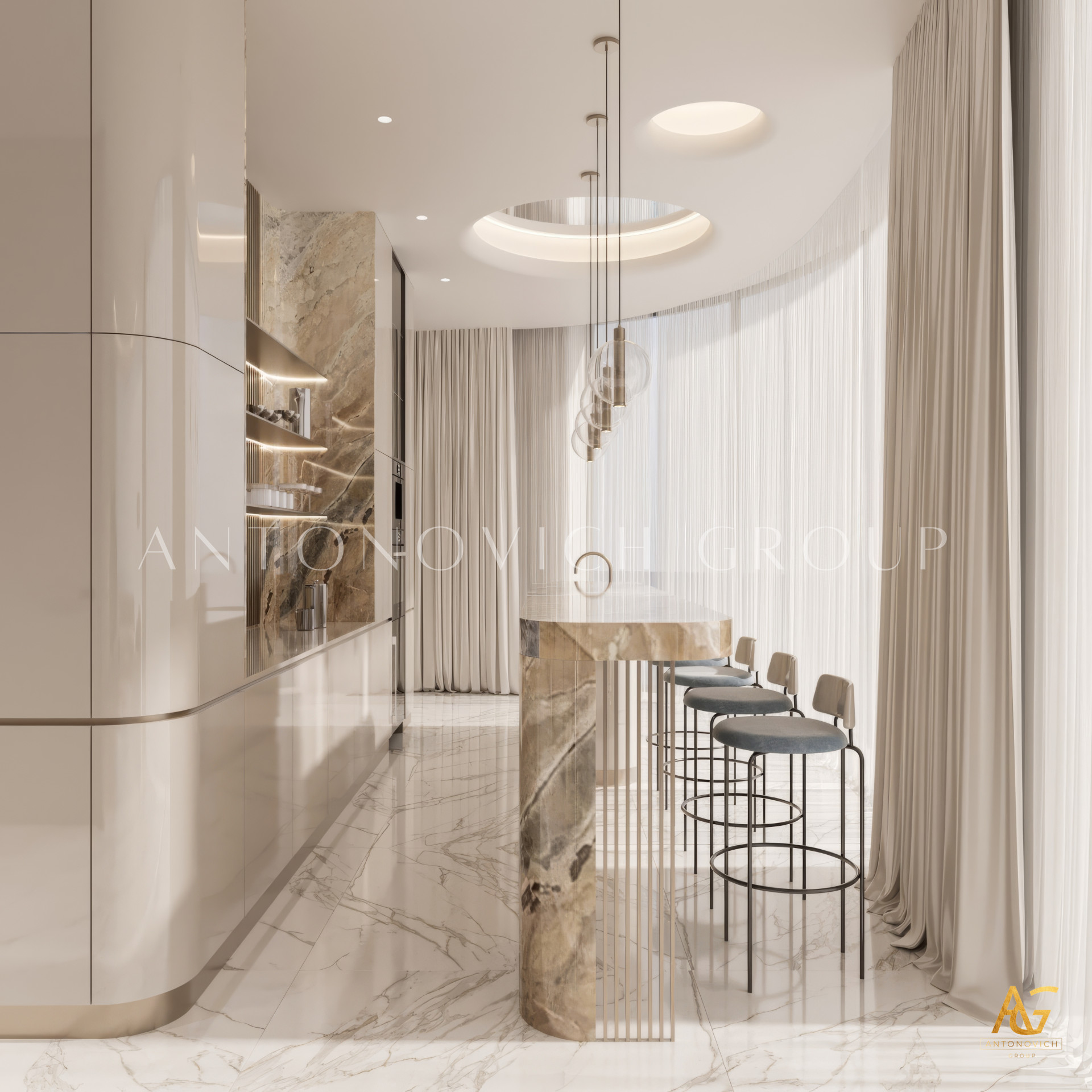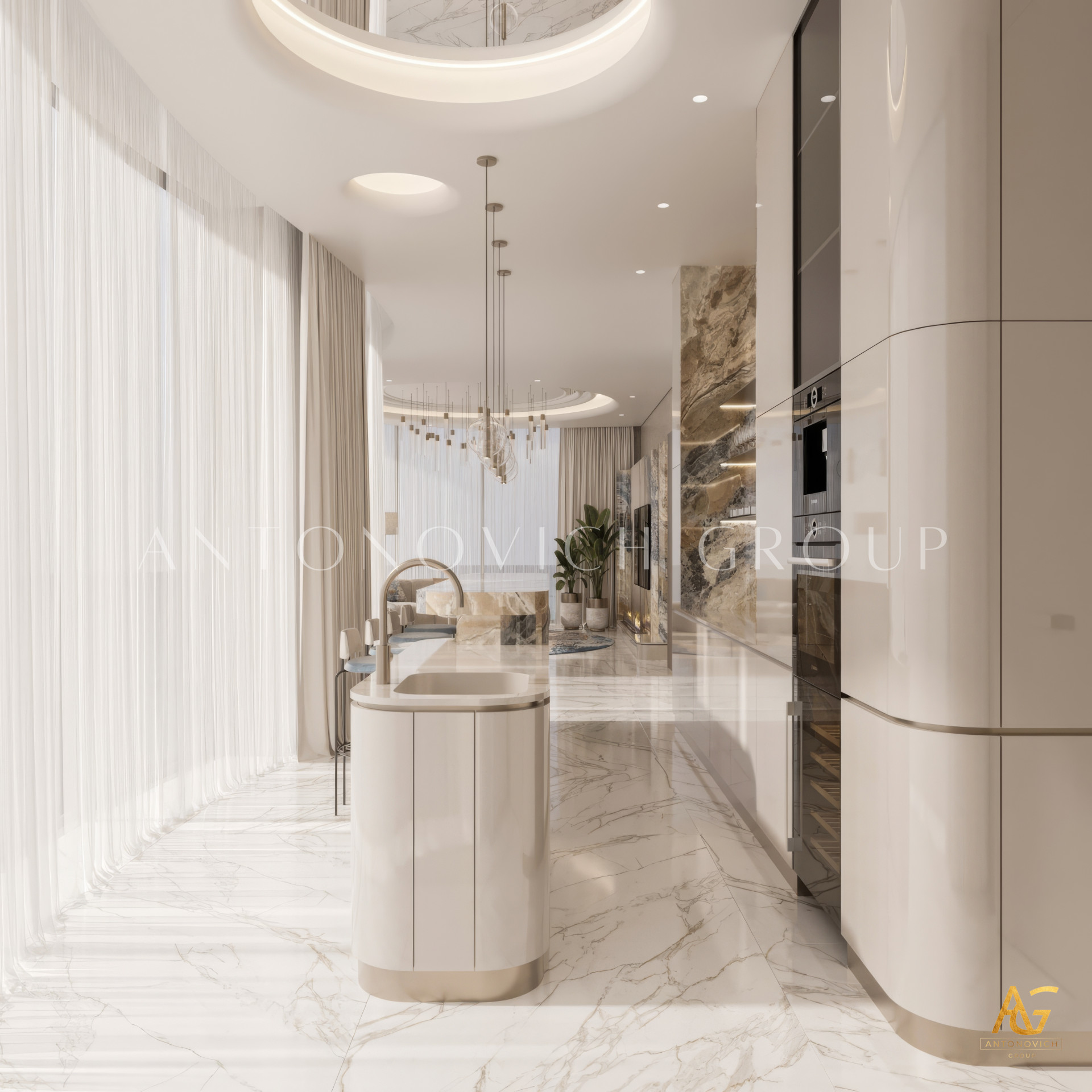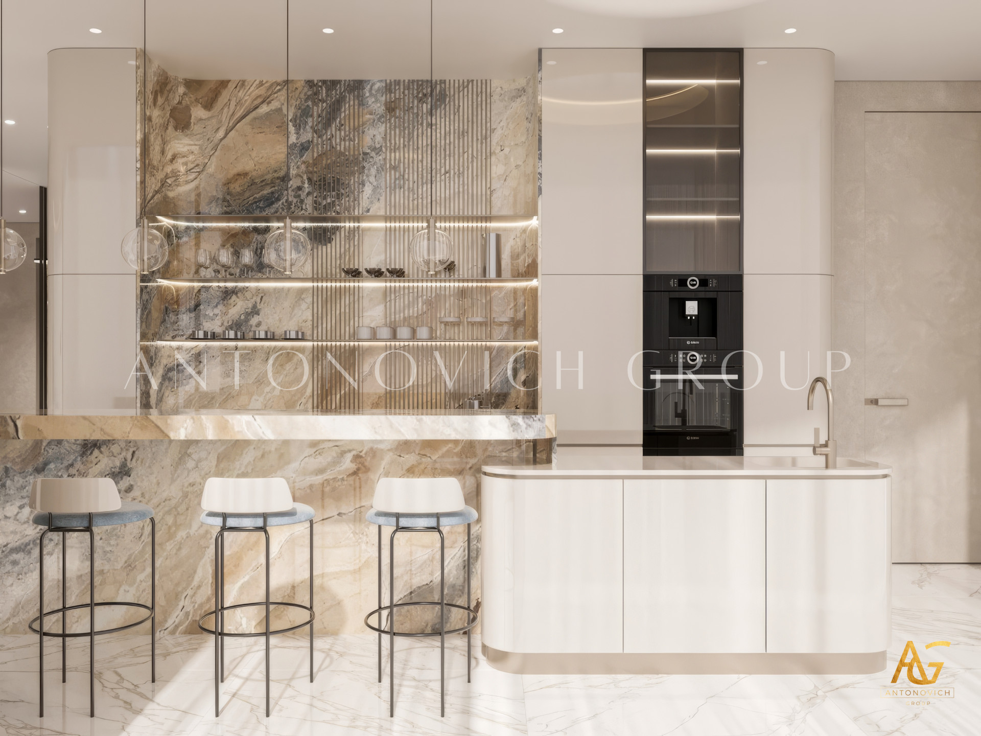 If you need to design a very small space, then it is not necessary to limit yourself in the desire to create luxurious comfort. Even in the smallest room with the right arrangement of furniture, with the help of correctly selected accents, you can create cozy and comfortable interior. In this example, we want to demonstrate how a very cozy studio variant can be created from a small room, where a small living room is combined with a small kitchen. At the same time, the comfort of the interior remains. Designers offered a pretty bold decision in terms of choosing a range of shades. Traditionally it is believed that a small space should be decorated only in light colors to make it visually greater. But there is a completely different rule, sometimes it is the dark shades in contrast with the lighter that will lengthen and increase visually height of the room. Interior designers use in this project a cool and muted shade of gray, sometimes with a hint of silver and dark color of natural wood. Natural wood always serves as a source of a very strong sense of the warmth of nature itself in the interior. In this project, the most the walls decor is of dark wood. This element significantly increases the height of the room. And against the background of such walls the soft furniture in upholstery made of velvet of gray color looks great. This color of furniture allows you to visually dissolve a large sofa in the room.