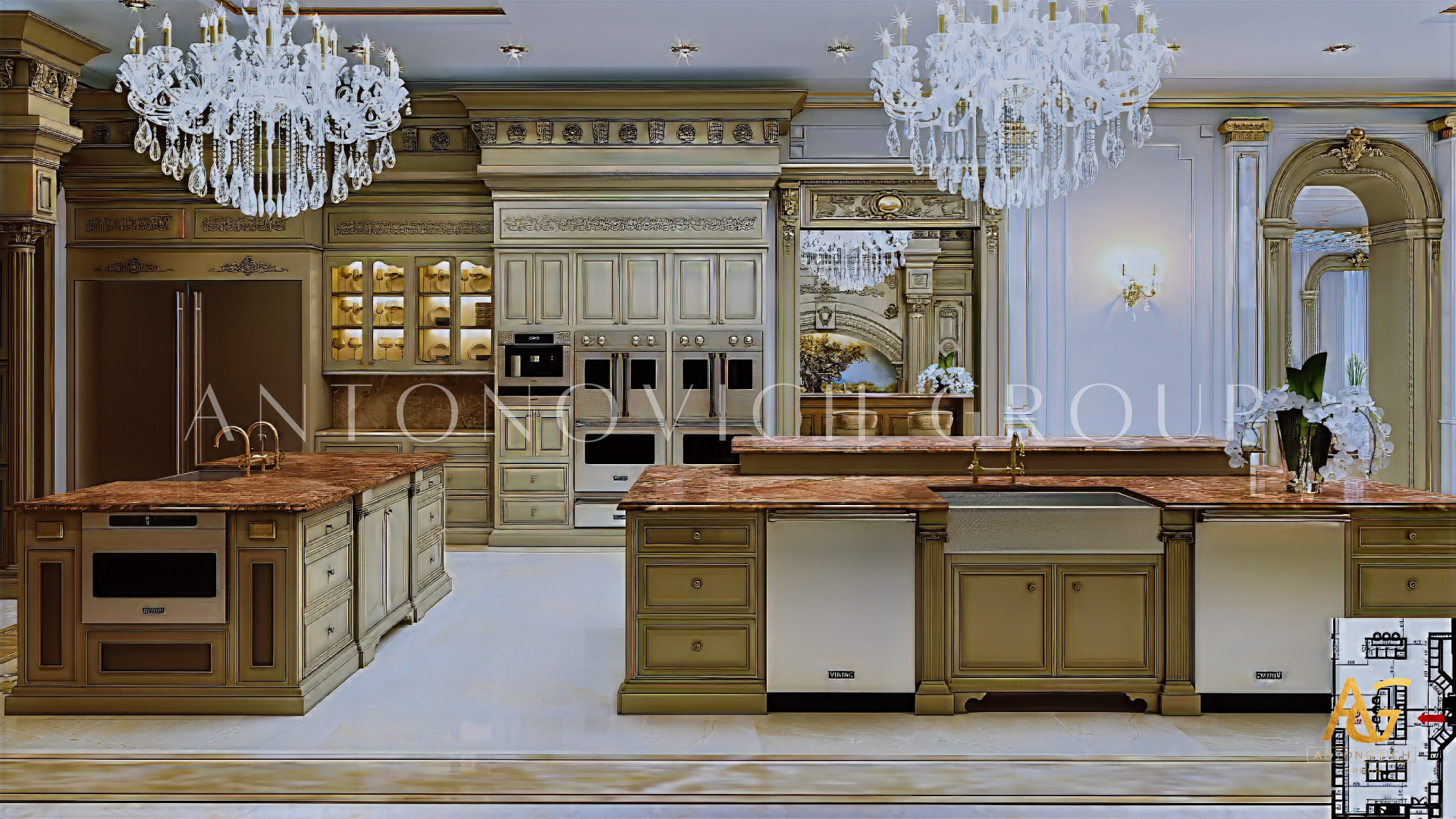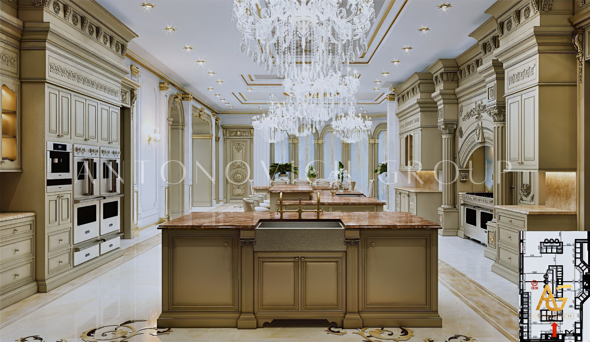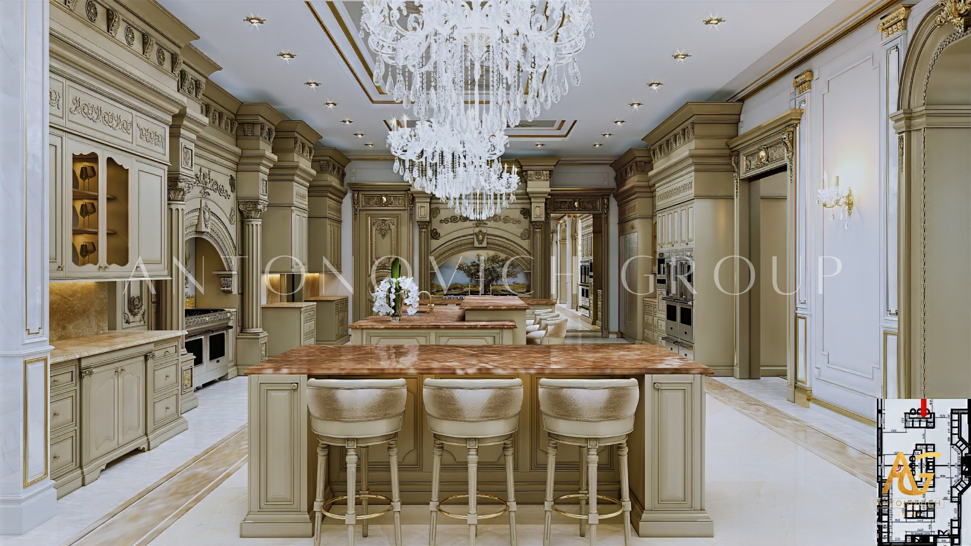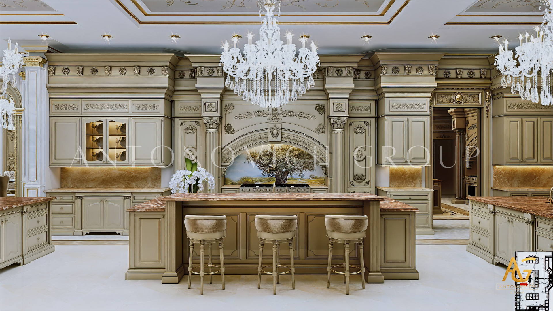 When you get into the space of such a kitchen, the time stops suddenly, the world around is filled with happy emotions and you seem to be out of time and space. For example, in the interior of the royal palace or own country residence. But we are only going to talk about the kitchen interior design for an elite apartment. Designers of the interior studio Luxury Antonovich Design filled the atmosphere of the kitchen with the mood of palace luxury. The classic style, in this case, has acquired a very solemn and festive character. The main decoration of the interior, of course, was kitchen furniture. Beautiful facades of pearl white color are complemented by carved ornaments and light gilding. Behind them are elegantly hidden the newest storage systems and modern kitchen appliances. As a working surface, a noble material such as marble was chosen. A light stone with beautiful natural veins looks especially picturesque thanks to additional accents in the form of LED lighting. With the help of a certain ceiling configuration, designers make the height of the room visually higher. A deep niche along the entire perimeter is highlighted by a line of soft illumination, and in the center is decorated with a magnificent crystal chandelier. In the decoration of flooring, a large ornament made of carved marble looks very beautiful. The combination of light marble and dark brown makes this part of the space more expressive. The kitchen table with soft chairs in the upholstery of dense lilac silk serves as a kind of dining area with a hint of royal luxury.