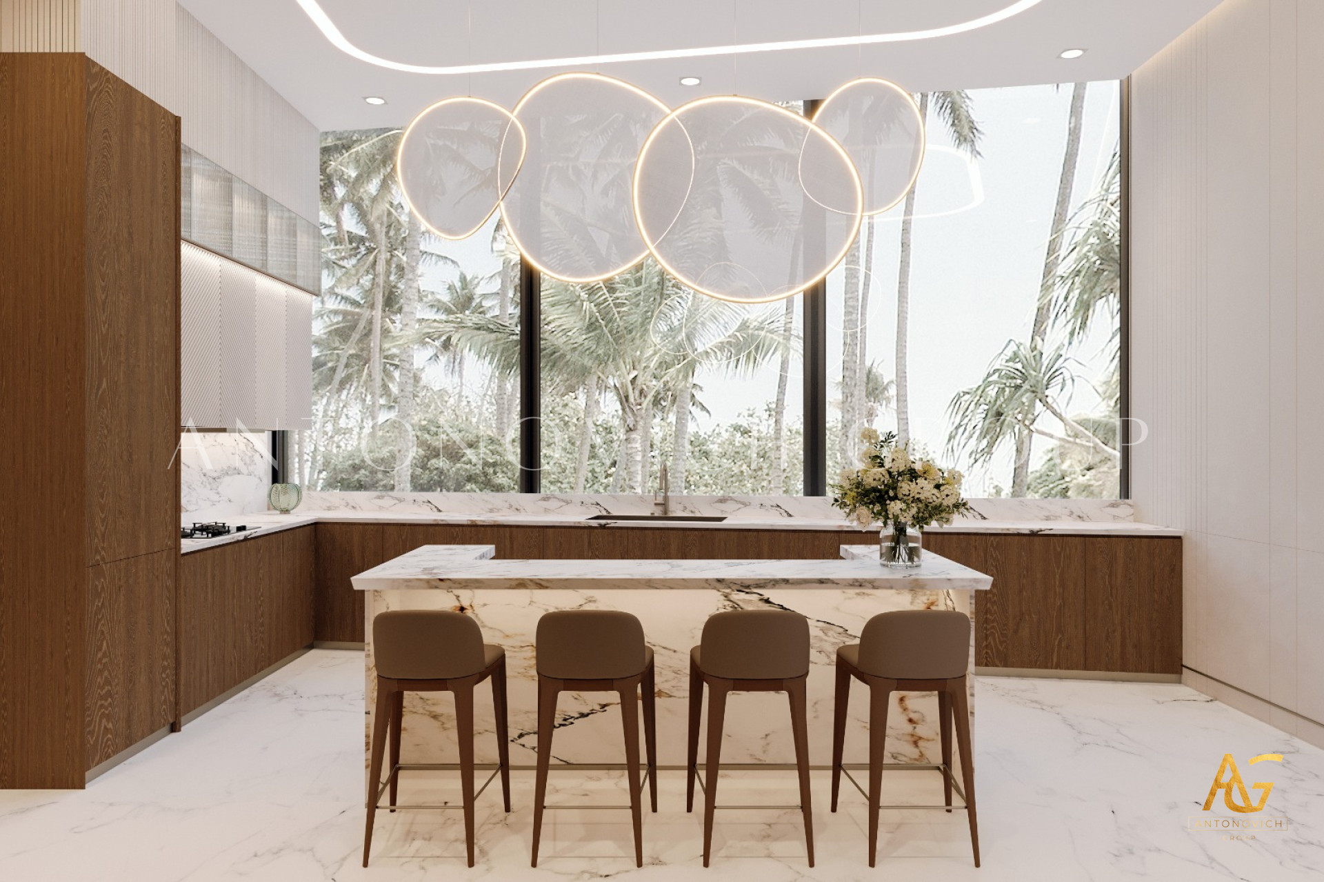 The villa’s kitchen combines functionality with artistry. State-of-the-art appliances are integrated into sleek cabinetry, while a large island serves as both a preparation area and a social hub. The design ensures the kitchen is as visually appealing as it is practical.