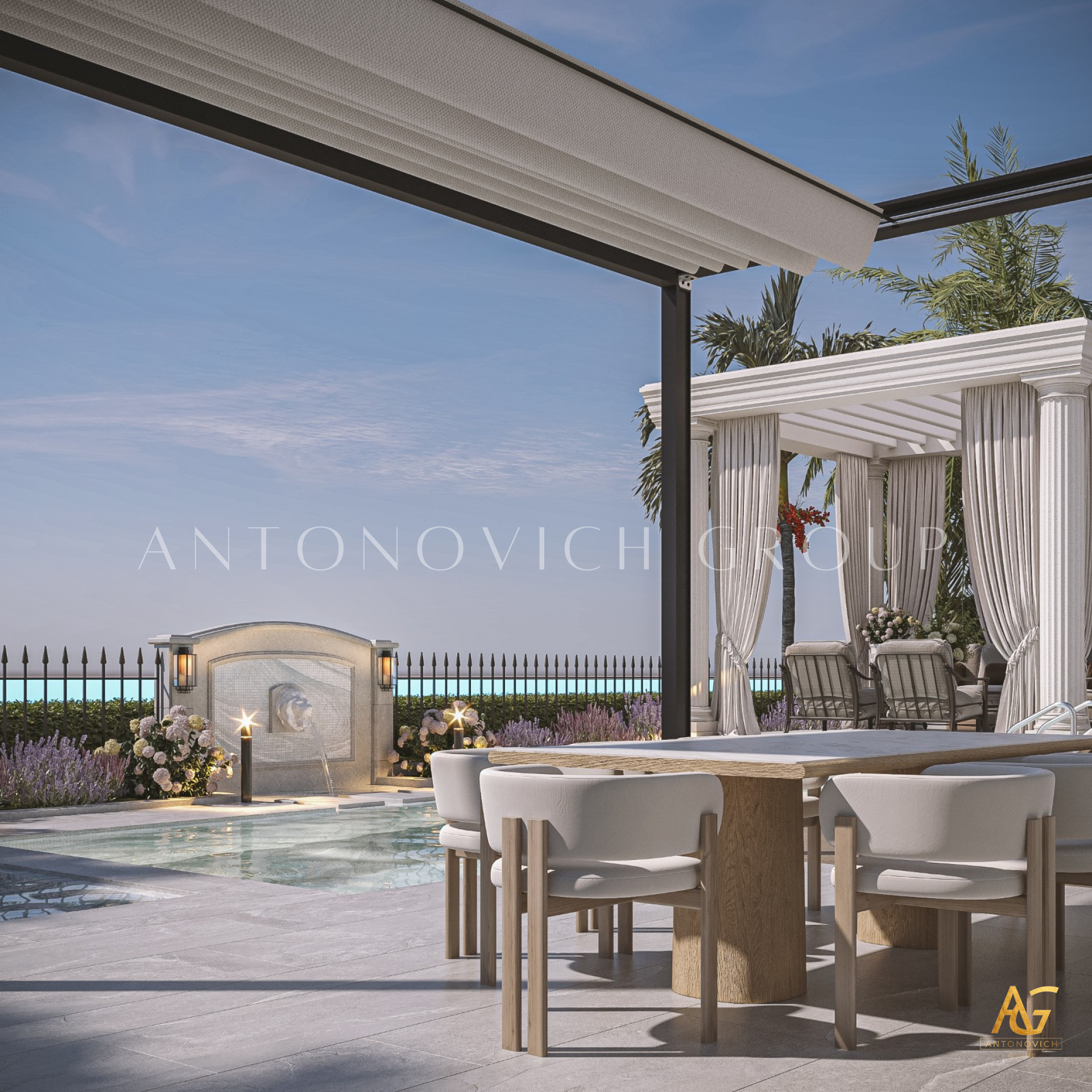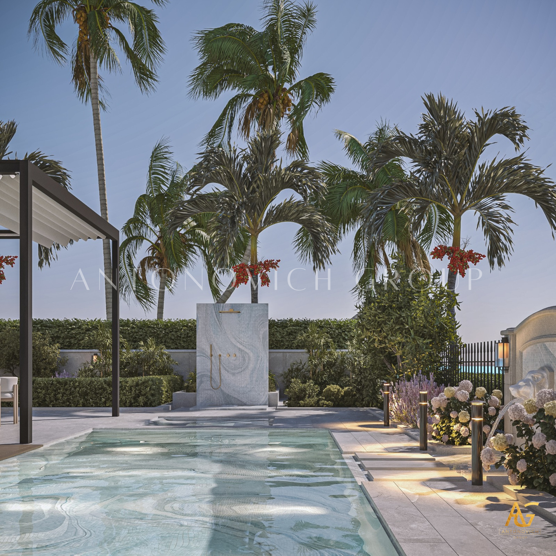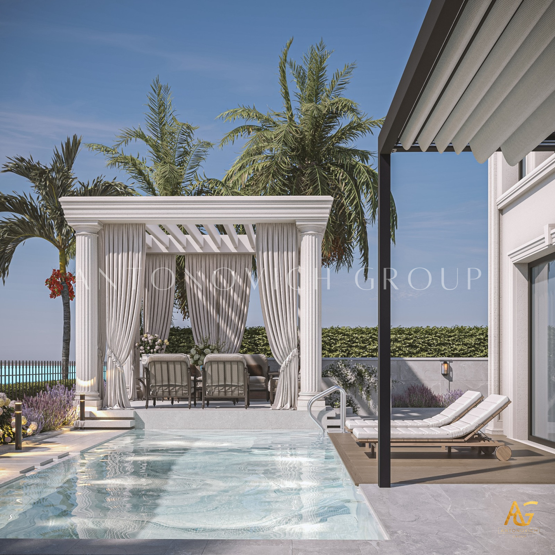 • Outdoor living spaces with pergolas, pools, and seating areas