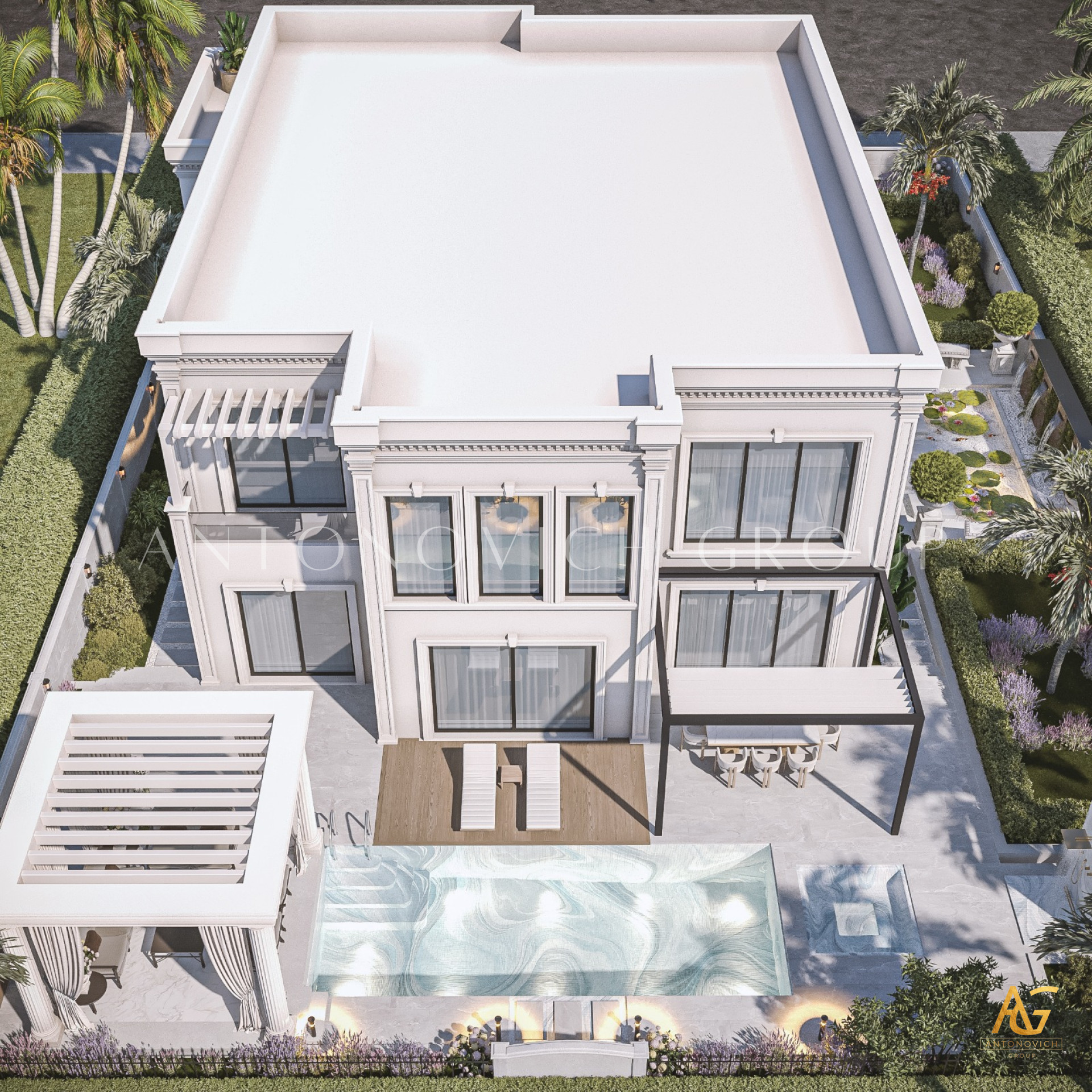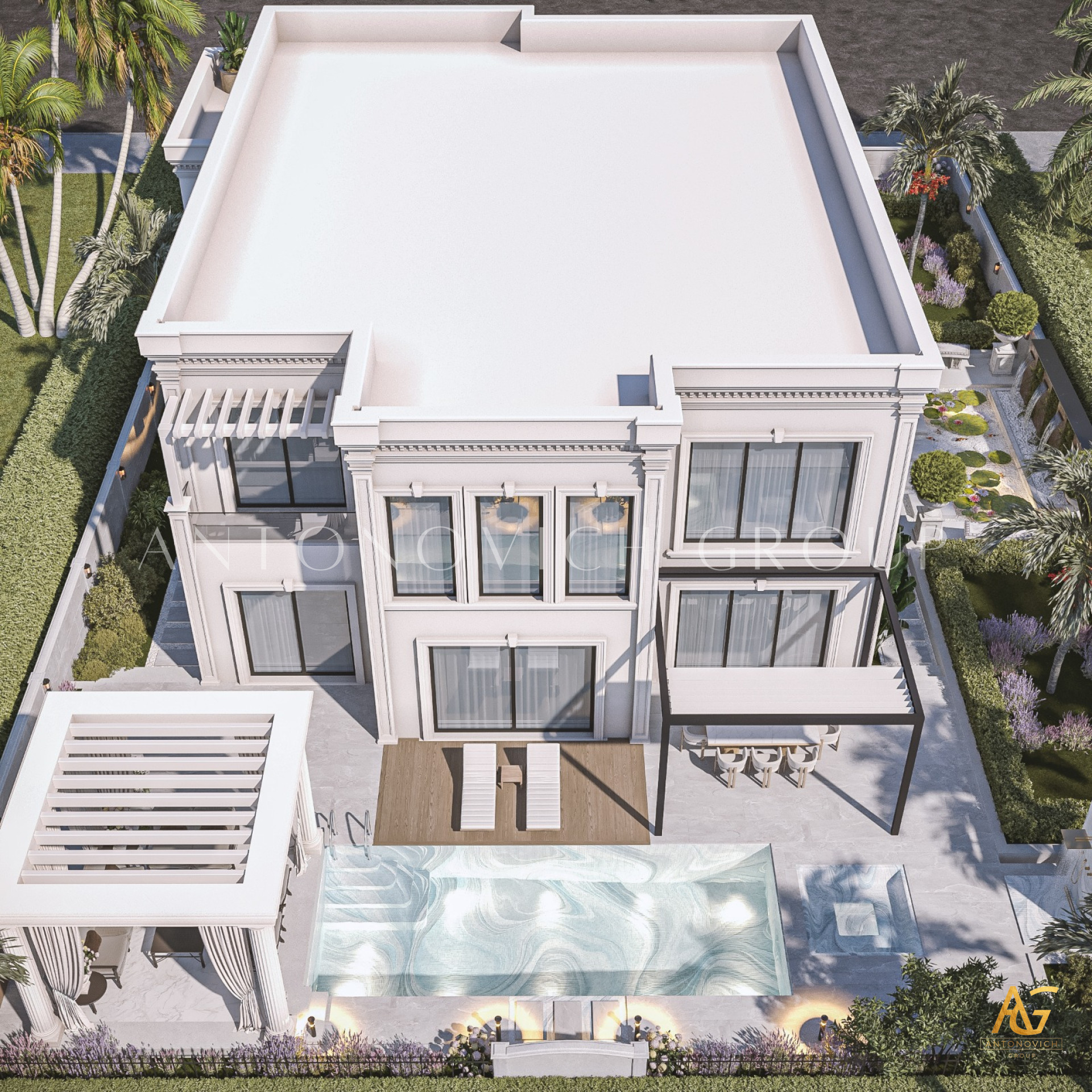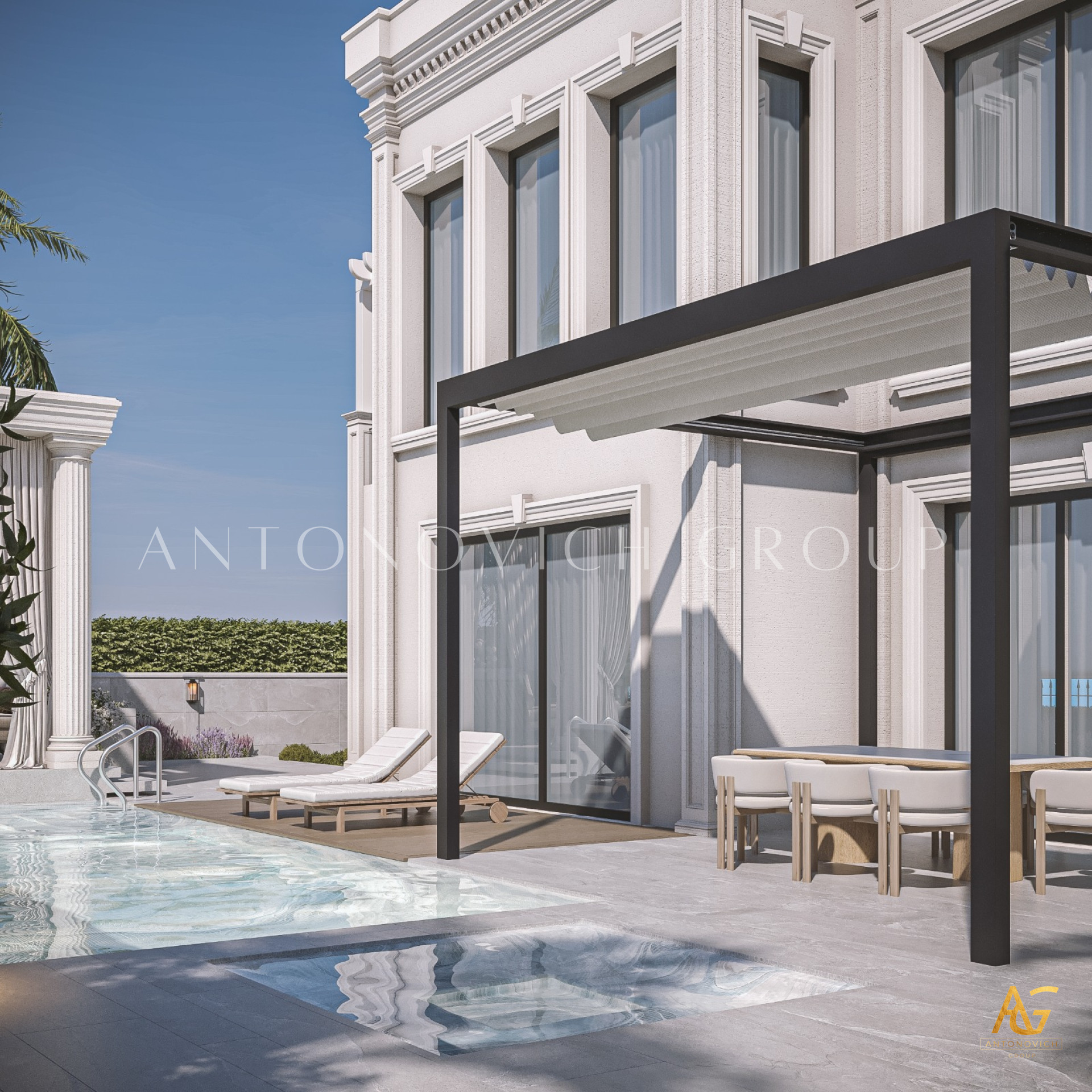 • Outdoor living spaces with pergolas, pools, and seating areas
