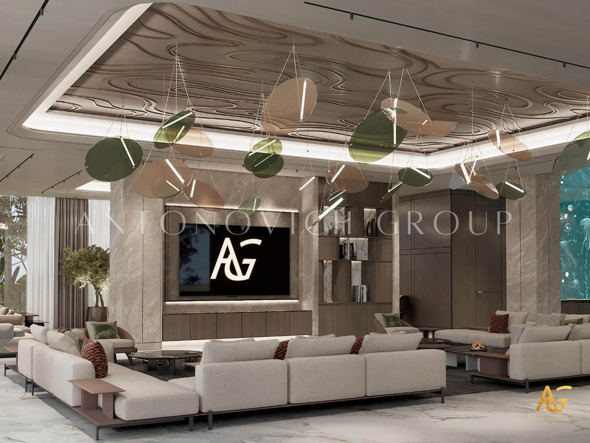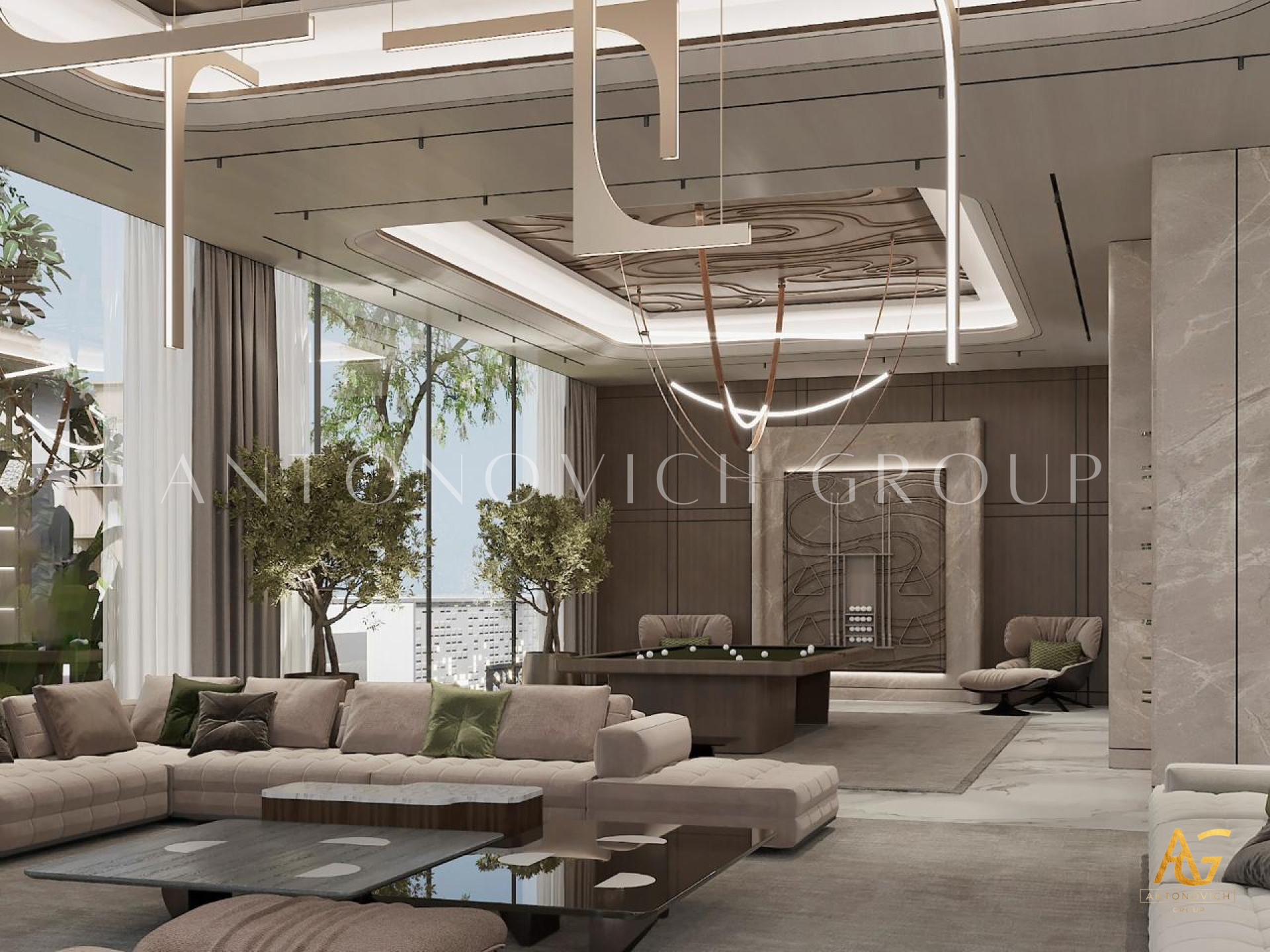 Luxury Antonovich Design Studio developed the luxurious living room interior in a classic style with a touch of oriental flavor, Baroque and Rococo for the gorgeous villa in Dubai. The interior designers have offered a rich and luxurious decor to emphasize the high status of the villa owners and cultural traditions. With all finery, pomposity, and solemnity, the interior has a charming and gentle character. This is due to the combination of gold shades and attractive pink colors. The ceiling design expresses the best traditions of classic style with accents of modern technologies. The ceiling is decorated with a niche made of stucco with gold. The niche around the perimeter is outlined with soft white backlight. And in the middle in the best traditions of the classic interior, there is a grand chandelier. The floor from Luxury Antonovich Design is a true work of art. After all, with the help of modern laser technology of stone cutting, we can create incredible ornaments. The author’s design combines several types of marble and semi-precious stones. The walls design perfectly fits into the overall picture of the luxurious interior. The boiserie is framed with carved decoration with gilding. And inside the boiserie is filled with luxurious silk wallpaper with printed patterns. To make the living room interior entirely harmonious, Dubai Interior Designers have proposed the unique furniture, upholstered in silk and inlaid with the precious carved decor.