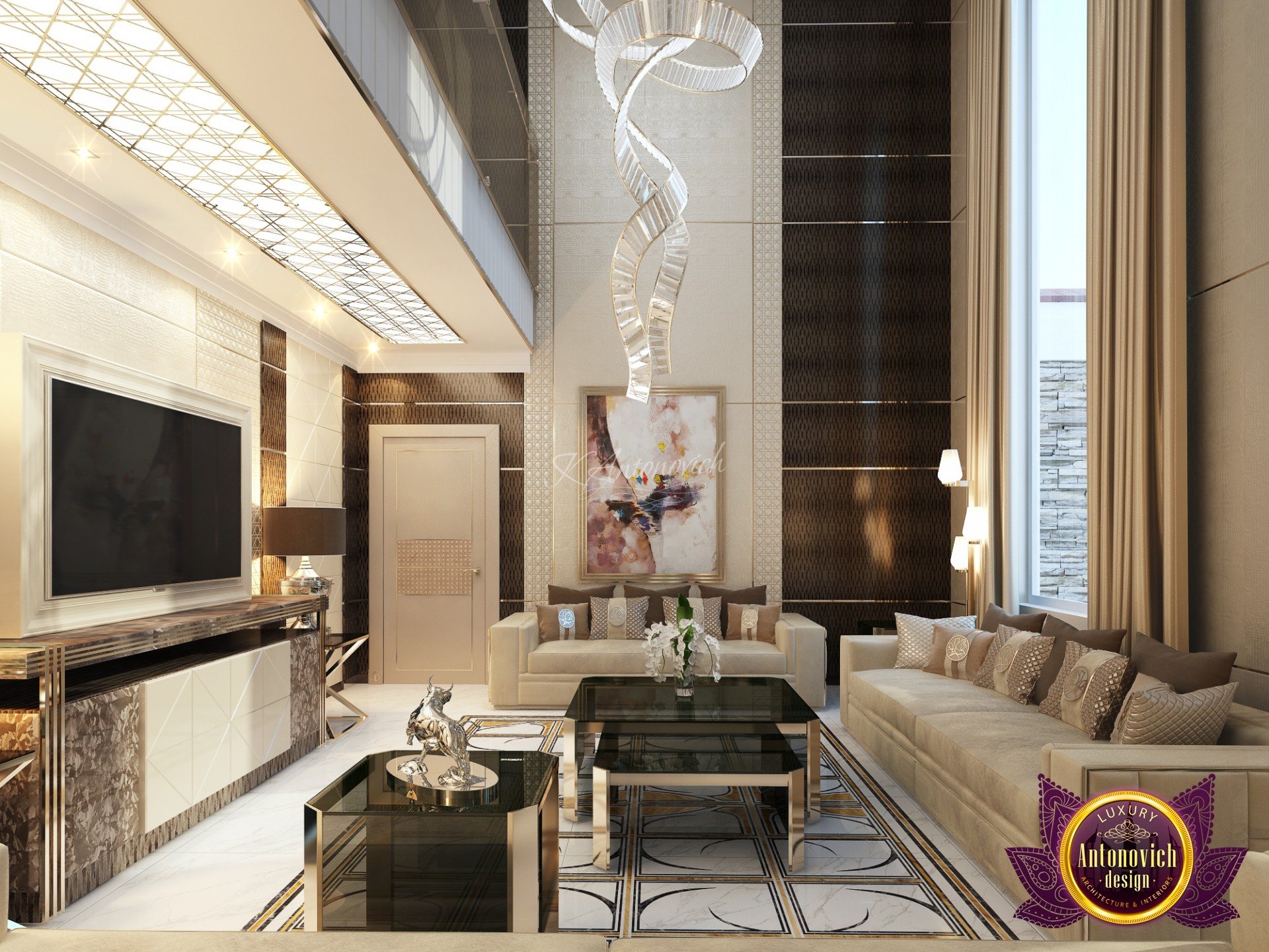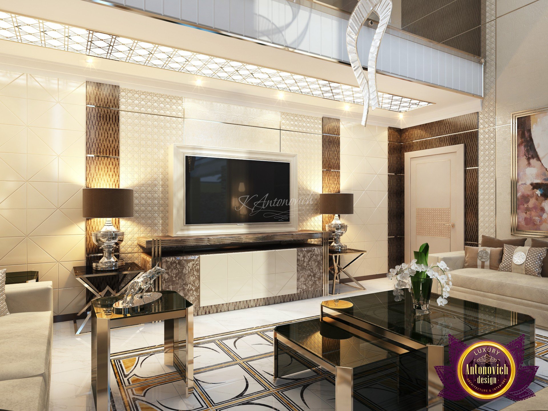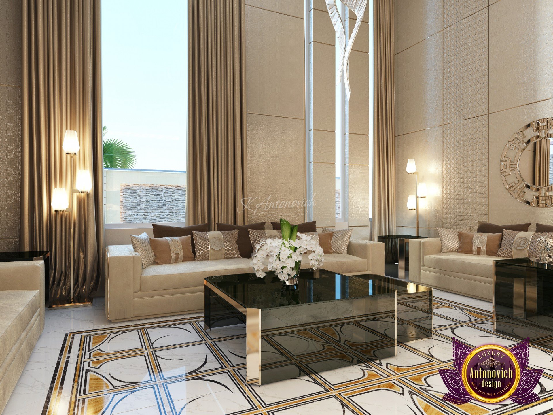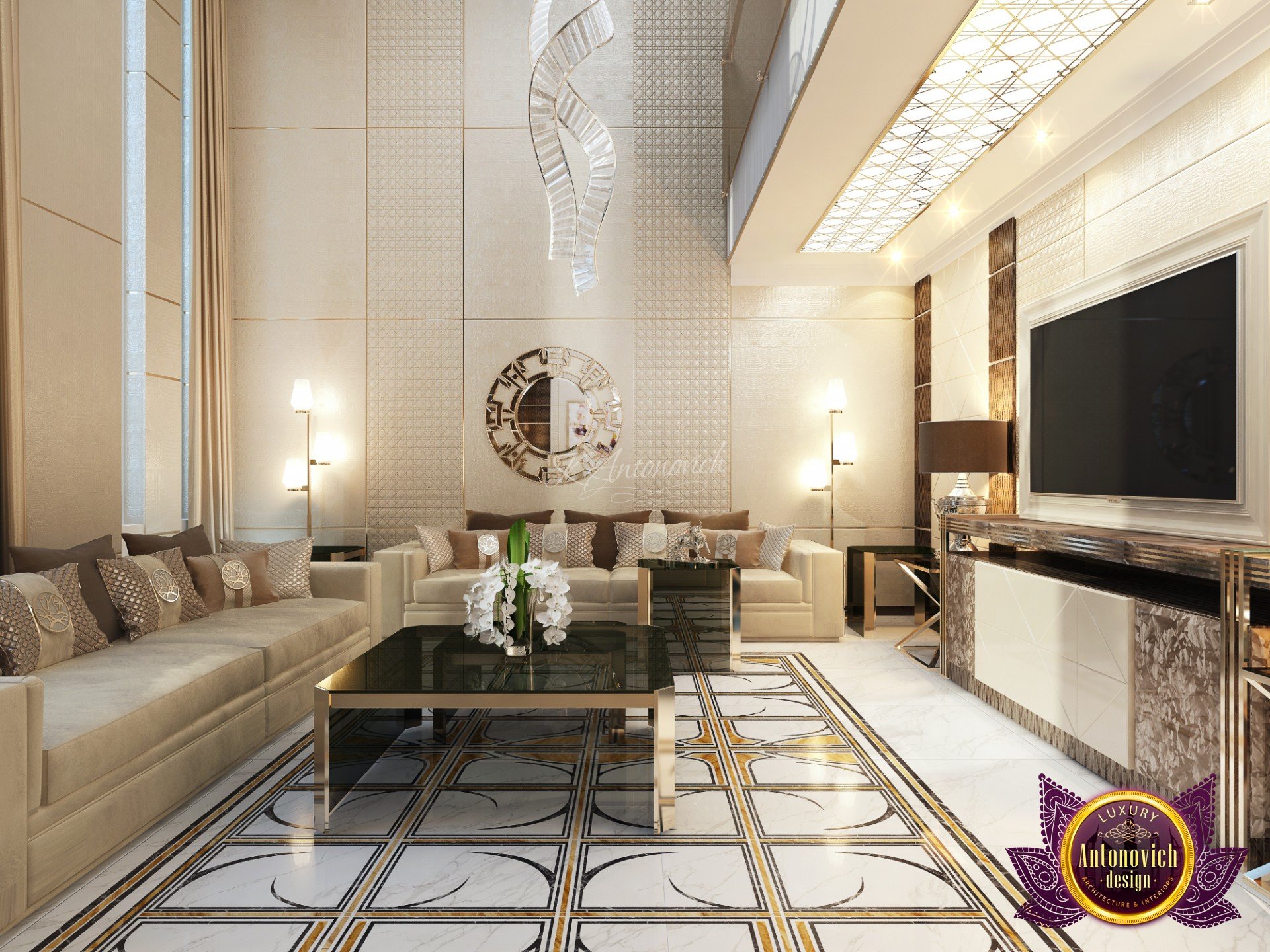 The design of the living room can be regarded as a full and self-sufficient part of the work on the project of house and apartment. After all, with the help of the living room interior, designers convey the main idea of each project, which expresses the essence of the character of the owners of the house. This spacious living room with a kitchen has a very characteristic charm of tenderness, warmth and some caramel-candy mood. And everything is connected with the fact that the mistress of the house is a young lady with a very easy, cheerful and pleasant character. Interior designers of the studio Luxury Antonovich Design used re-planning solutions to translate all their ideas. So, part of the partitions was removed and a large area was opened for this room, the continuation of which is a small kitchen. In general, the interior embodies the true triumph of the classical style, to which the designers add warm and romantic notes. This is due to a pleasant range of pink shades. In this pastel shade, the stucco decor with gilding, which is present in the design of walls and ceilings, looks amazing. They are decorated in the best traditions of royal palaces of the Baroque and Rococo era. A large crystal chandelier, surrounded by exquisite curls of stucco decor, is so elegant. The advantage of the interior was several large windows framed by elegant pilasters with stucco molded capitals. They continued by luxurious curtains of natural silk in the classic style. A real designers masterpiece was a real marble floor with a carved pattern in the format of 2 D. The Italian furniture covered with beautiful inlays with upholstery and gilding.