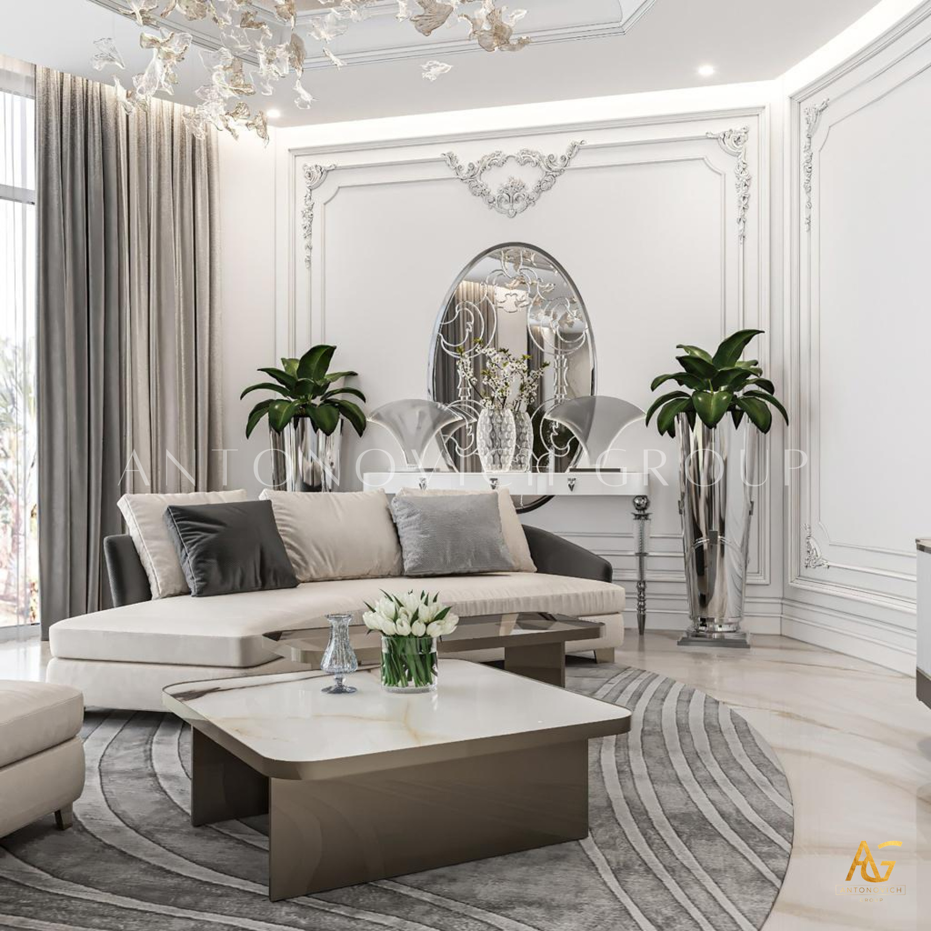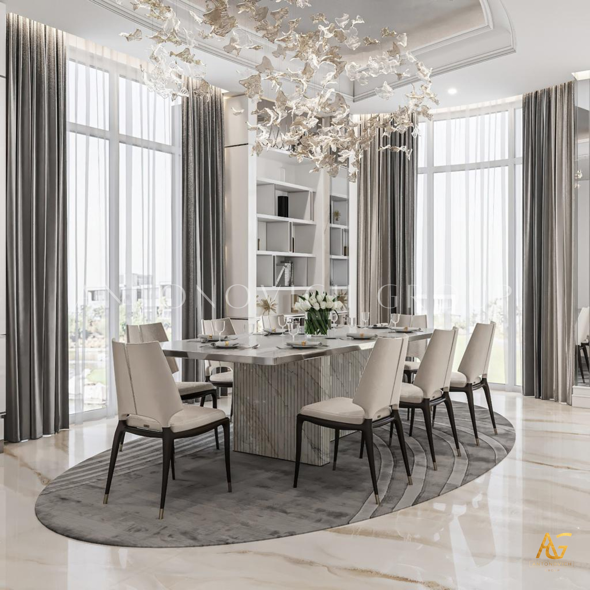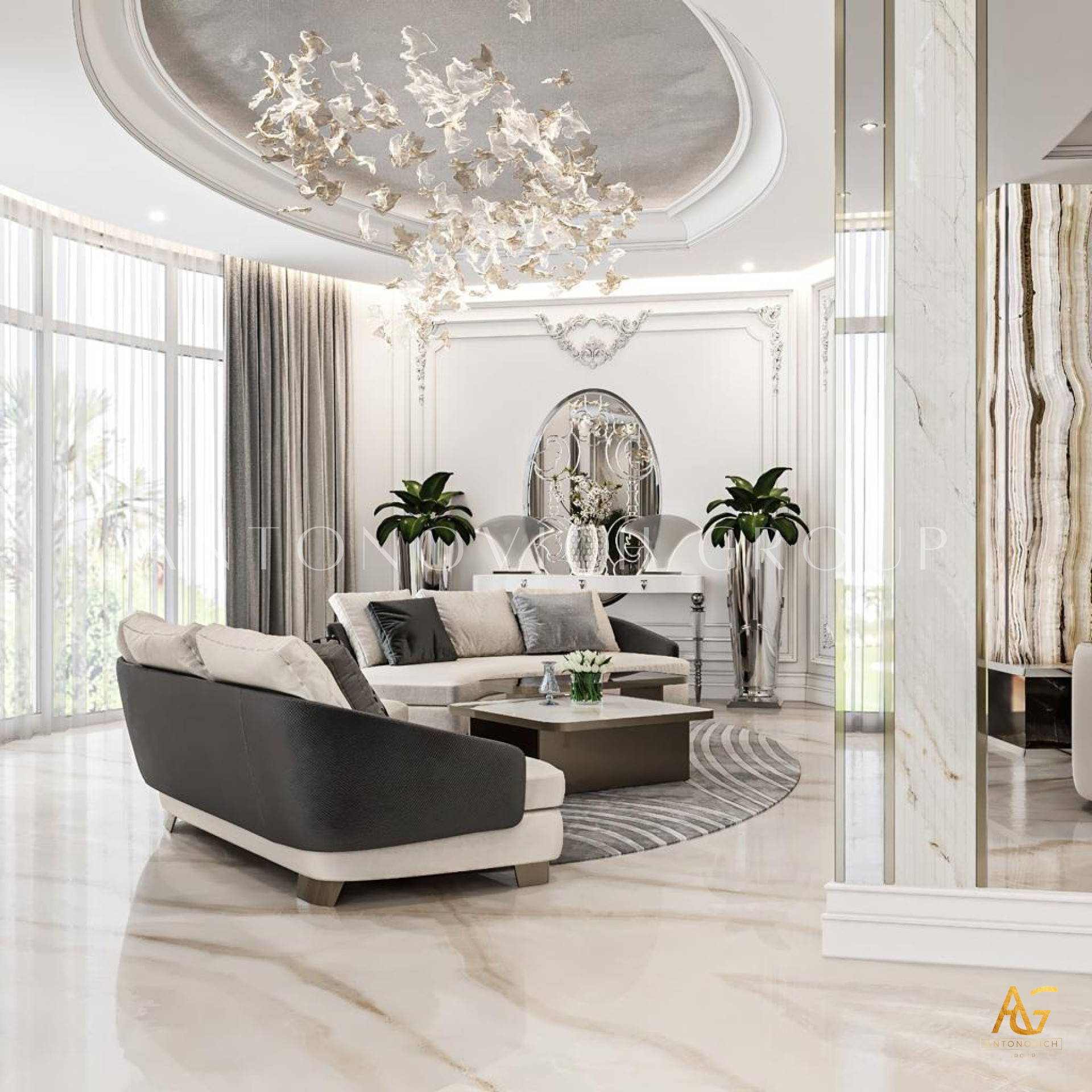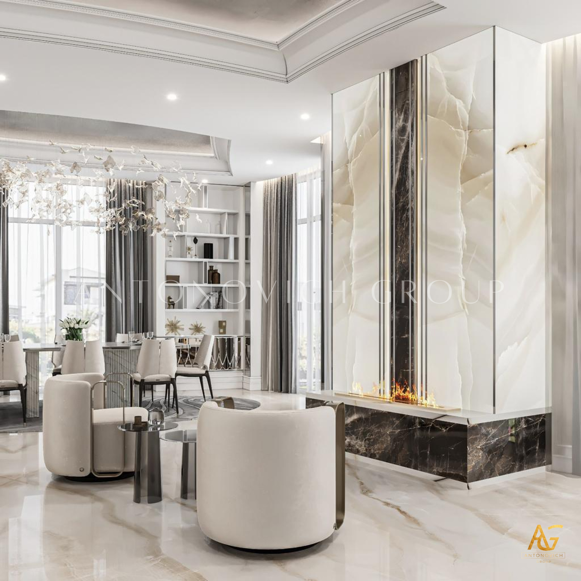 Living room interior design of the studio design in Dubai Luxury Antonovich Design filled the luxury apartment with cozy and warm mood with a touch of laconism. Nice shades, from light beige to brown, prevail in the living room interior. The complex geometry of space, thanks to a spectacular design techniques looks very harmonious. In keeping with the trend towards open spaces, interior designers Dubai zoned interior with decoration of floors and ceilings. The ceiling is divided into niche of regular geometric shapes. Every niche is filled with tension ceilings of light brown colour. The glossy ceiling reflected charmingly stylish chandeliers. The fact that each chandelier’s pendant is attached to a separate subtlest rope, creating a beautiful effect of floating in space. This gentle and refined ceiling decor is continued with laconic floors. Luxury interior design involves the use of luxury materials. There on the floor natural marble of light shade is complemented with darker marble. With exquisite carvings authors of the project outlined the boundaries of each zone of the interior. Furniture is upholstered in noble creamy silk. To give the interior expressiveness, interior designers Dubai used in the decoration of the walls wood of valuable species, which is covered with a special varnish. The living room design is a unified with the design of the kitchen and dining room. The kitchen is more inclined to a minimalist style. Smooth glossy facades modestly and elegantly highlight the luxurious look of the living room.