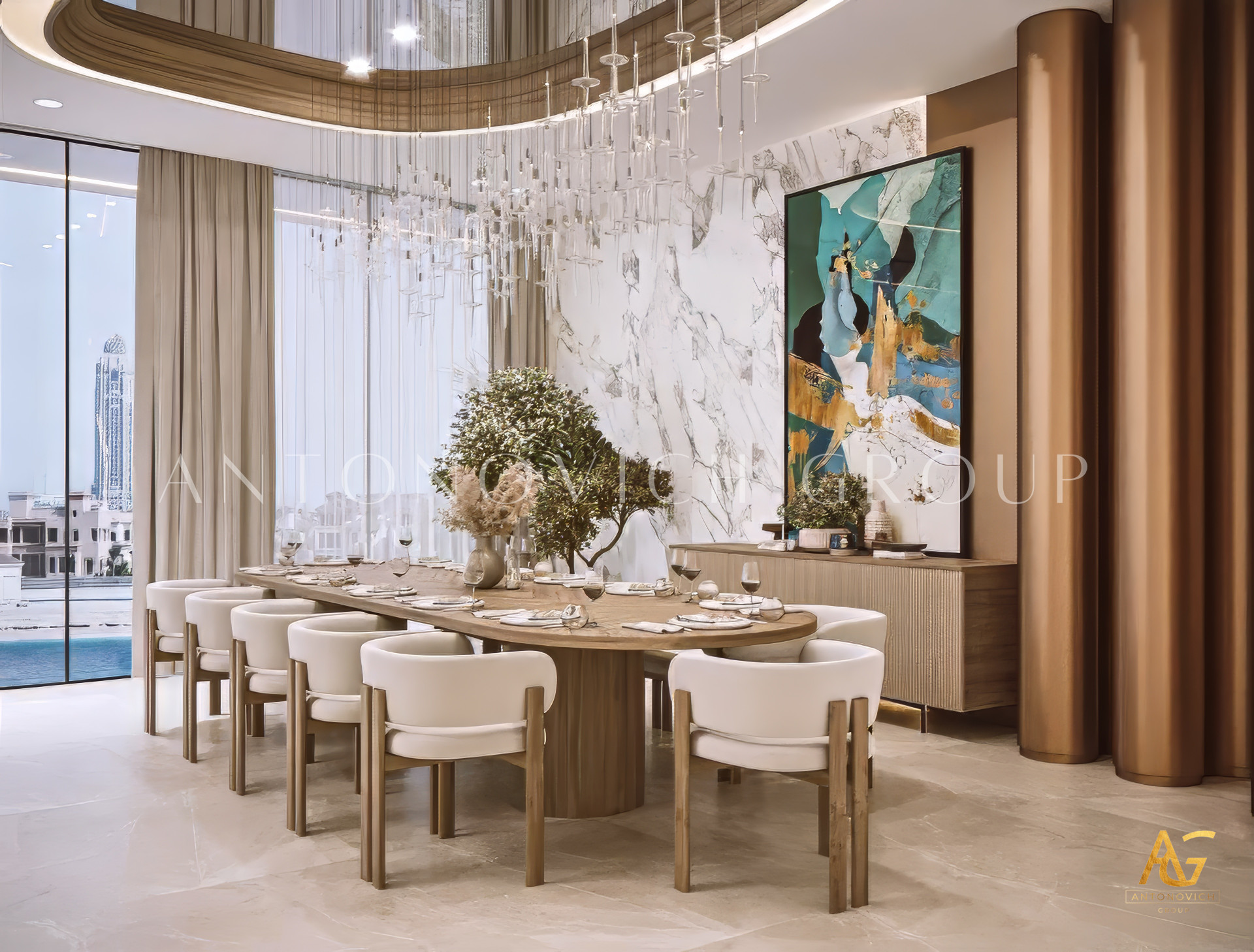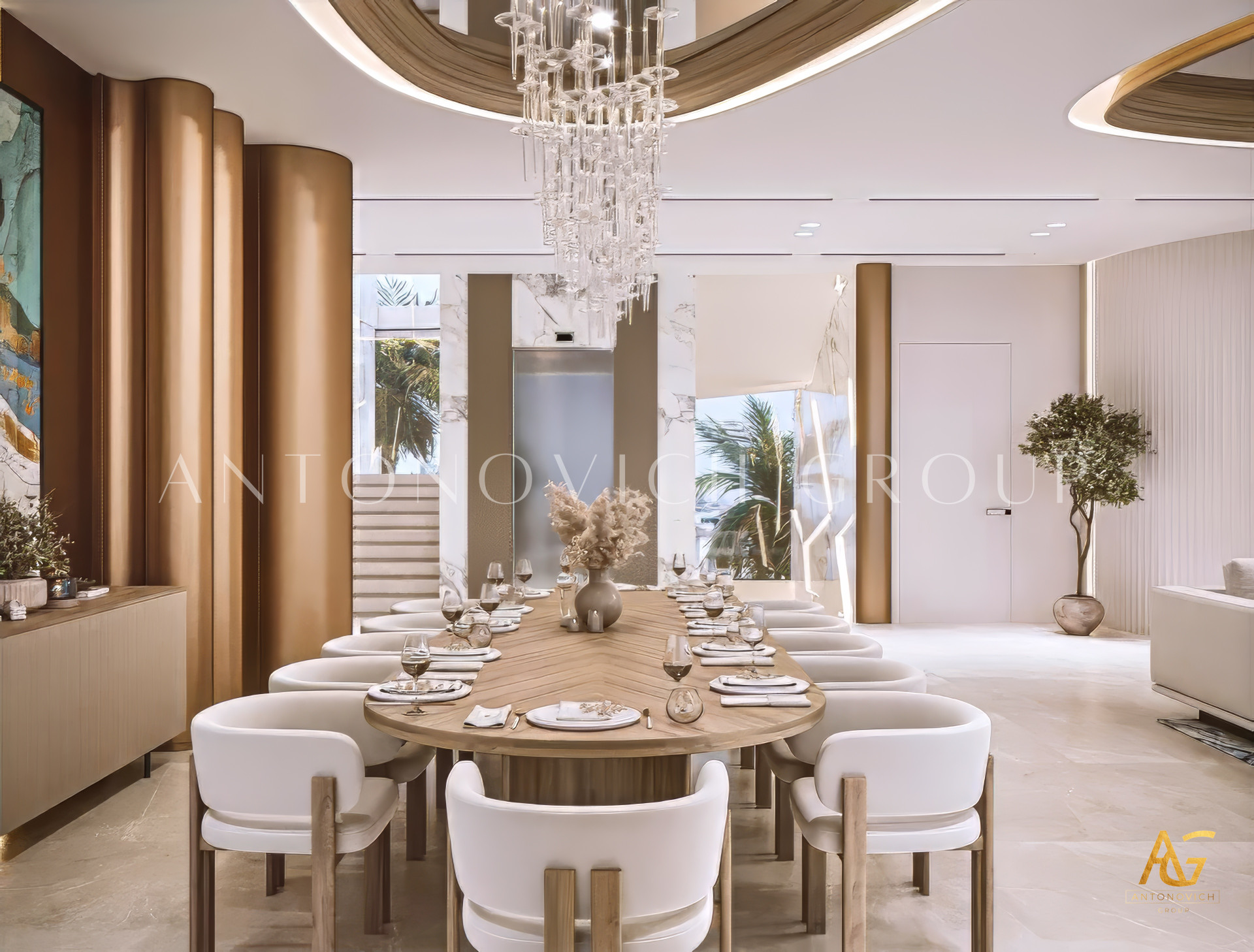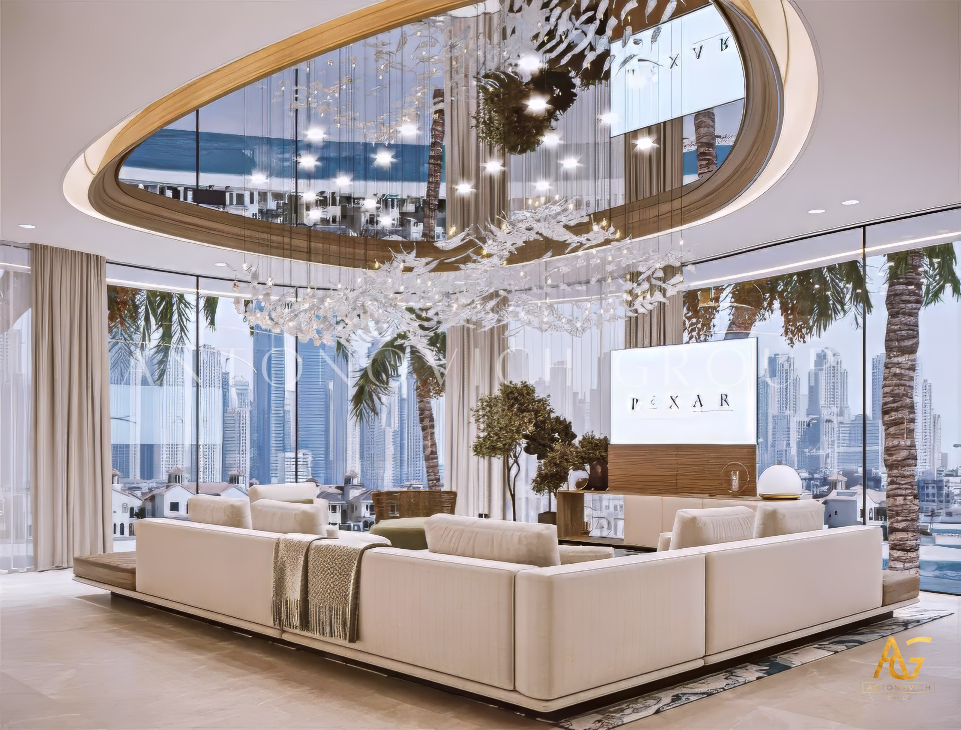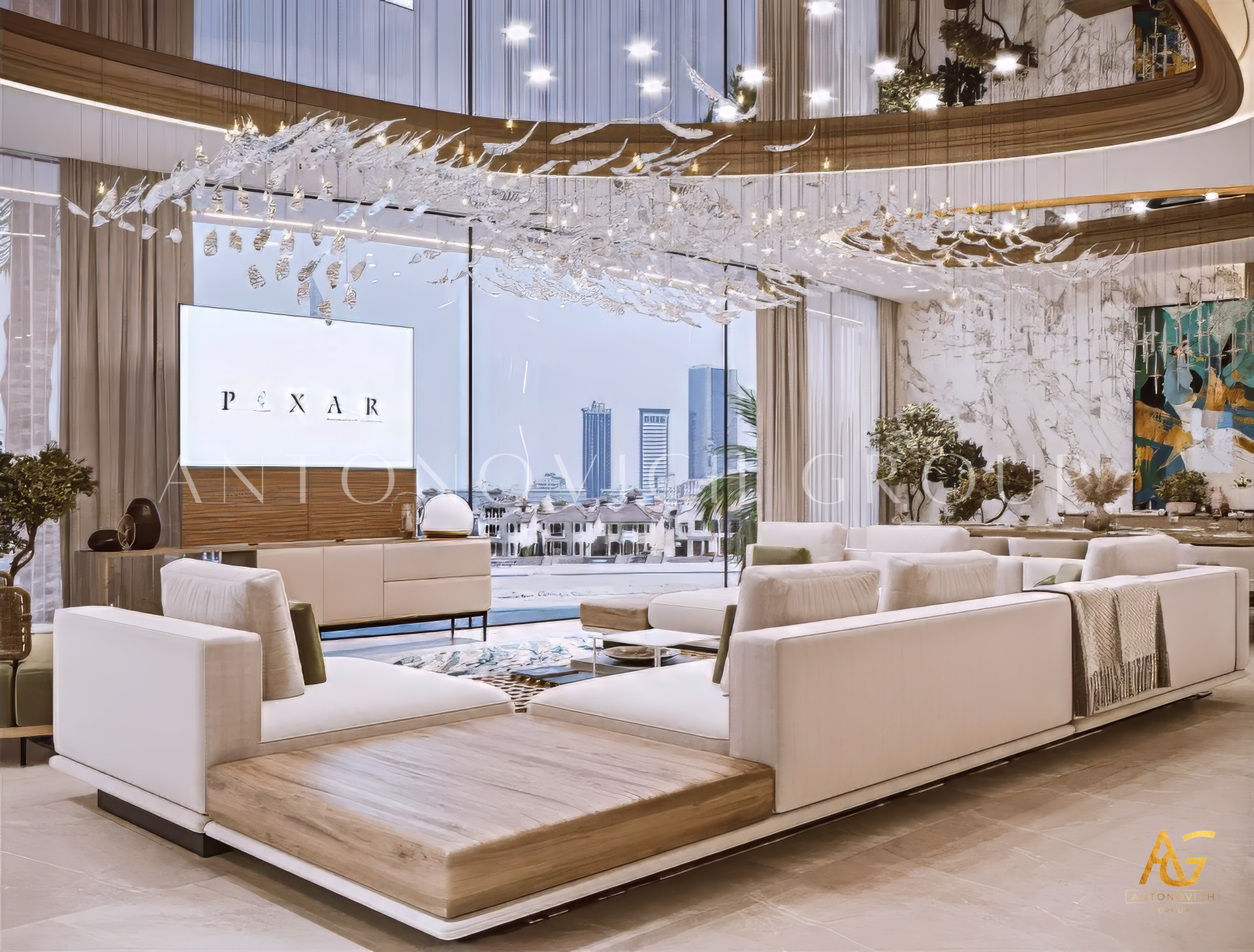 Modern luxury design thrives on atmosphere, and lighting is central to creating it. Antonovich Group curates layered lighting schemes with chandeliers, recessed fixtures, and accent lighting, ensuring the living room feels dynamic at any hour of the day. Paired with a palette of natural materials—such as marble, wood, glass, and fine textiles—the result is an interior that radiates warmth and sophistication.
