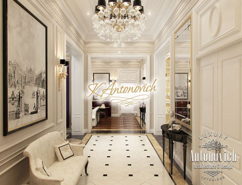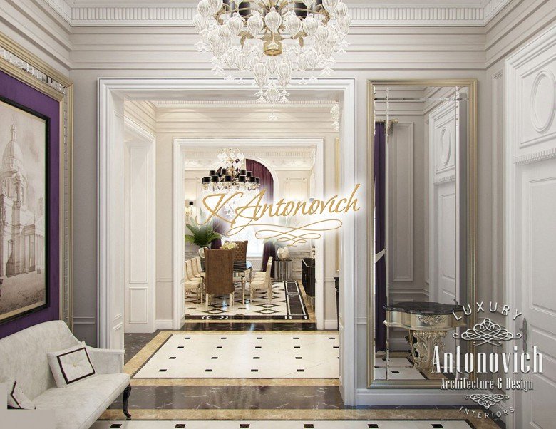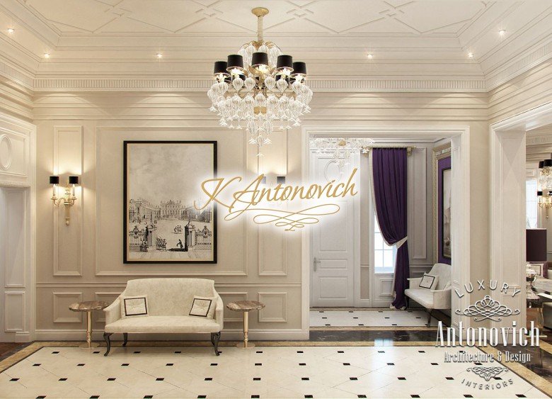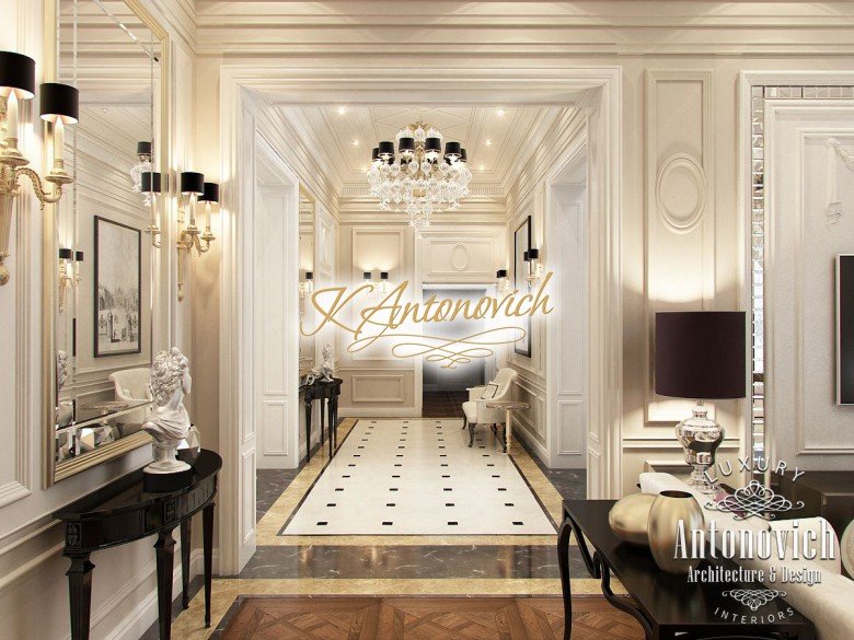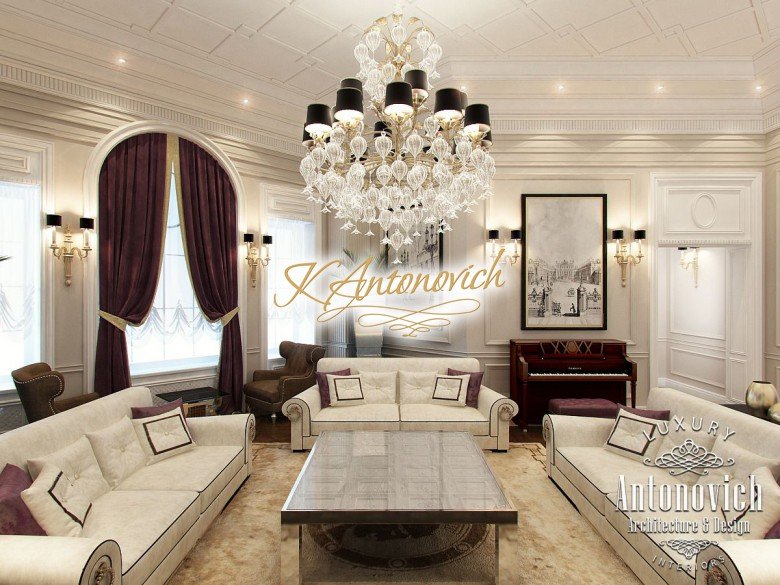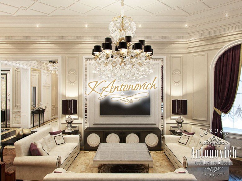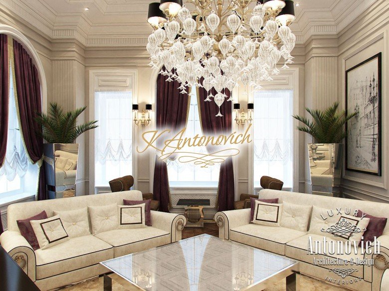 Design for living room invariably becomes the culmination of great interior stories told in each project by Luxury Antonovich Design Studio in Dubai. Interior design in the style of neoclassicism has an exquisite and refined look. Aesthetic perfection is present in projects of the studio. These features combined with the authors genius ideas make works of the studio recognizable all over the world. Living room designs in the style of modern classics are intended to emphasize the refined taste of the house owners. The walls are decorated with stucco of monochrome creamy hue. Against this background, realistic paintings and beautiful lamps look very expressive. In laconic living room design, there are bright and rich accents. One of these bright and elegant accents became the beautiful chandelier with large crystal pendants. Luxurious velvet curtains of ruby color in the windows decoration look fascinating. Accents of softness and home warmth became the floor of precious dark wood with special impregnation, as well as soft natural carpet in the center of the room. Upholstered furniture sets a cozy mood in the living room interior. Sofas and chairs are upholstered in soft velvet of creamy hue. The luxurious dining room continues the comfortable living room interior. The dining table with a top made of natural marble is surrounded by elegant upholstered chairs and two luxury armchairs in the romantic style with high backs. Living room decoration by Luxury Antonovich Design Studio meets the highest international standards.