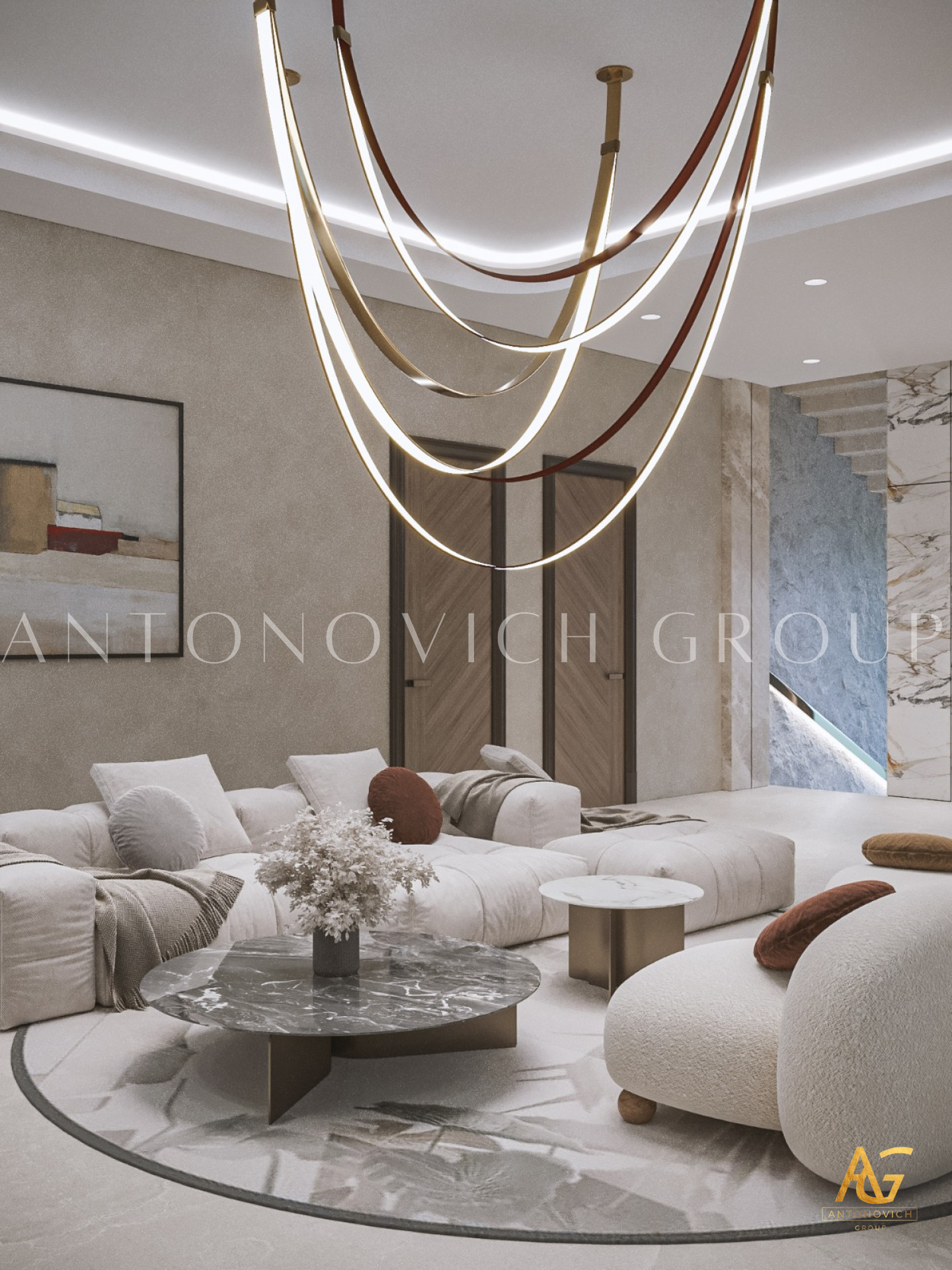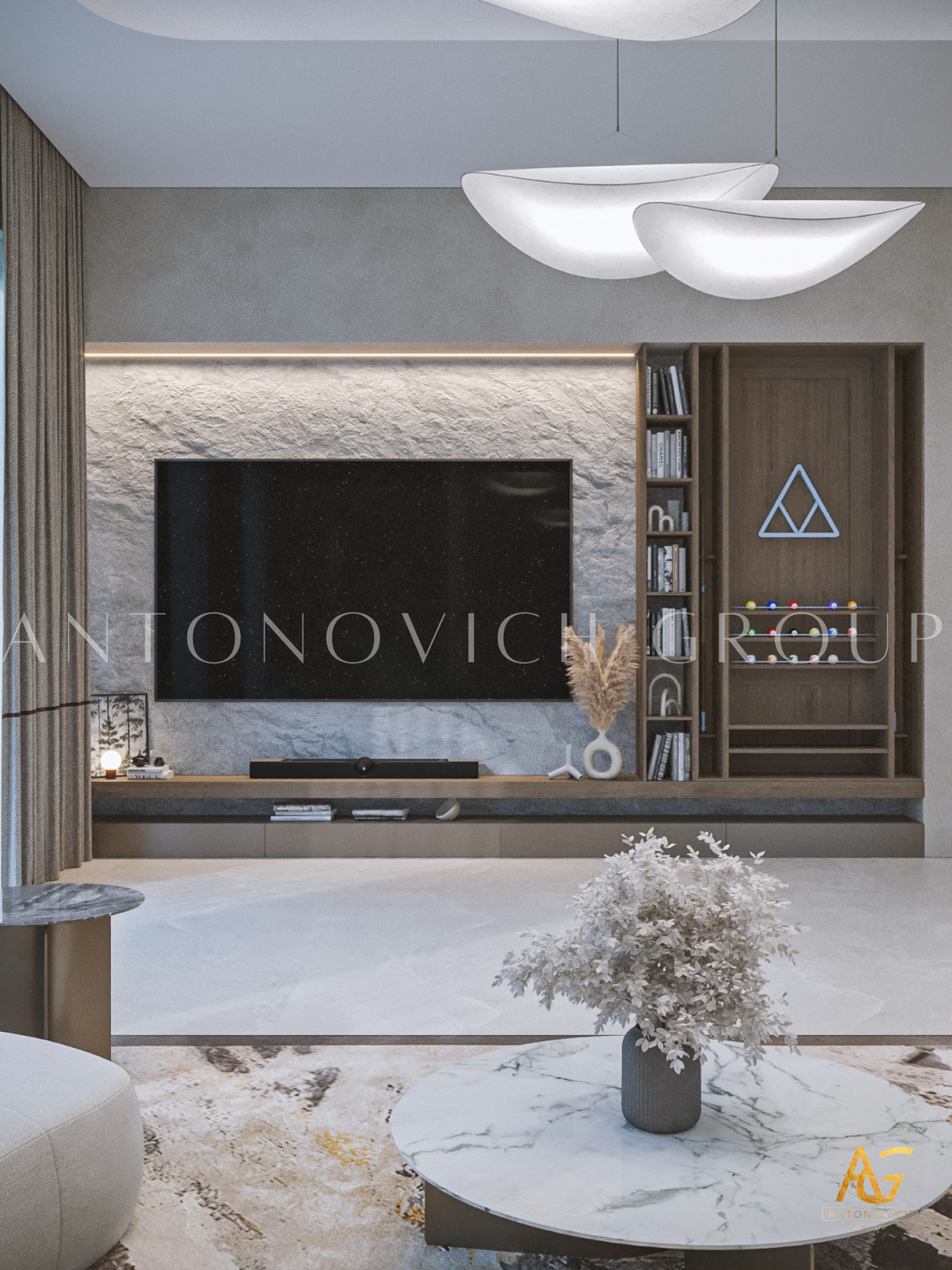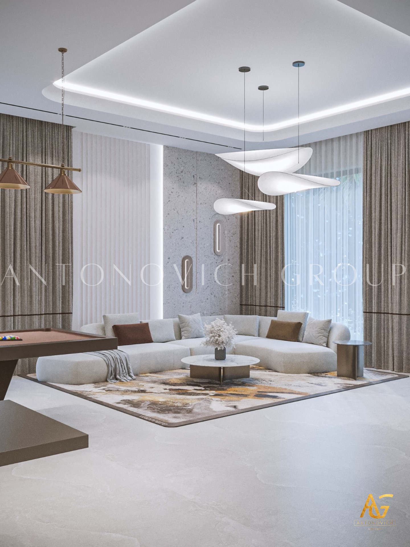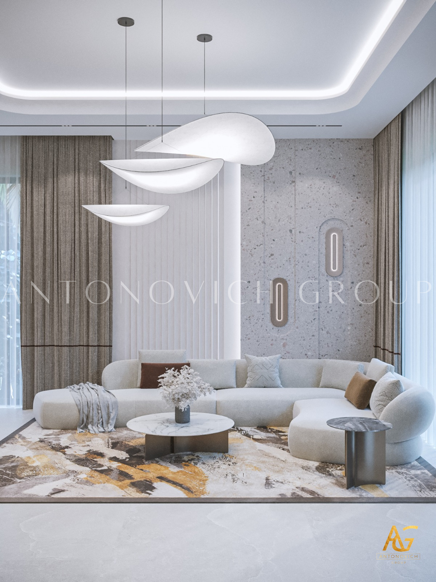 Concise and elegant image of the interior, which interior designers Dubai offer, perfectly reflected the wishes of all the owners of the luxury apartment. To create a dream interior, in this project a modern style with unique original solutions fit perfectly. The cozy living room differs with absolute harmony, cozy mood and gentle appearance. The ease and tenderness of the interior is based on pleasant pastel shades. A large window curtained with translucent milky tulles is supplemented with noble silk curtains. Upholstered furniture is in cream-colored textiles. And it repeats the soft natural carpet in the middle of the room. The ceiling design in the style of high-tech perfectly fits in this cozy, uncluttered interior. The ceiling is decorated with a deep niche and modern steel-colored spotlights. Living room interior design is full of bright accents. One of these beautiful accents became a coffee table, as well as a volumetric 3D panel of cocoa with milk shade. Living room design continues dining area laconically. Stylish furniture and modern fireplace set the basis for a cozy and warm mood. No less harmoniously modern kitchen fits into the interior. Behind discreet glossy facade the most modern storage systems and the latest technology are hidden. The elite status of the interior is underlined with noble marble that interior designers Dubai used in countertops and flooring decor. Apartment design in Dubai has a bold and daring character, as well as unique and luxurious features.