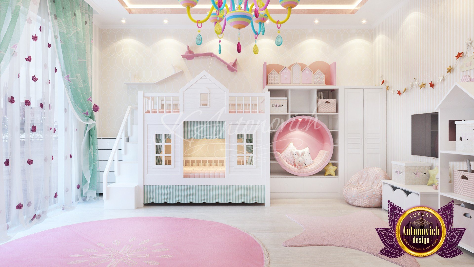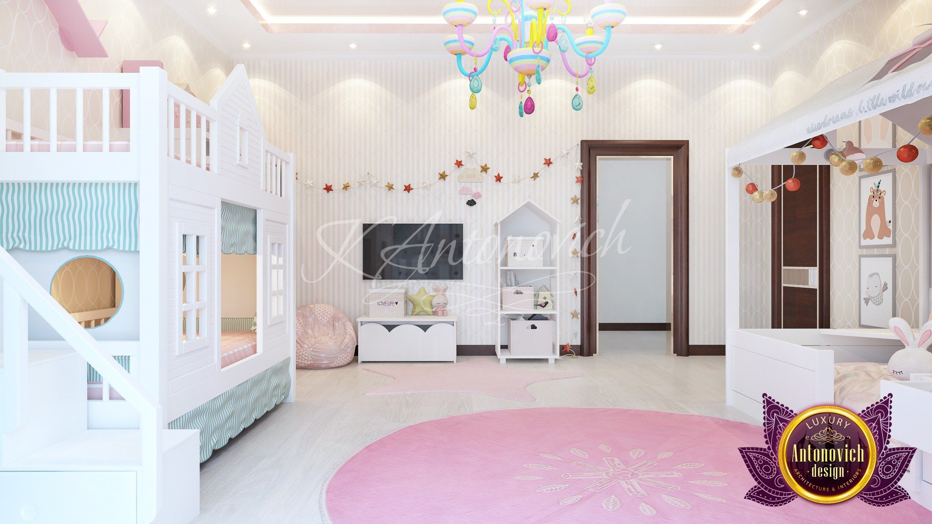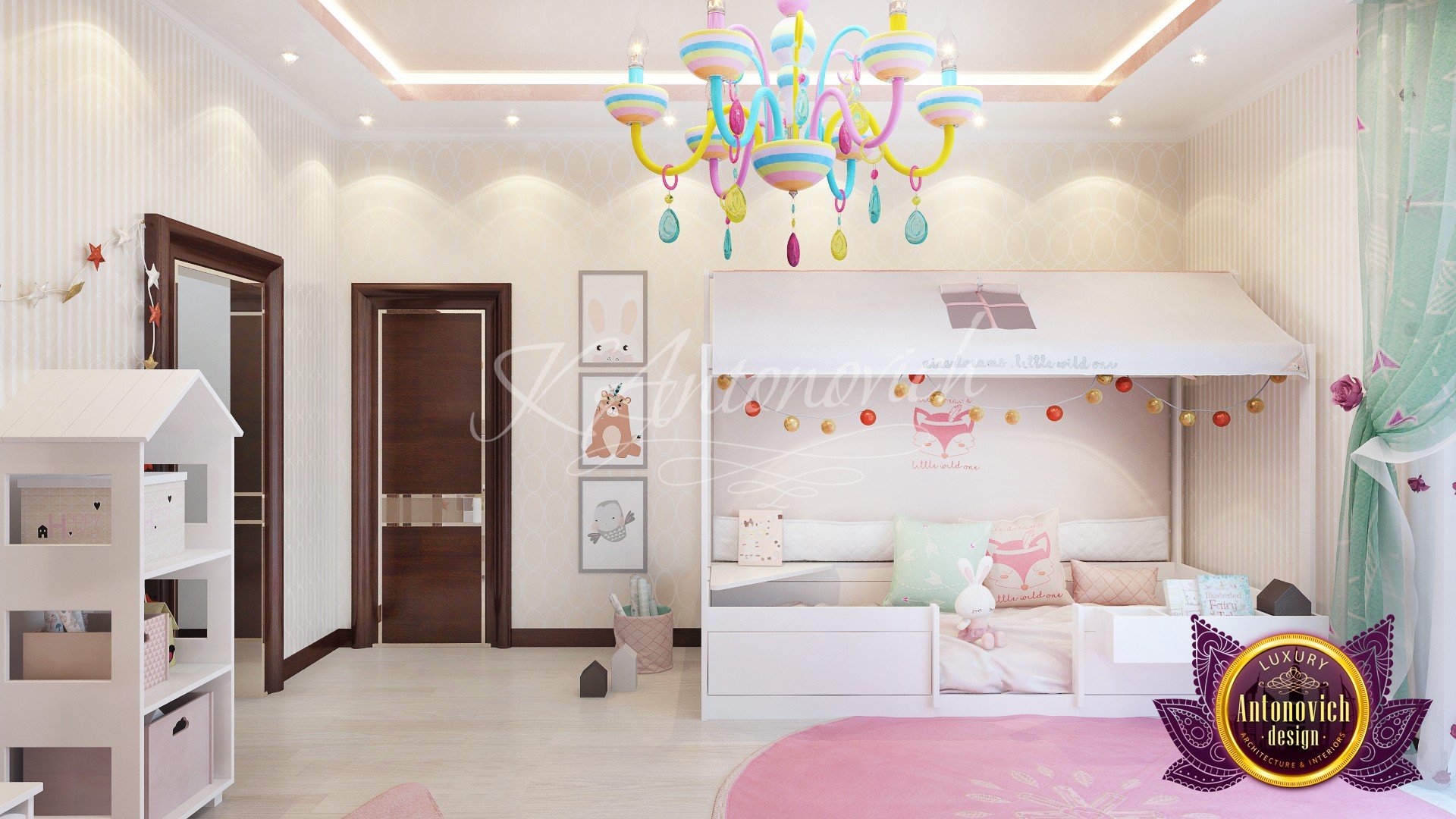Children have used their bedrooms not only for sleeping but also for studying playing and sometimes just resting and lounging around. Our team follows the lifestyle and character of every child before we start designing their rooms. Our top designer Katrina Antonovich is very keen with details. The team of highly knowledgeable professionals knows how to apply a stylish, practical, cozy and comfortable design – our selection of children’s bedroom design ideas will keep your children happy. When it comes to children’s bedroom decor, white is mostly the best option for the base color, these create an airy room and it is easier to design it with playful details to add warmth and fun details. This Luxury Antonovich Design’s bedroom design has a sweet princess bed frame made with special wood that is naturally elegant. The bedroom’s storage space is made with built-in pullouts under the bed. We also added a shelf with stylish storage boxes to help your children develop their initiative in taking care of their things by putting away clutter after playing. This bedroom can be your children’s bedroom for years because it is perfect for toddlers to pre-teenagers. We developed a sense of balance by adding in pastel hues soft textures, fun wallpaper, and contrasting prints. These elements make the space more interesting without making it look too over coordinated.CHILDRENS SANCTUARY