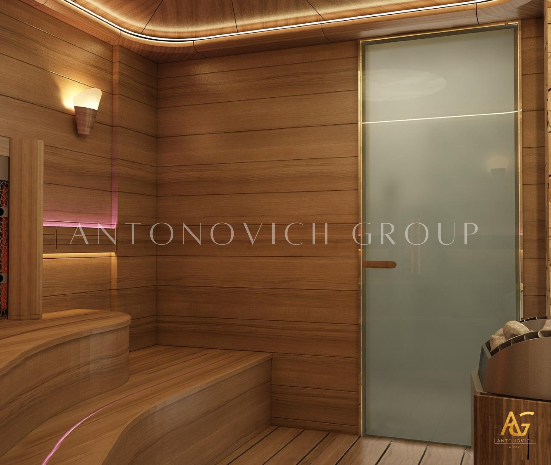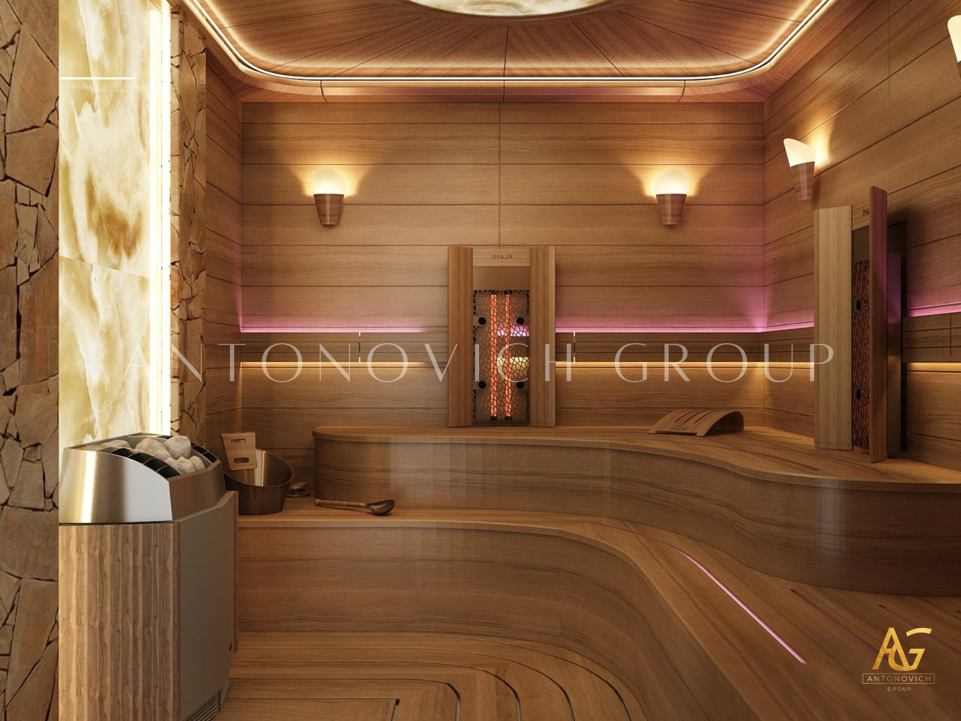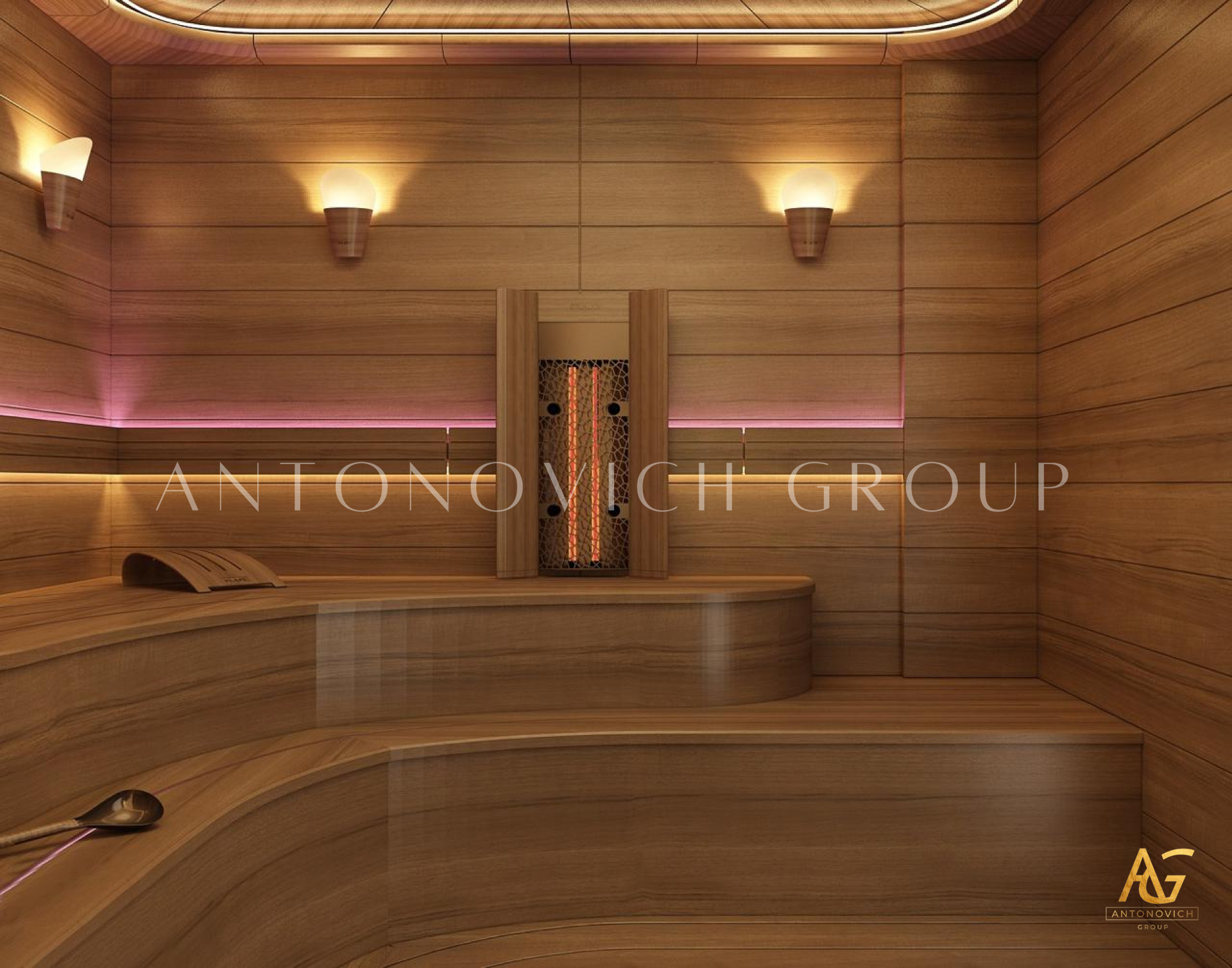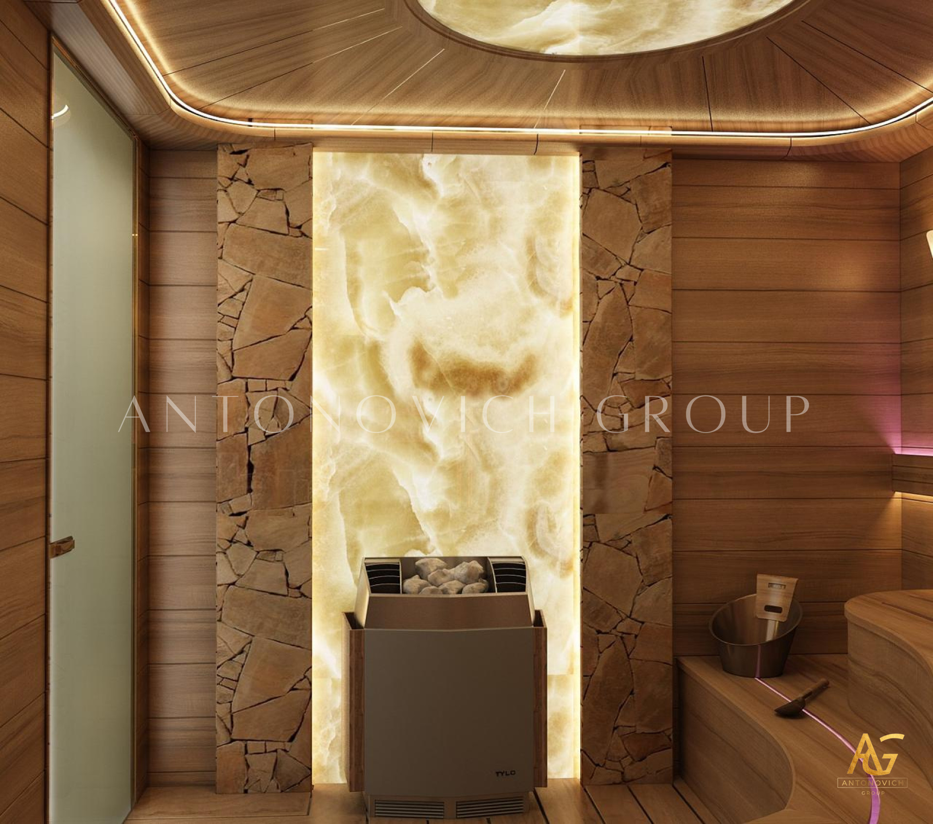 At Antonovich Group, we understand the importance of a well-designed sauna that seamlessly blends with your villa's overall interior theme. Whether you desire a traditional Finnish sauna, an infrared wellness zone, or a customized steam room, our expert designers craft bespoke solutions tailored to your preferences. We ensure that every sauna interior meets the highest standards of aesthetics and functionality, delivering an unparalleled relaxation experience.