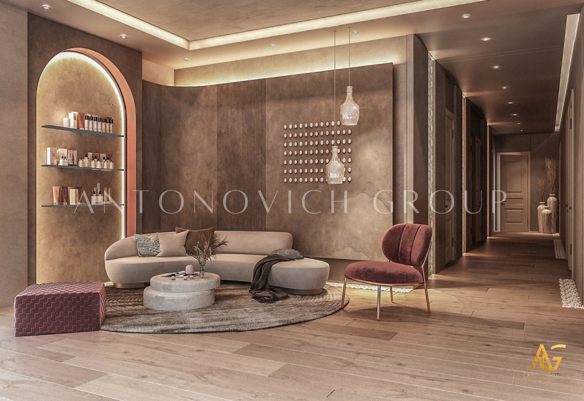 In every section of this luxury property design in Dubai, there are refined accents and lovely touches. The contemporary designs of the Dubai property are all of the greatest quality and have an exceptional flare. In order to achieve the most attractive Luxury spa design in Dubai, Luxury Antonovich Design, Interior Design consulting Dubai spa, has guaranteed that the colors in this current Private spa interior Design Dubai work well together. From floor to ceiling, the magnificent Spa interior design of Dubai interior contains wonderful details.