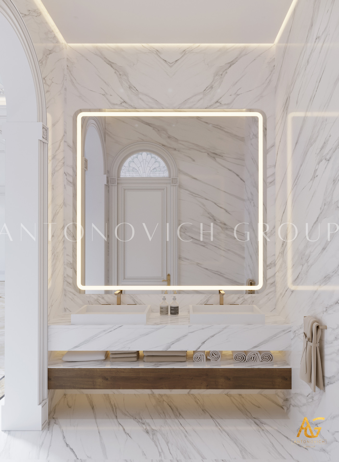 Every bathroom designed by Antonovich Group begins with a personalized concept, crafted to match the client’s preferences and lifestyle. The design team carefully selects the finest materials—such as Italian marble, onyx, natural stone, and gold accents—to achieve a refined and harmonious look. Custom-built vanities, designer fixtures, and artistic lighting complete the design, creating a spa-like ambiance that promotes relaxation and indulgence.