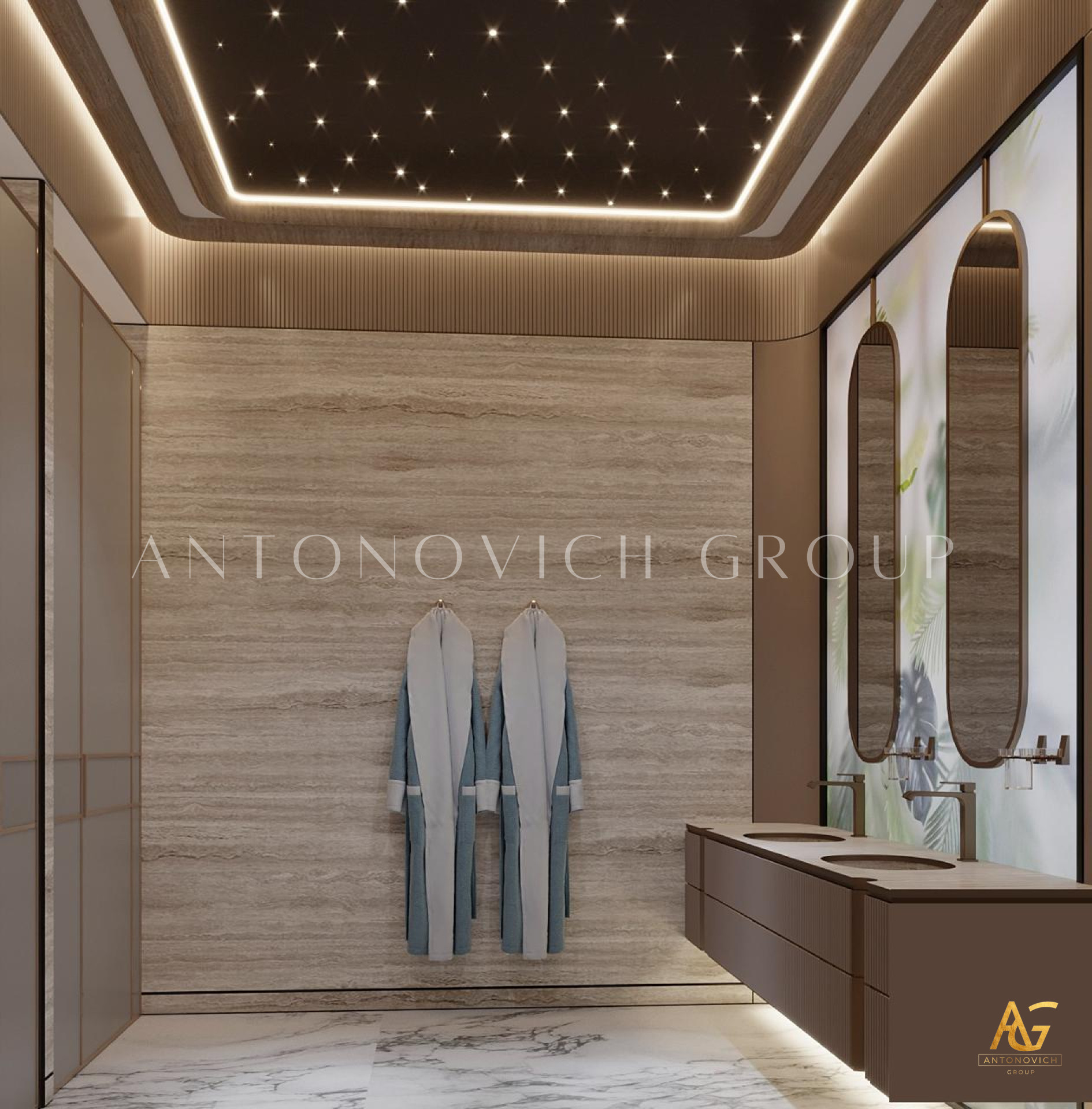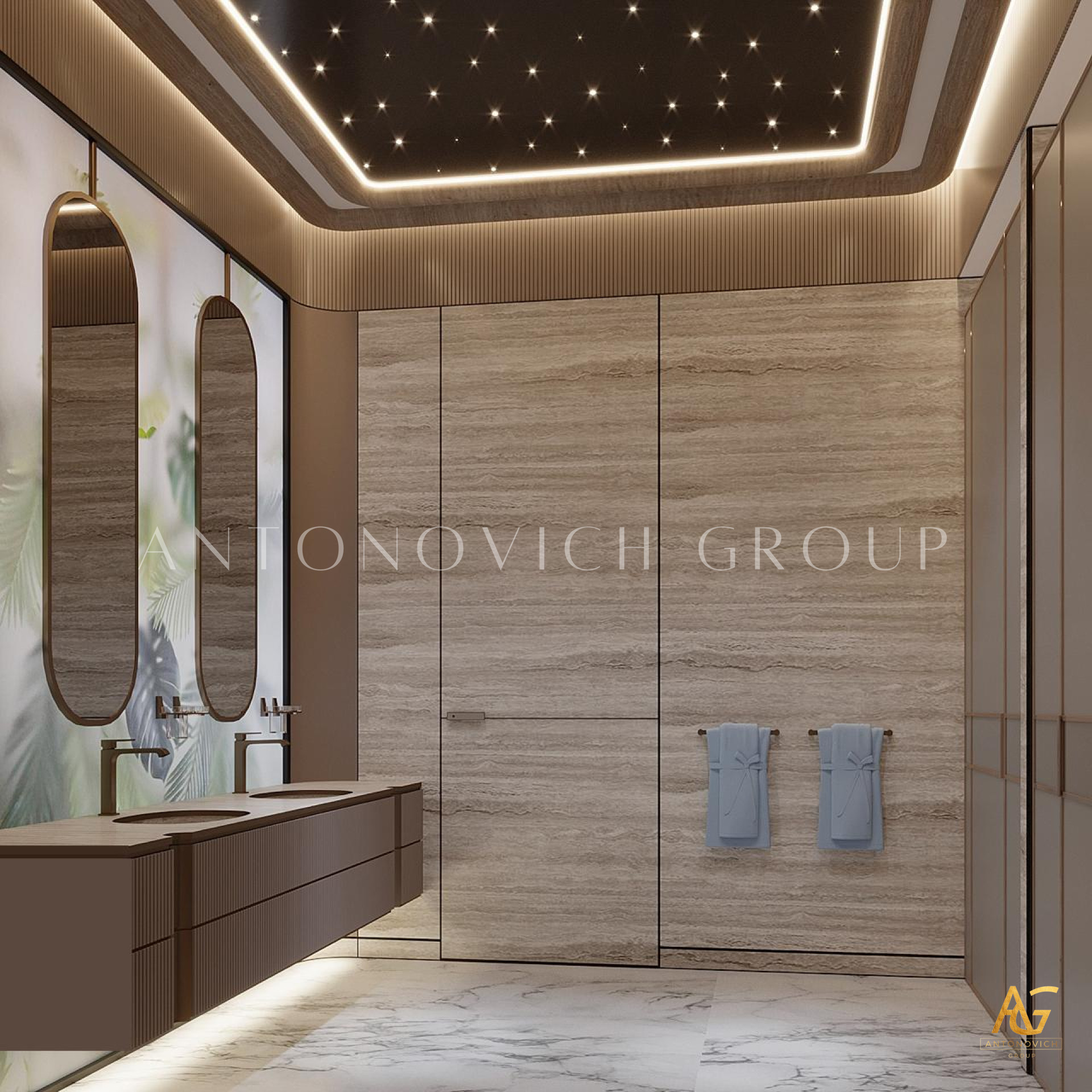 To emphasize the luxury of the interior in every moment, the designers offered a luxury version of the decor bathroom.This is a classic style with accents of Baroque and Rococo. The saturated decor is inherent for the walls, floor, and a ceiling. The main material for the decor - noble marble of beige shades with natural veins. This material is ideal for this kind of premises, thanks to its practicality and functionality.modern bathrooms on Luxury Antonovich Design is always a combination of unique solutions and high-grade materials.Floor decorated with a carvings of natural stone dark rocks.The decoration of the walls, along with marble, are present art paintings with romantic sea views. They are complemented by pilasters with stucco capitals and exquisite lamps. The splendid idea became the ceiling decor. The dome, which is also decorated frescoes. Additional blue light creates the perfect illusion of a blue sky. Doors and furniture items made of wood inlaid with a carved decor with gilding.