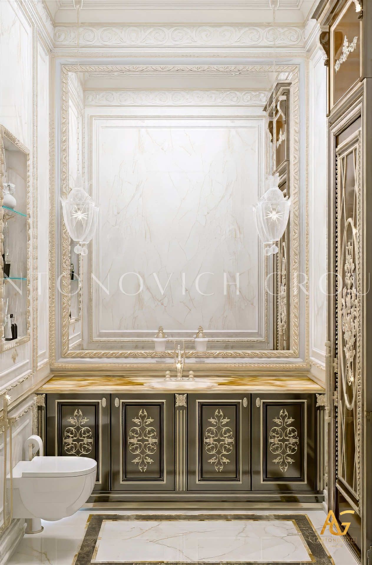 Modern contemporary with so many glamorous details and furniture designs. The gorgeous theme of this luxury bathroom interior design is created with so much class and elegance. The theme of the bathroom is modern contemporary and Luxury Antonovich Design has made sure that every corner of the luxury bathroom interior design is beyond beautiful.