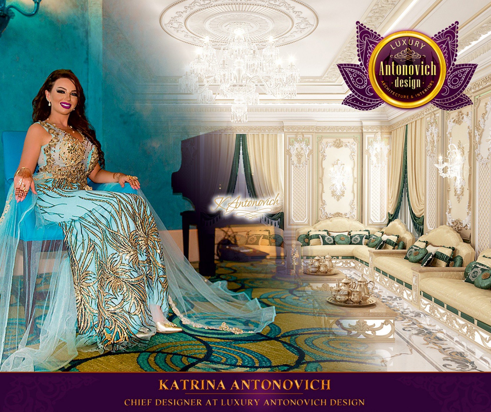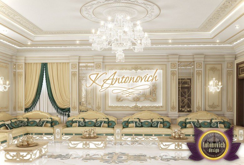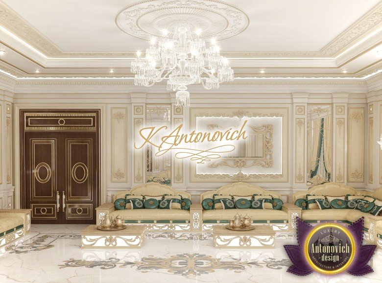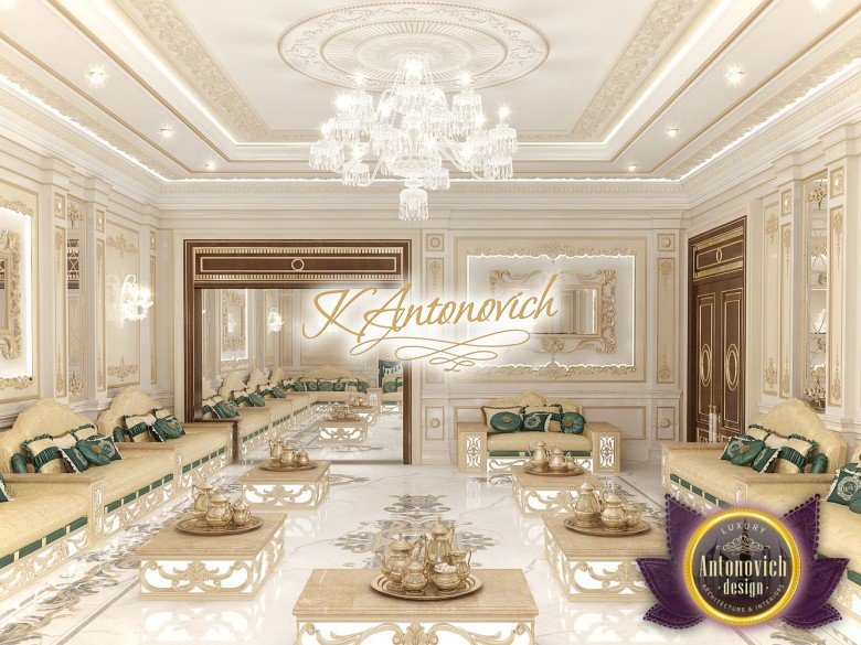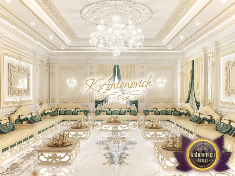 Hospitable luxury for pleasant moments of relaxation literally poured into beautiful apartments Majlis. Classic majlis of Luxury Antonovich Design design studio impresses with its unique features of the beauty. Saudi Arabia Interior Designers offering to customers the best unique solutions in the Luxury decoration for Majlis. In this wonderful project blends three stylistic directions. It's oriental style, elegant features of classics and art deco accents. In this luxurious villa in the UAE, majlis owners will proudly welcome guests. And each guest will feel welcome in this house. Each feature of the Majlis interior design emphasizes hospitality ownerы, theirs excellent taste and the desire to provide its guests with the best of everything. The gentle milk-creamy palette of shades look great accents of dark green silk. light-colored marble on the floor with the natural veins decorated with swirls of carved patterns. These motifs interior designers continue in the decoration of furniture. Cute coffee tables with marble tops are illuminated from the inside. It gives the interior an additional charm of luxury and beauty. Soft sofas upholstered in cream-colored precious textiles are arranged around the perimeter walls. The interior of the Majlis can accommodate quite a large number of guests. Wall decor and ceiling inherent motives of noble classical style. Boiserie on the walls is filled with decorative plaster of the texture of silk, mirrors and the elements of the stucco decoration.